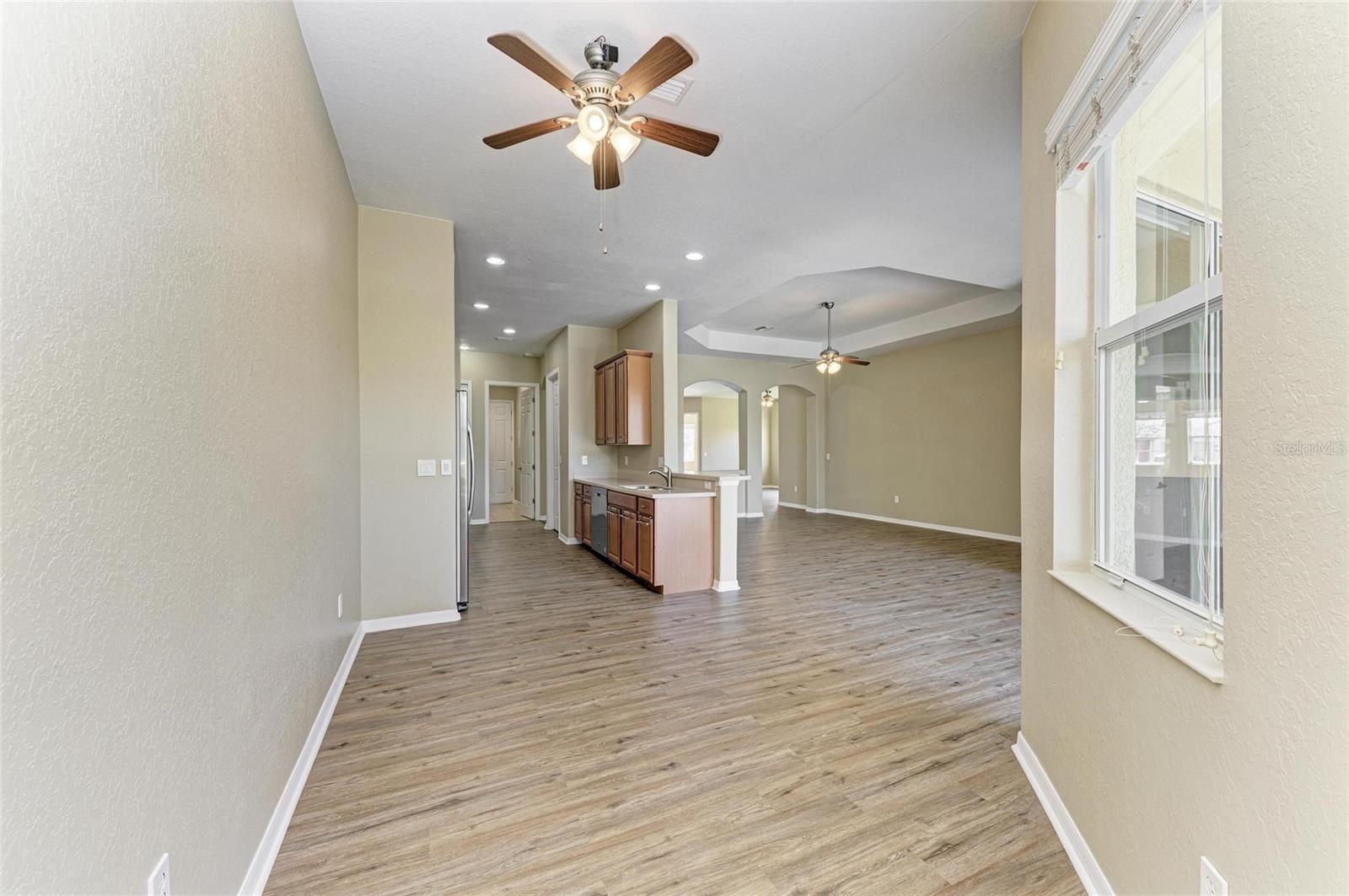 - Ceiling Fan(s), Eat-in Kitchen, High Ceilings, Kitchen/Family Room Combo, Living/Dining Room, Open Floorplan, Main Level Primary, Solid-Wood Cabinets, Stone Counters, Walk-In Closet(s), Window Treatments