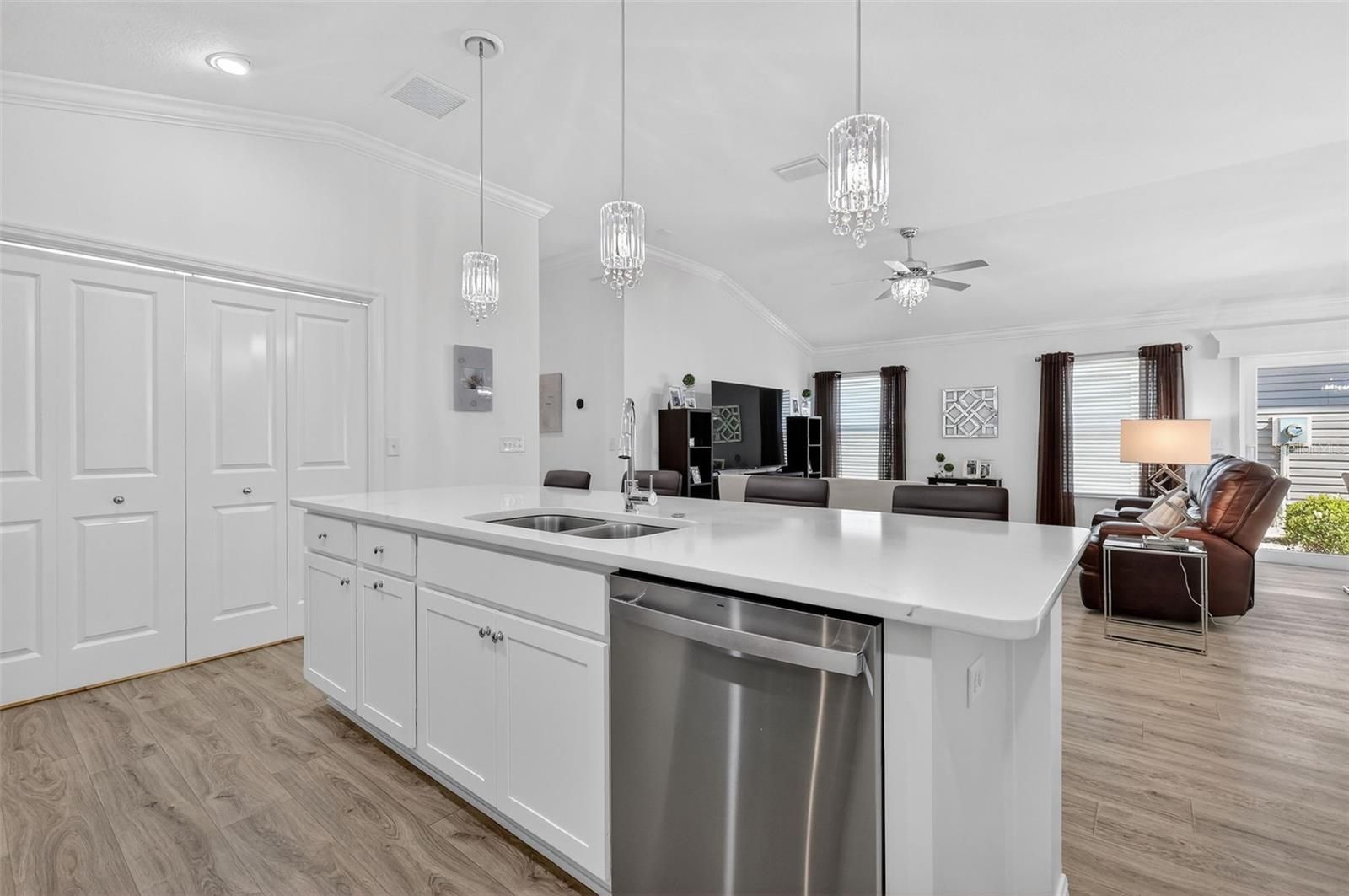 Welcome to this MAGNIFICENT 3/2 Emerald III villa with 2-CAR GARAGE + GOLF CART GARAGE and a REAR PRIVACY WALL—perfectly tucked away in the beautiful Haley Villas in the VIBRANT Village of DeLuna! Built in 2022, this METICULOUSLY MAINTAINED, nearly NEW home delivers luxury, contemporary finishes, and the peace of mind you’re looking for. PAVER edged, LOW MAINTENANCE, STONED landscaping beds invite you in to the OPEN-CONCEPT layout where high VAULTED ceilings create an airy, expansive atmosphere that feels bright and welcoming from the moment you enter. This home is packed with upgrades, including beautiful wood-grain VINYL FLOORING, GORGEOUS MODERN lighting, and CUSTOM CROWN MOLDING THROUGHOUT. The STUNNING chef’s kitchen is a true centerpiece, showcasing modern WHITE SHAKER cabinetry, QUARTZ countertops and backsplashes, STAINLESS appliances with GAS cooking, BUILT-IN PANTRY and DESK, and a LARGE CENTER ISLAND with EAT-IN breakfast bar adorned with WAINSCOTING—perfect for gatherings and casual dining. From the dining area, sliding glass doors with a CUSTOM CORNICE, open onto a SIDE PATIO—a wonderful year-round outdoor oasis. Back inside, the luxurious primary suite boasts a VAULTED ceiling, generous WALK-IN closet, and a beautifully appointed en-suite bathroom with DUAL sinks, WHITE SHAKER cabinetry, WALK-IN shower, LINEN closet, and separate water closet. Bedroom two offers a VAULTED ceiling and built-in closet. The second bathroom features a WHITE SHAKER vanity and tub and shower combination. The third bedroom has a built-in closet and is located near the foyer offering an ideal space for a quiet home office or additional sleeping area. A CONVENIENT, INTERIOR LAUNDRY closet features additional shelving and a nook for EXTRA STORAGE needs. One of the standout features of this home is the TWO separate garages—a RARE FIND in villa living! You’ll enjoy a FULL 20’x20’ 2-CAR GARAGE plus a 10’x 9’ SIDE-LOAD GOLF CART GARAGE boasting a utility sink. Together they provide exceptional storage, hobby/workspace options, and plenty of room for vehicles, golf carts, and gear! DON’T MISS YOUR OPPORTUNITY to make this INCREDIBLE HOME YOUR OWN! The Village of DeLuna offers easy access to a plethora of nearby attractions including Brownwood Paddock and the NEW Eastport Town Square with live nightly entertainment, shopping, and dining! You can also, enjoy live music under the oak trees at Edna's on the Green. Nearby pools and recreation facilities include: DeLuna (only 700ft away), Waterlily, Cattail, and Everglade; Golf enthusiasts appreciate the nearby Lowlands, Loblolly, and Longleaf Executive Golf Courses. For added fun, there’s also Richmond and Marsh View Pitch and Putts. Miles of scenic walking trails surround the area, including the Hog Eye Preserve. Easy access to the Water Lily Bridge and US-301 ensures swift travel throughout The Villages, with convenient connections to the Turnpike and I-75. The easily accessible Magnolia Plaza Shopping Center also offers an abundance of restaurants, shops, and more! PLEASE WATCH OUR WALKTHROUGH VIDEO of this FABULOUS CONTEMPORARY HOME in a FANTASTIC LOCATION and call today to schedule your Private Showing or Virtual Tour!
