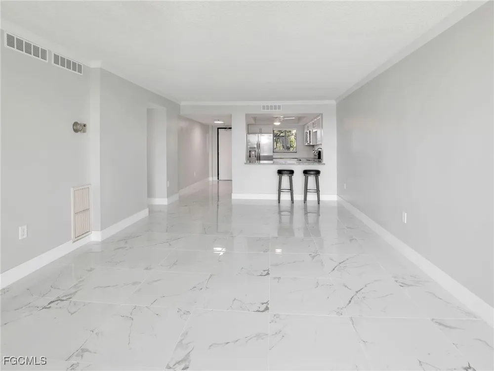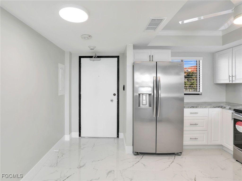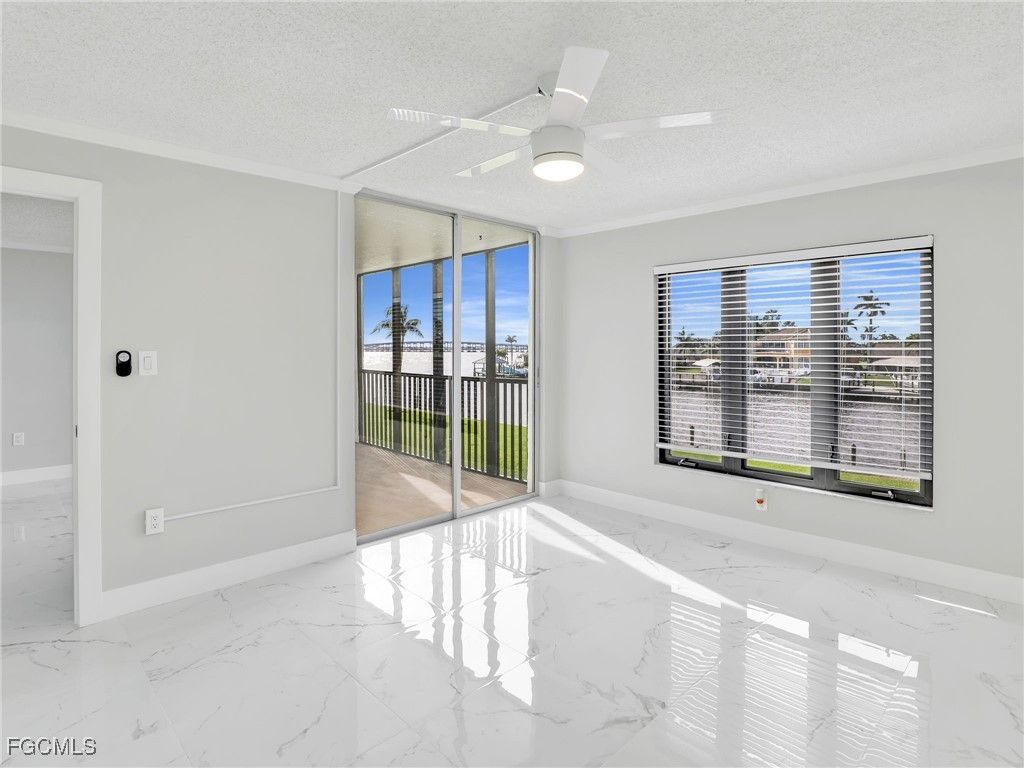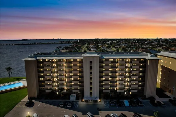 Must see river view from this unit! Enter this fully updated unit featuring a bright, beautiful kitchen with lots of natural light, white cabinets, granite countertops, new stainless-steel appliances, tray ceiling & fan. There is a breakfast bar & room for a dining table as well. The entry has space for a decorative side table or cabinet. Gather in the great room, open concept to the kitchen area, or relax in the screened lanai to enjoy the river view. The primary bedroom also has access to the lanai, a ceiling fan & an ensuite bathroom w/walk-in shower & beautiful vanity plus lighted mirror. Bring your guests as there is a 2nd bedroom & guest bathroom. The entire home has gorgeous tile flooring, crown molding, new light fixtures, sliding closet doors & paneled doors. Brand new air-conditioning unit 2025! There is no shortage of green space & activities to enjoy the outside of this property, from the sparkling pool to the shuffleboard court. A wonderful riverfront City park is just down the street. Close access to downtown Cape Coral shopping & dining, plus near to the bridge to Ft. Myers. You need to see this unit to fully appreciate the wonderful, quality upgrades!