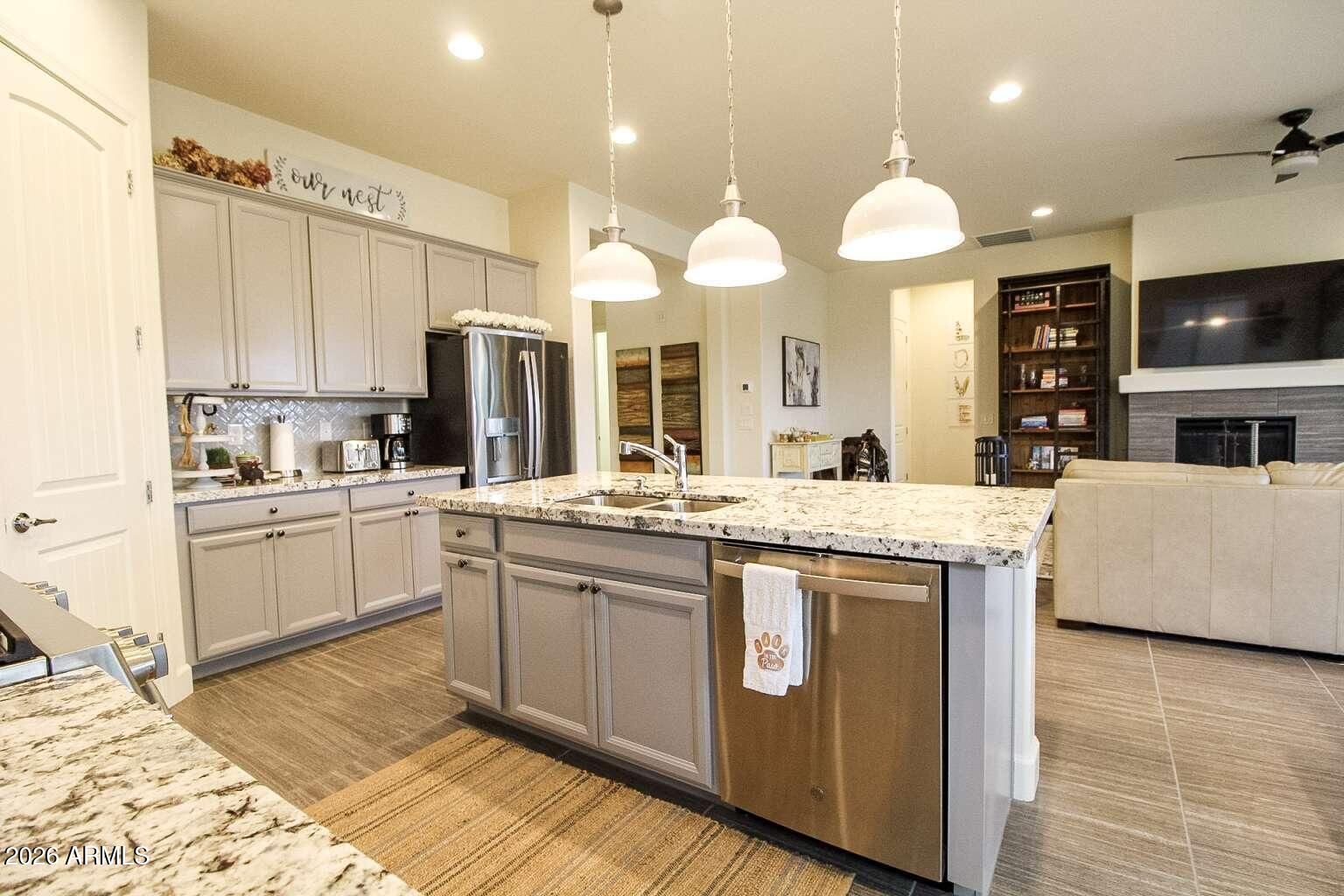 Exceptional single-level home in the highly desirable Wickenburg Ranch area. This beautifully maintained 2-bedroom, 2-bath residence offers approximately 1,800 sq ft of thoughtfully designed living space with an open-concept layout and abundant natural light. The spacious great room flows seamlessly into the kitchen, making it ideal for everyday living and entertaining. The kitchen includes modern appliances, a built-in microwave, double ovens, and generous storage. The primary suite provides privacy and comfort with an en-suite bath and dual vanities. A 3-car tandem garage offers ample space for parking and storage. Enjoy outdoor living from the covered patio and backyard, perfect for Arizona living.