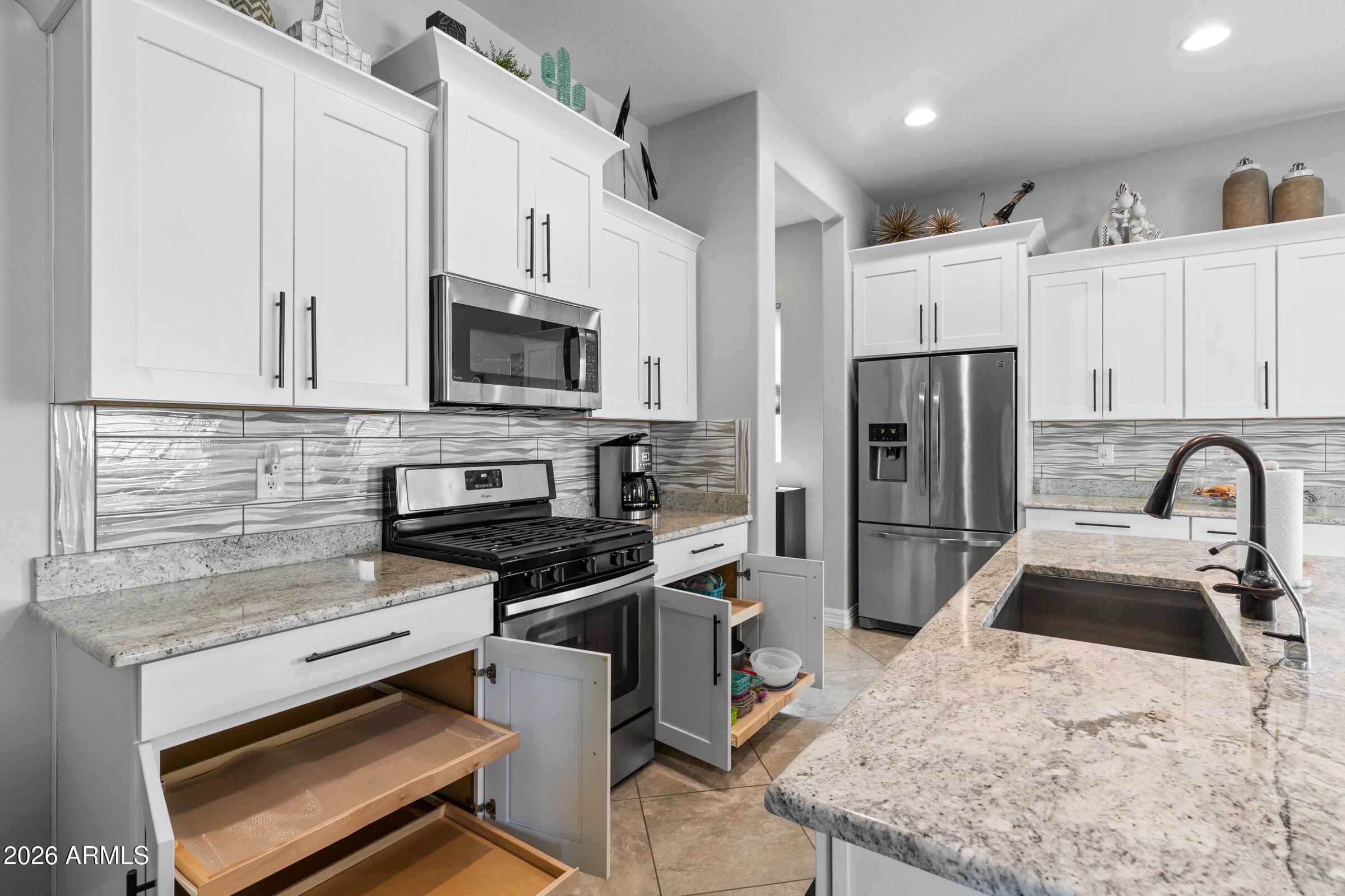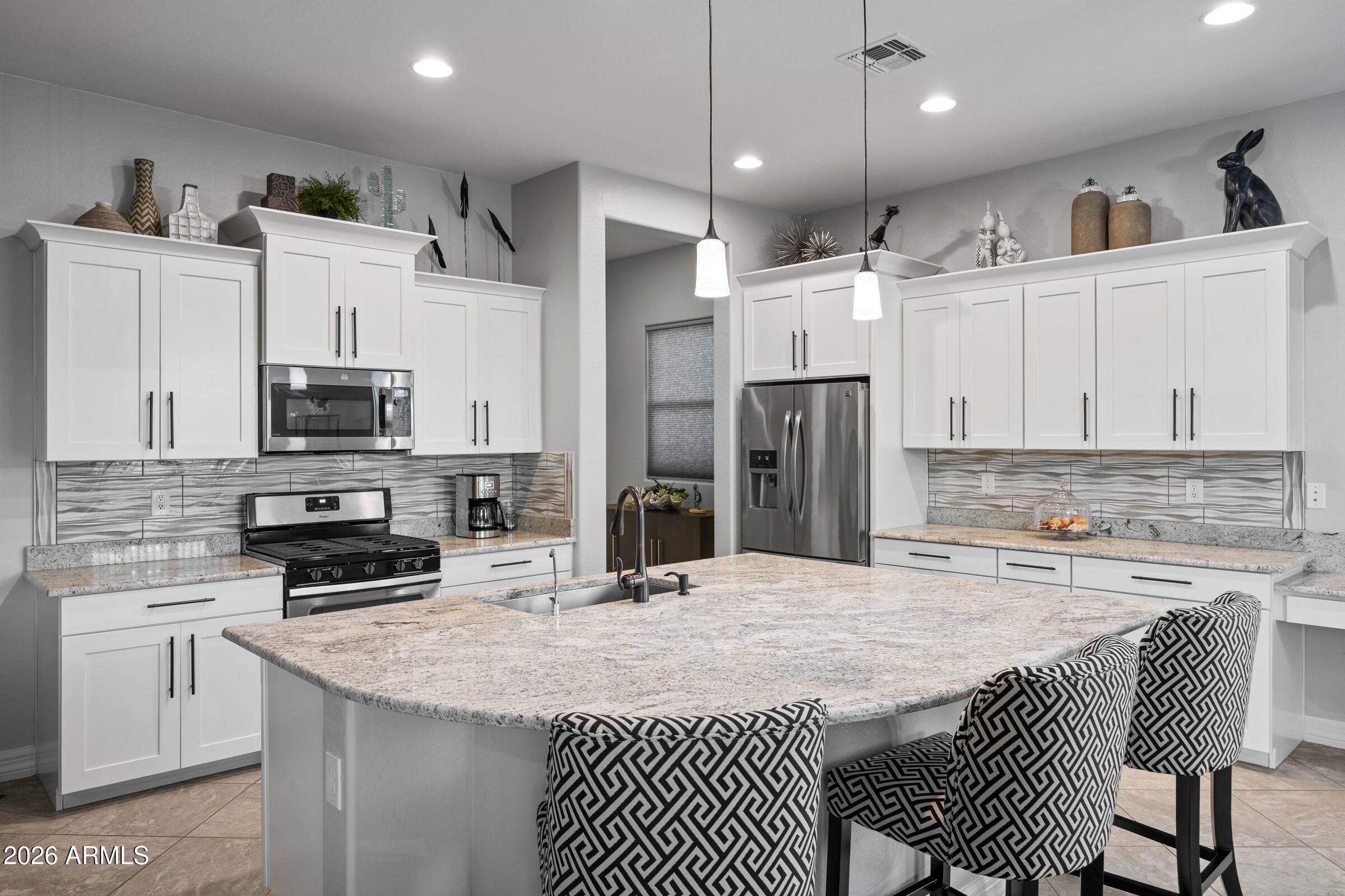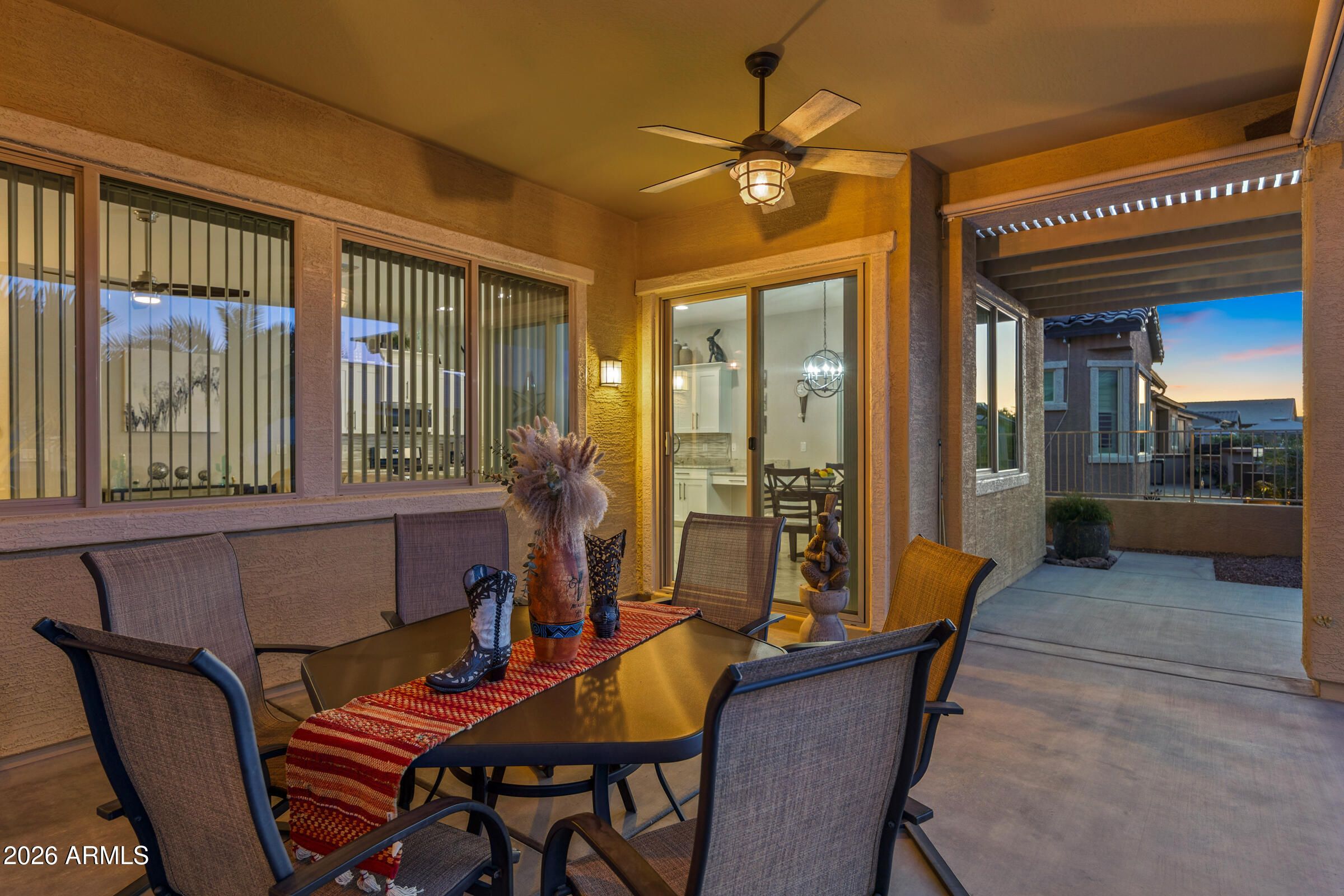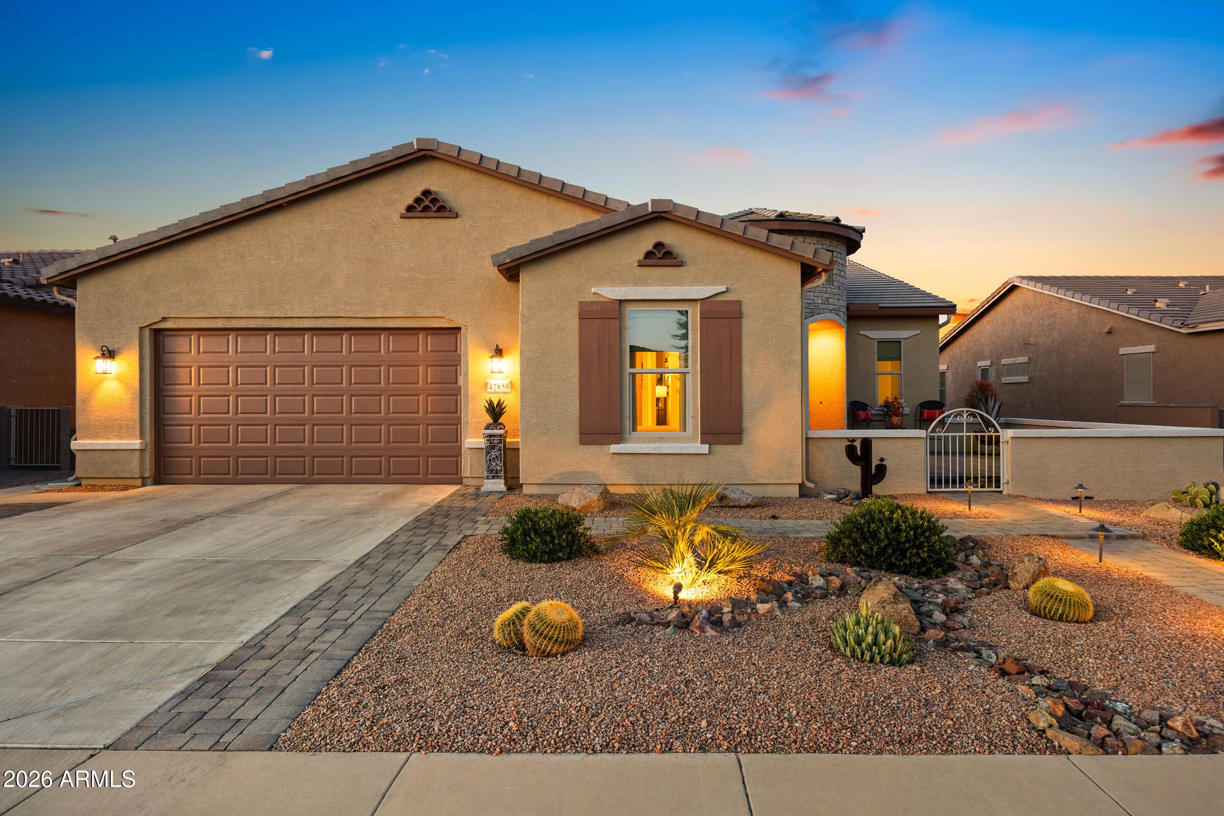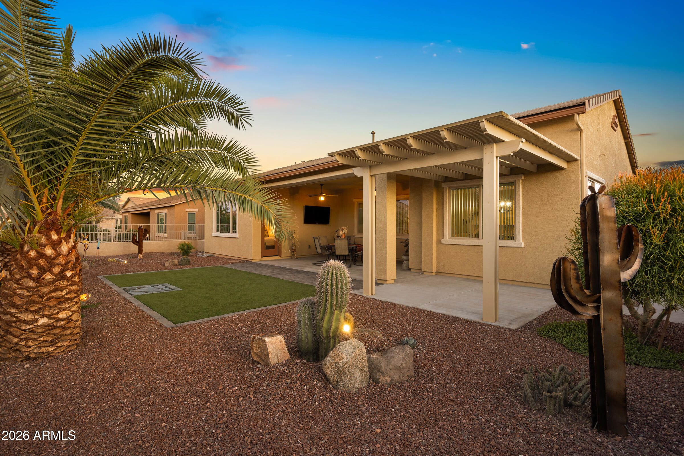 Immaculate Franklin floor plan in the award-winning Active Adult community of Province! This beautifully maintained home showcases gorgeous white kitchen cabinetry with crown molding, granite countertops, custom tile backsplash, and stainless steel appliances including a gas range. A massive island, double pull-outs, and a generous walk-in pantry make this kitchen as functional as it is stunning. Soaring 10' ceilings, 5'' baseboards, and tile throughout enhance the open, light-filled interior. The private backyard offers a covered patio, extended pergola, artificial turf, and mature landscaping, all fully fenced for added privacy. A spacious paver courtyard creates an additional outdoor retreat perfect for enjoying Arizona's beautiful weather. The oversized garage is a standout feature with epoxy floors, overhead storage, insulated garage door, exterior side door, and its own mini-split for heating and cooling. A TRANE HVAC system installed in 2024 includes a 10-year warranty and bi-annual service plan. Additional upgrades include a skylight in the powder room, double doors at the den, coffered entry ceiling, security front door, upgraded plumbing and lighting fixtures, sunscreens, gutters, exterior stone accents, insulated attic above the garage, and freshly painted exterior (2024). The spacious primary suite features an upgraded bath with dual sinks, expansive counter space, walk-in closet, and a beautifully appointed step-in shower. TV at the patio conveys with the home. Furniture available on a separate bill of sale as well as outdoor yard decor and pots.