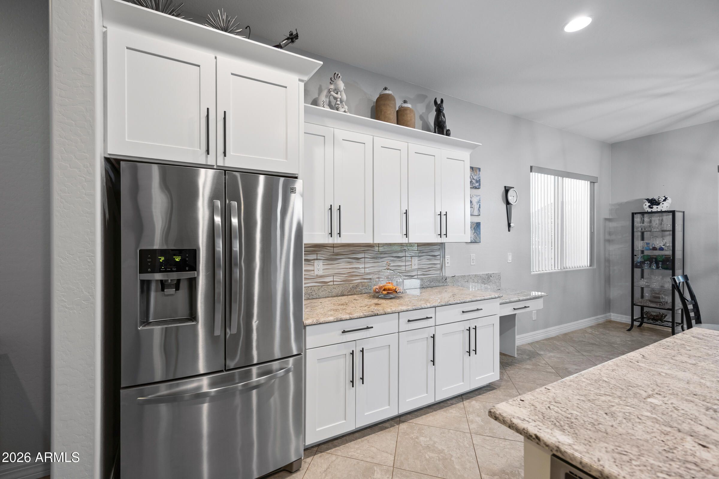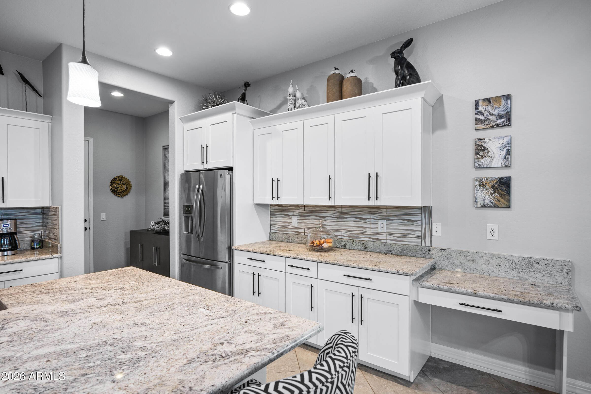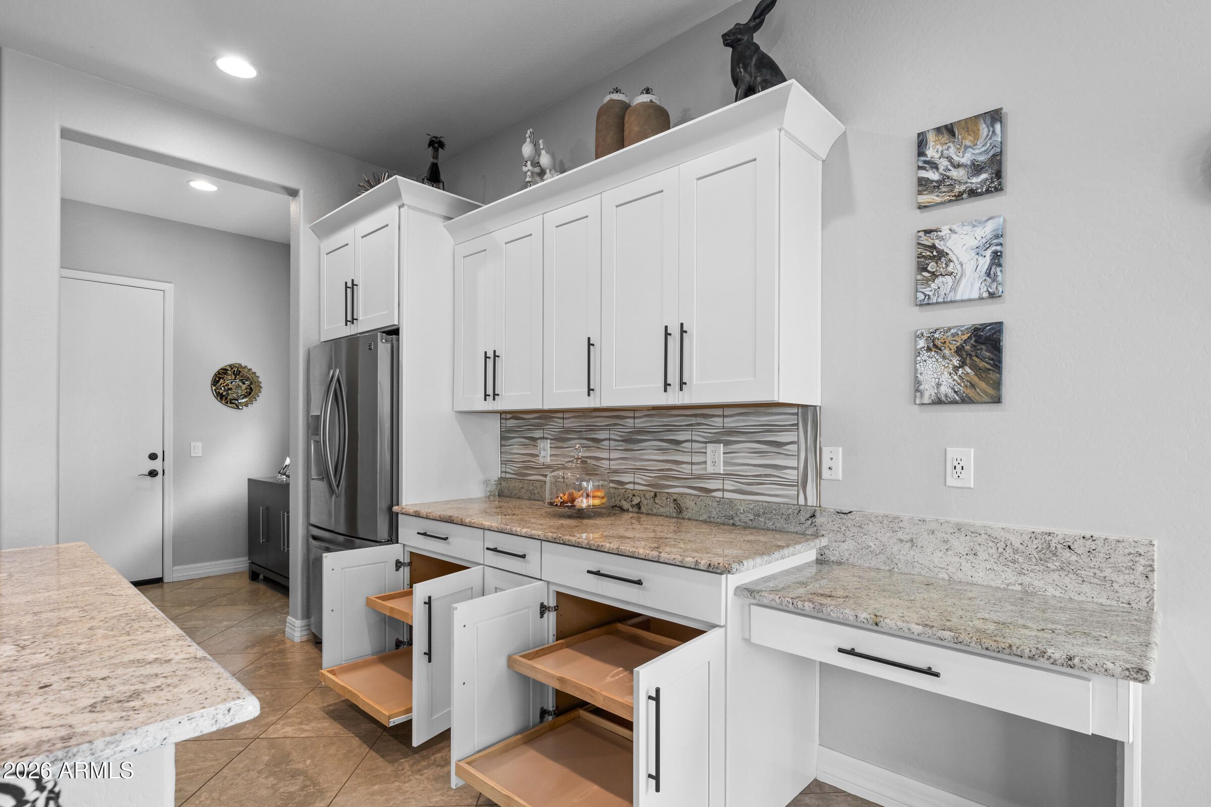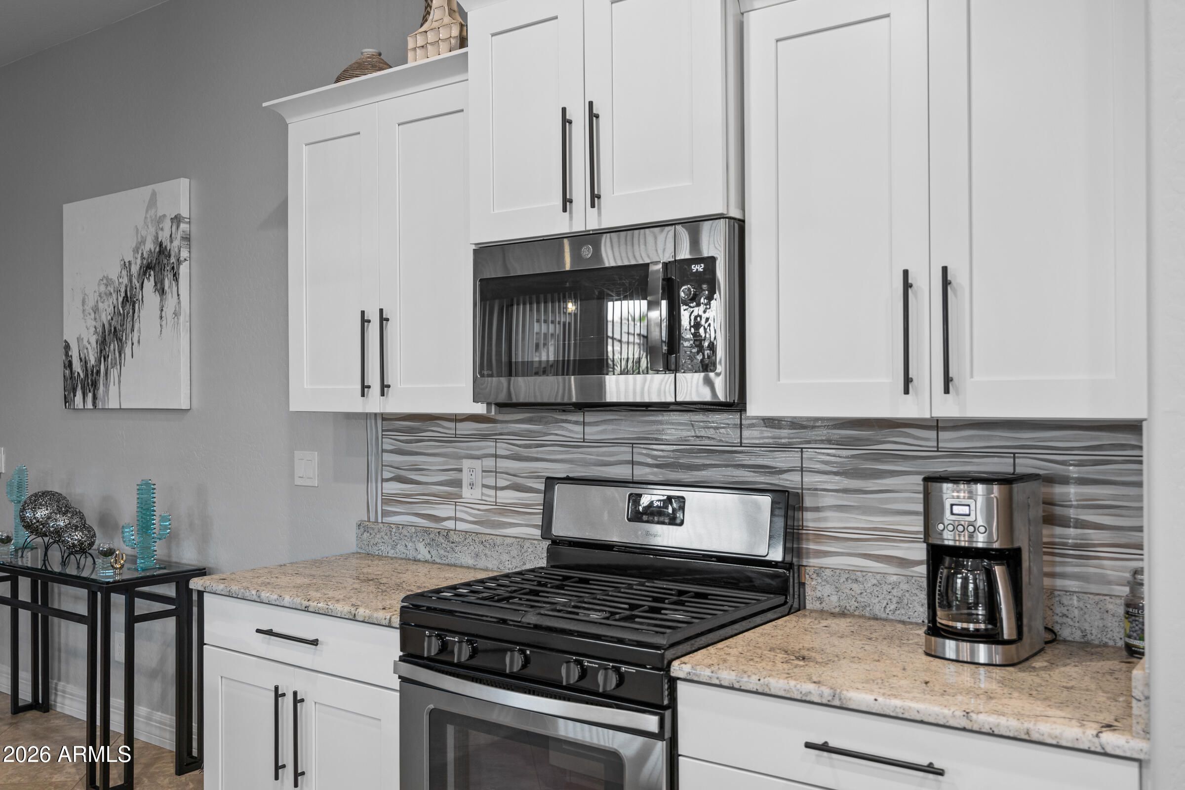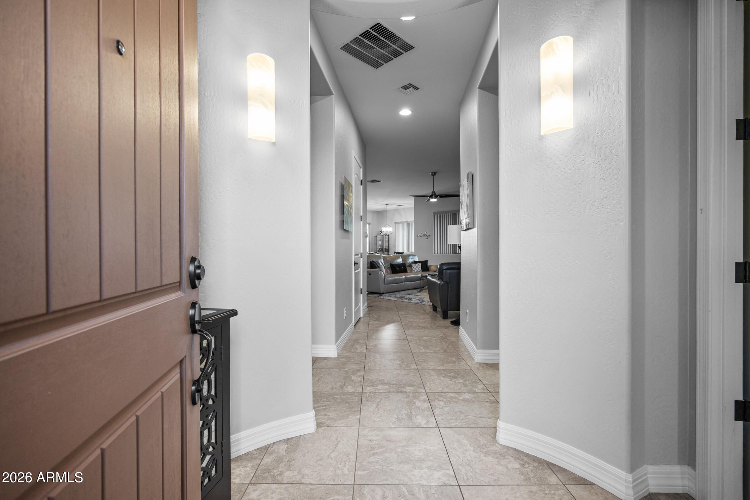 Immaculate Franklin floor plan in the award-winning Active Adult community of Province! This beautifully maintained home showcases gorgeous white kitchen cabinetry with crown molding, granite countertops, custom tile backsplash, and stainless steel appliances including a gas range. A massive island, double pull-outs, and a generous walk-in pantry make this kitchen as functional as it is stunning. Soaring 10' ceilings, 5'' baseboards, and tile throughout enhance the open, light-filled interior. The private backyard offers a covered patio, extended pergola, artificial turf, and mature landscaping, all fully fenced for added privacy. A spacious paver courtyard creates an additional outdoor retreat perfect for enjoying Arizona's beautiful weather. The oversized garage is a standout feature with epoxy floors, overhead storage, insulated garage door, exterior side door, and its own mini-split for heating and cooling. A TRANE HVAC system installed in 2024 includes a 10-year warranty and bi-annual service plan. Additional upgrades include a skylight in the powder room, double doors at the den, coffered entry ceiling, security front door, upgraded plumbing and lighting fixtures, sunscreens, gutters, exterior stone accents, insulated attic above the garage, and freshly painted exterior (2024). The spacious primary suite features an upgraded bath with dual sinks, expansive counter space, walk-in closet, and a beautifully appointed step-in shower. TV at the patio conveys with the home. Furniture available on a separate bill of sale as well as outdoor yard decor and pots.