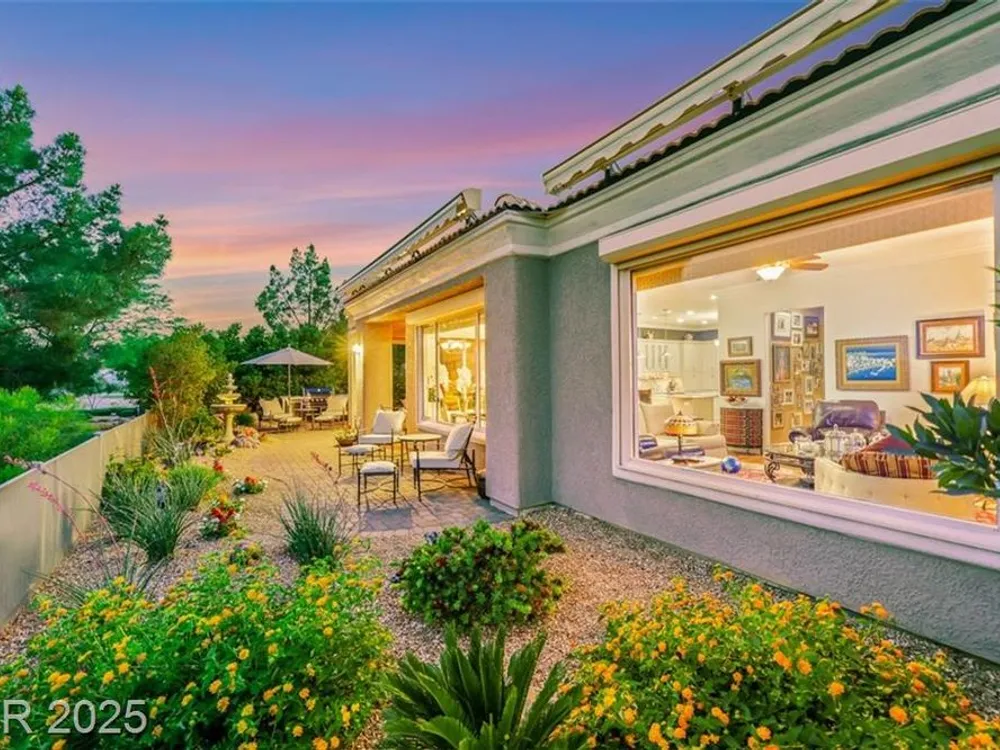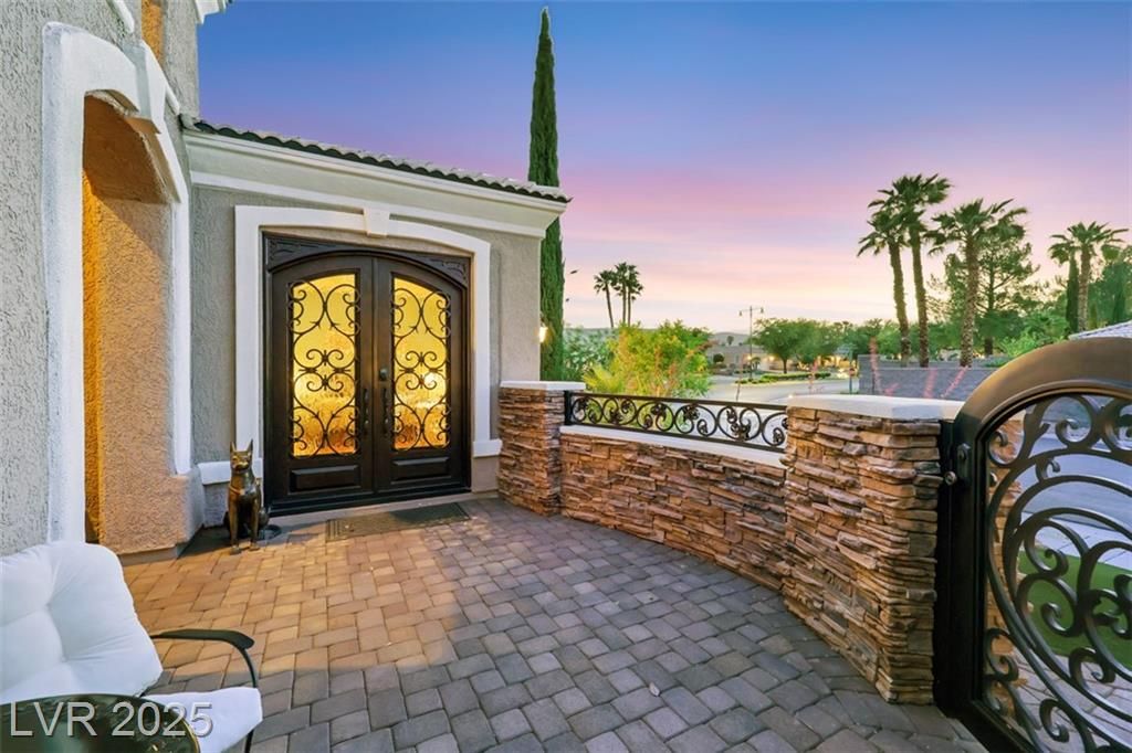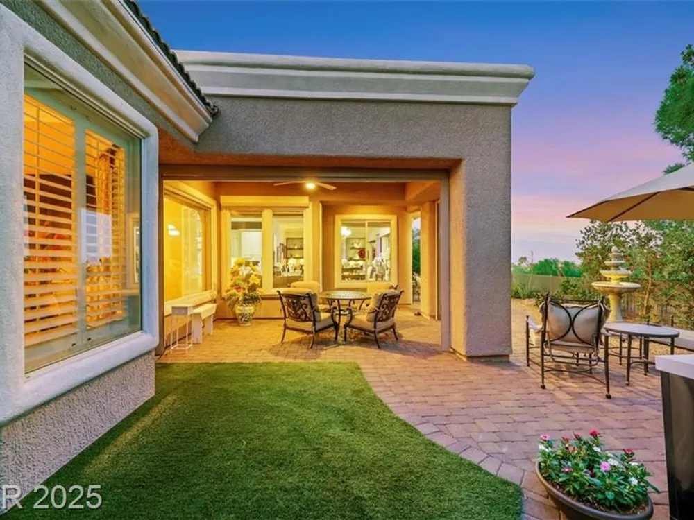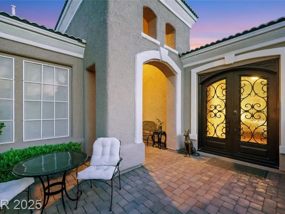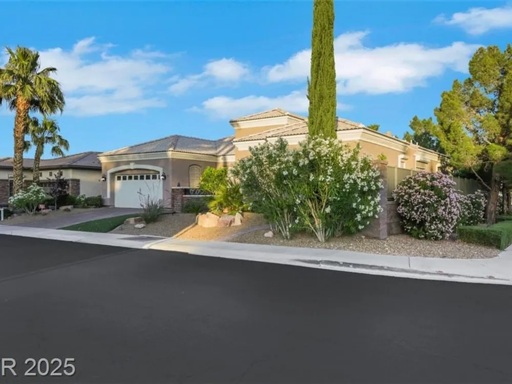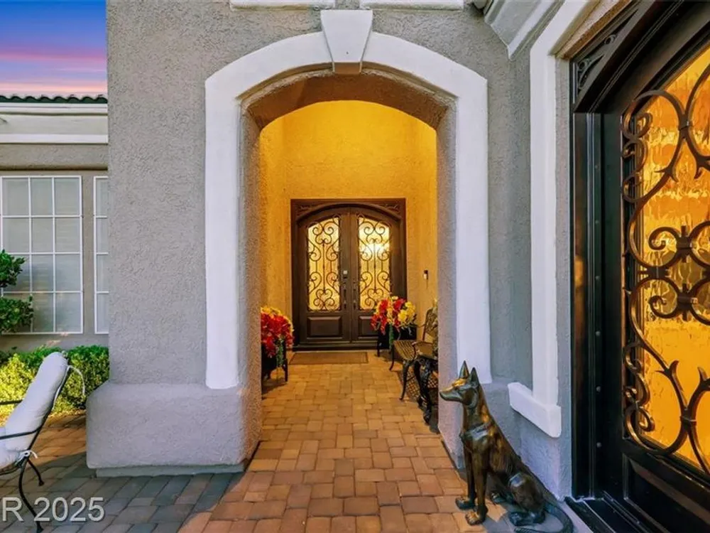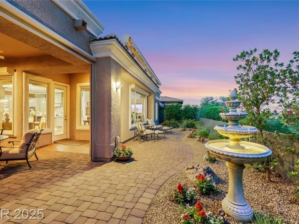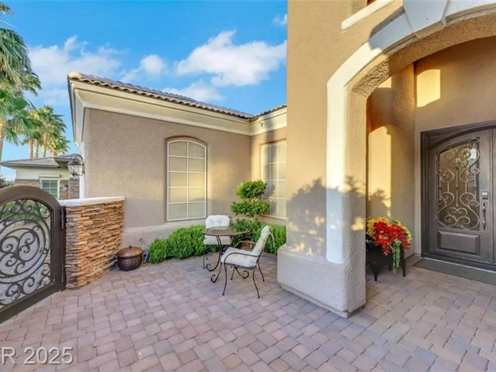 Amazing and incredible golf course property with wide open and beautiful views of the Las Vegas Strip and surrounding mountains. Highly upgraded 3 bedroom home - featuring a private casita - offers luxurious living on the golf course, nestled in the beautiful guard gated community of Siena Country Club. Minutes from the 215, casinos and shopping areas. Enter through the beautiful custom iron gate and serene courtyard to the expansive covered patio with high end BBQ, this home is designed for style and comfort. Inside the custom kitchen dazzles with stainless steel appliances, a wine refrigerator and beautifully upgraded rich cabinetry, showcasing exceptional storage features. Primary suite boasts a bay window overlooking the greens with mountain views. Extensive closet space and an incredible spa like custom bathroom! Additional highlights include crown molding, coffered ceilings, rolling shutters and very lush landscaping. A rare gem offering elegance and breathtaking views!