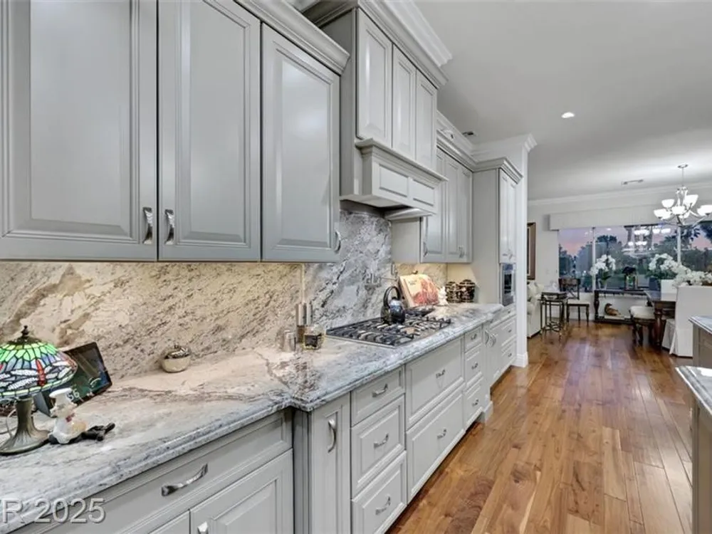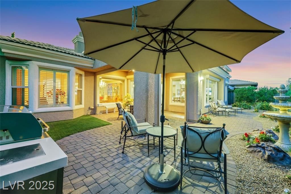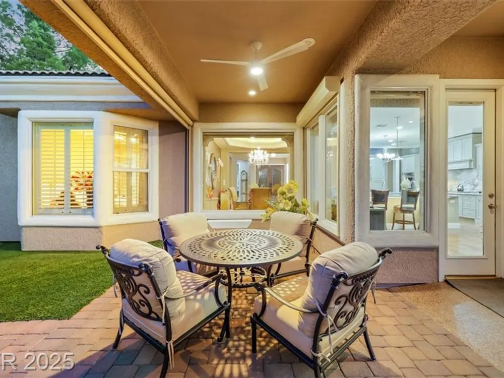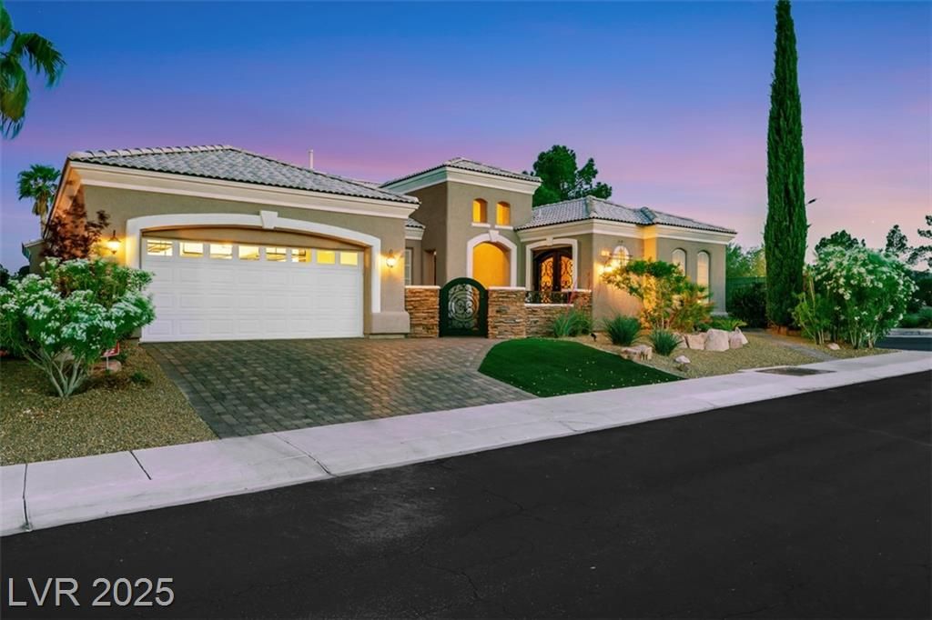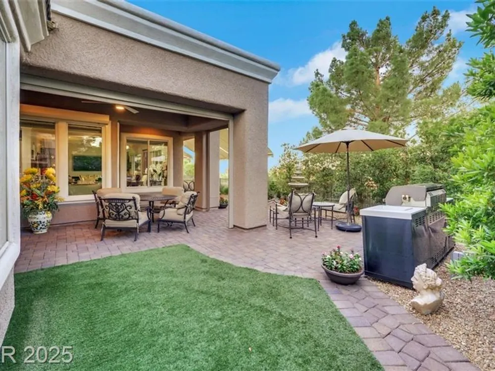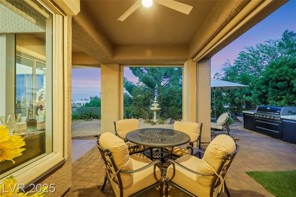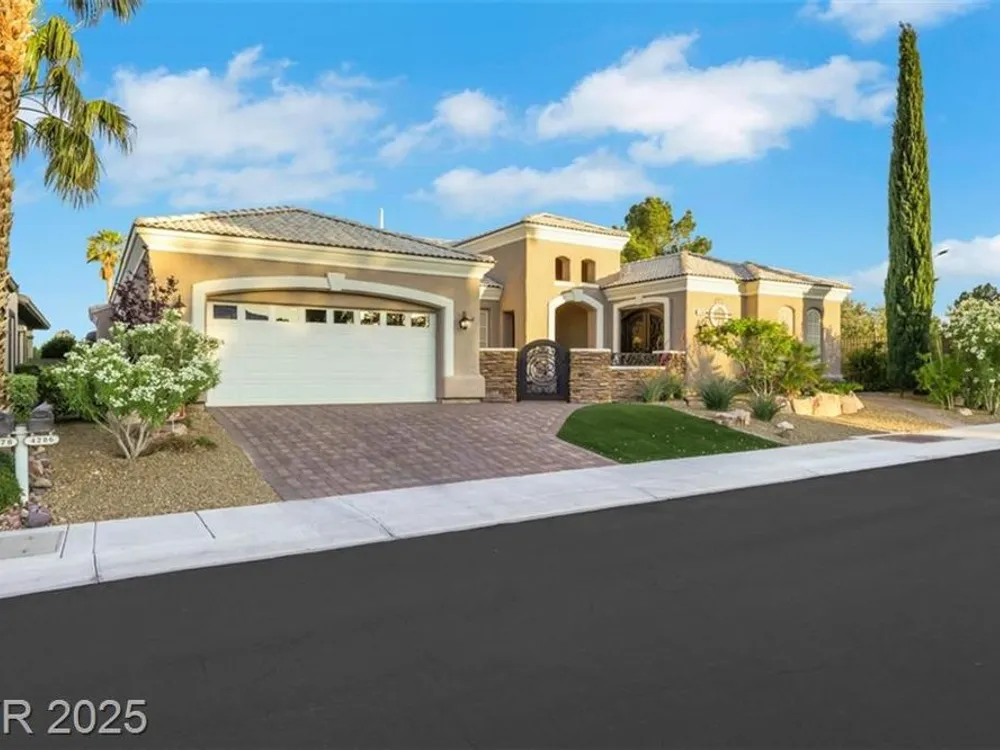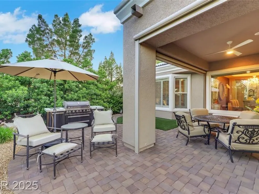 Amazing and incredible golf course property with wide open and beautiful views of the Las Vegas Strip and surrounding mountains. Highly upgraded 3 bedroom home - featuring a private casita - offers luxurious living on the golf course, nestled in the beautiful guard gated community of Siena Country Club. Minutes from the 215, casinos and shopping areas. Enter through the beautiful custom iron gate and serene courtyard to the expansive covered patio with high end BBQ, this home is designed for style and comfort. Inside the custom kitchen dazzles with stainless steel appliances, a wine refrigerator and beautifully upgraded rich cabinetry, showcasing exceptional storage features. Primary suite boasts a bay window overlooking the greens with mountain views. Extensive closet space and an incredible spa like custom bathroom! Additional highlights include crown molding, coffered ceilings, rolling shutters and very lush landscaping. A rare gem offering elegance and breathtaking views!