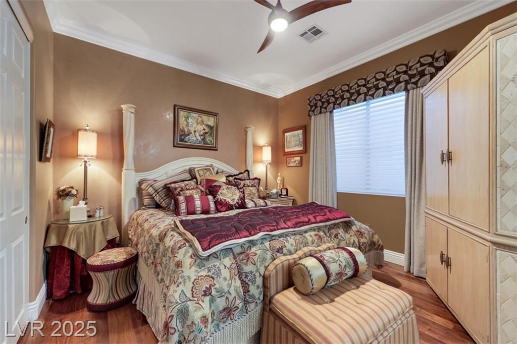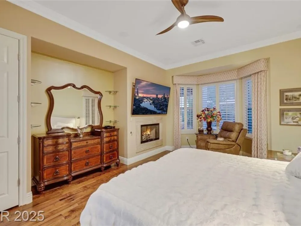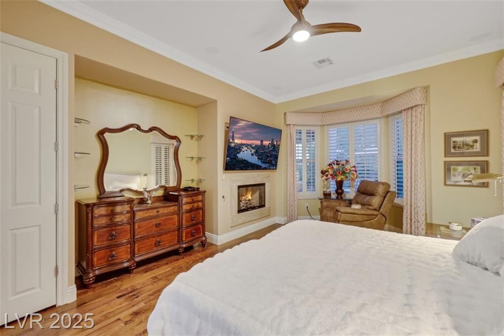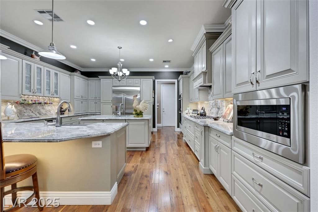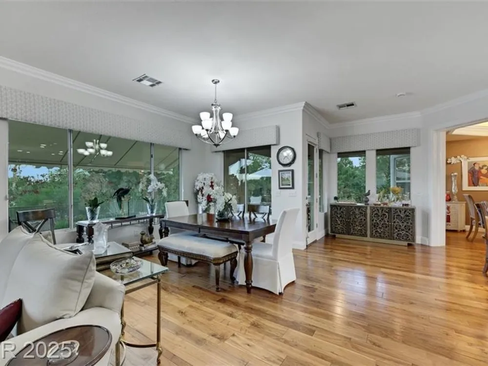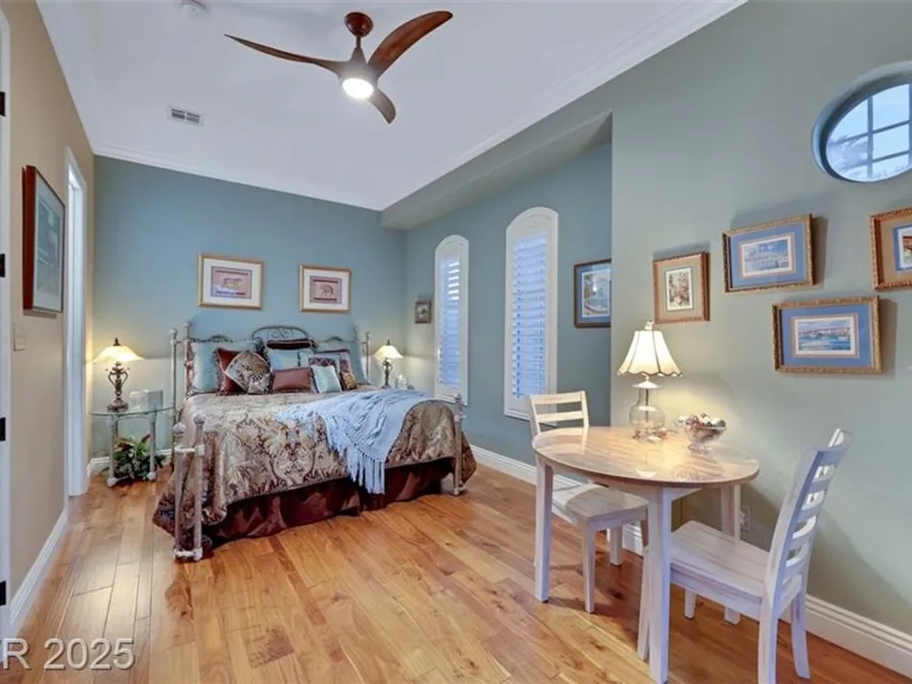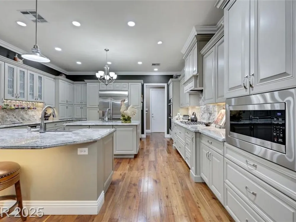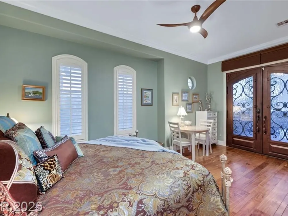Amazing and incredible golf course property with wide open and beautiful views of the Las Vegas Strip and surrounding mountains. Highly upgraded 3 bedroom home - featuring a private casita - offers luxurious living on the golf course, nestled in the beautiful guard gated community of Siena Country Club. Minutes from the 215, casinos and shopping areas. Enter through the beautiful custom iron gate and serene courtyard to the expansive covered patio with high end BBQ, this home is designed for style and comfort. Inside the custom kitchen dazzles with stainless steel appliances, a wine refrigerator and beautifully upgraded rich cabinetry, showcasing exceptional storage features. Primary suite boasts a bay window overlooking the greens with mountain views. Extensive closet space and an incredible spa like custom bathroom! Additional highlights include crown molding, coffered ceilings, rolling shutters and very lush landscaping. A rare gem offering elegance and breathtaking views!