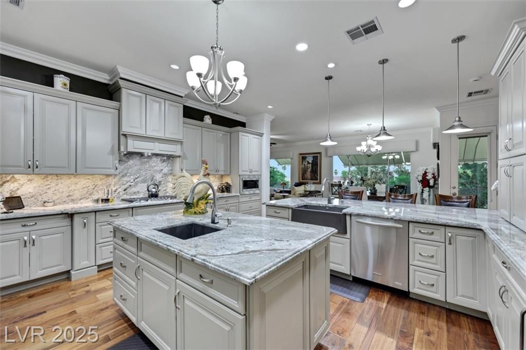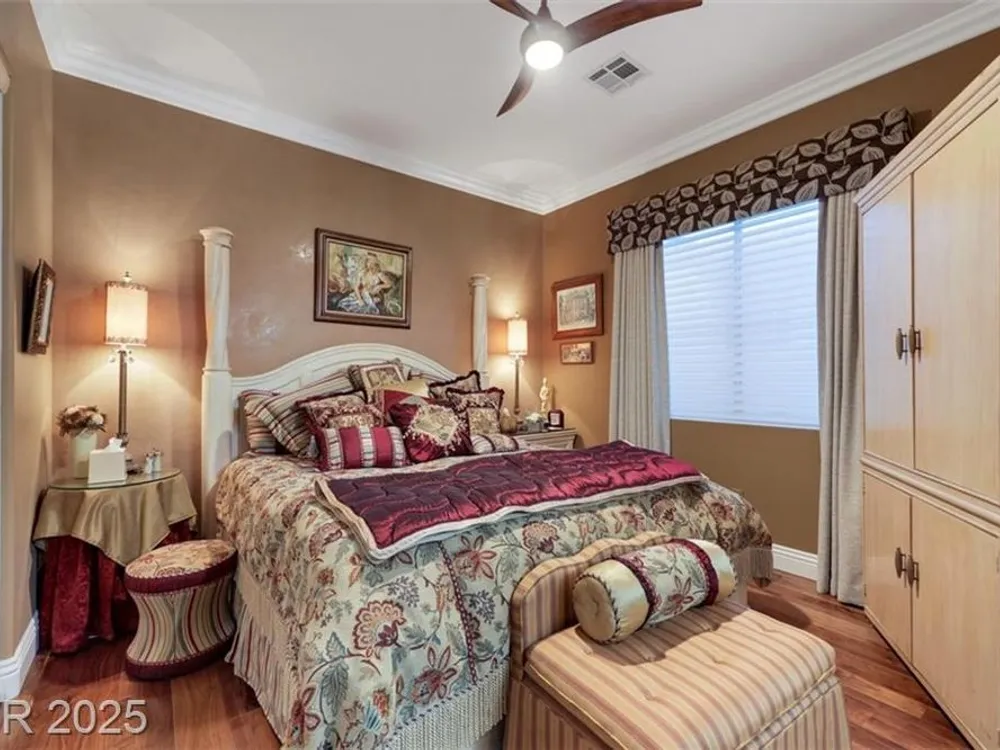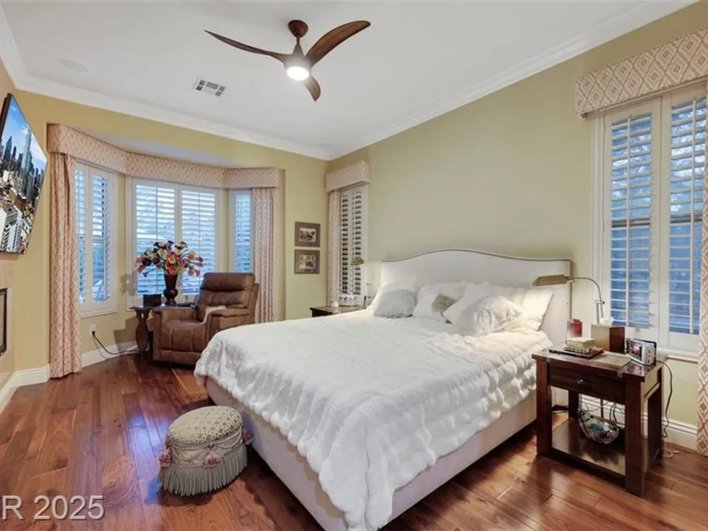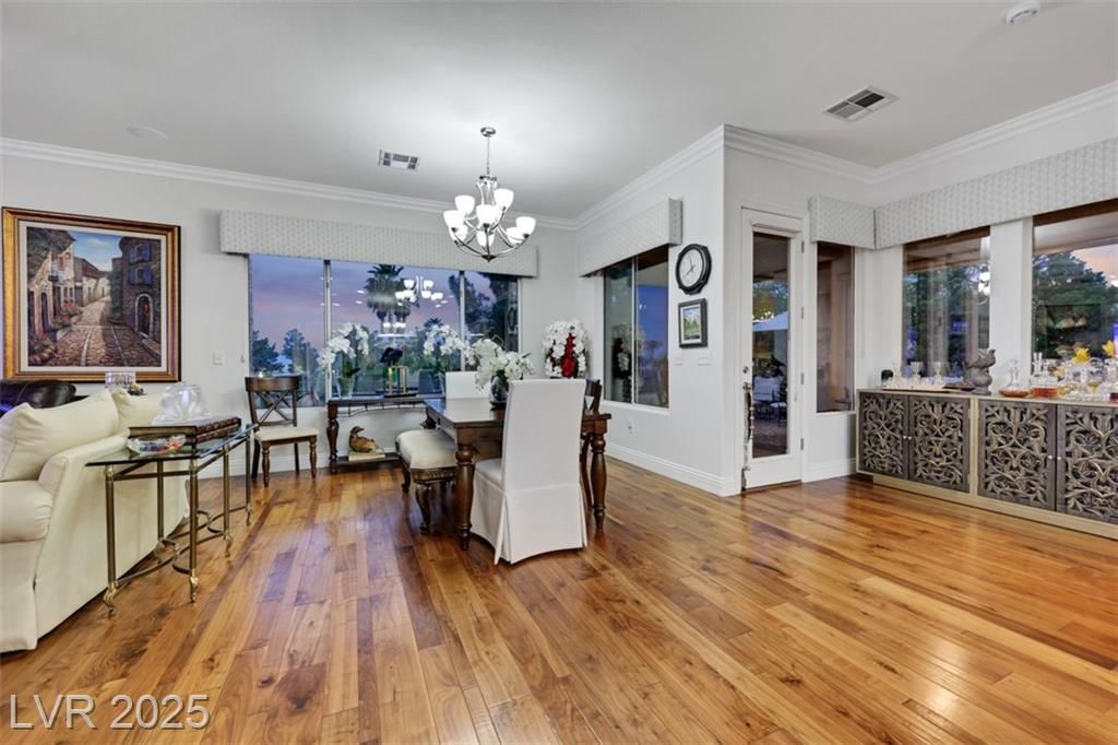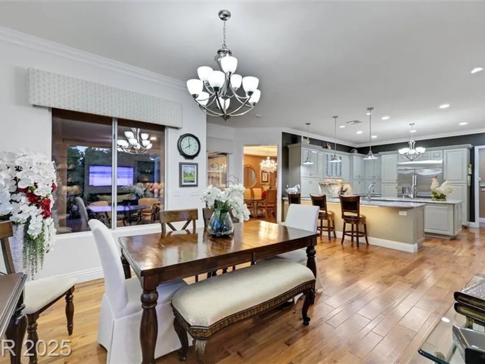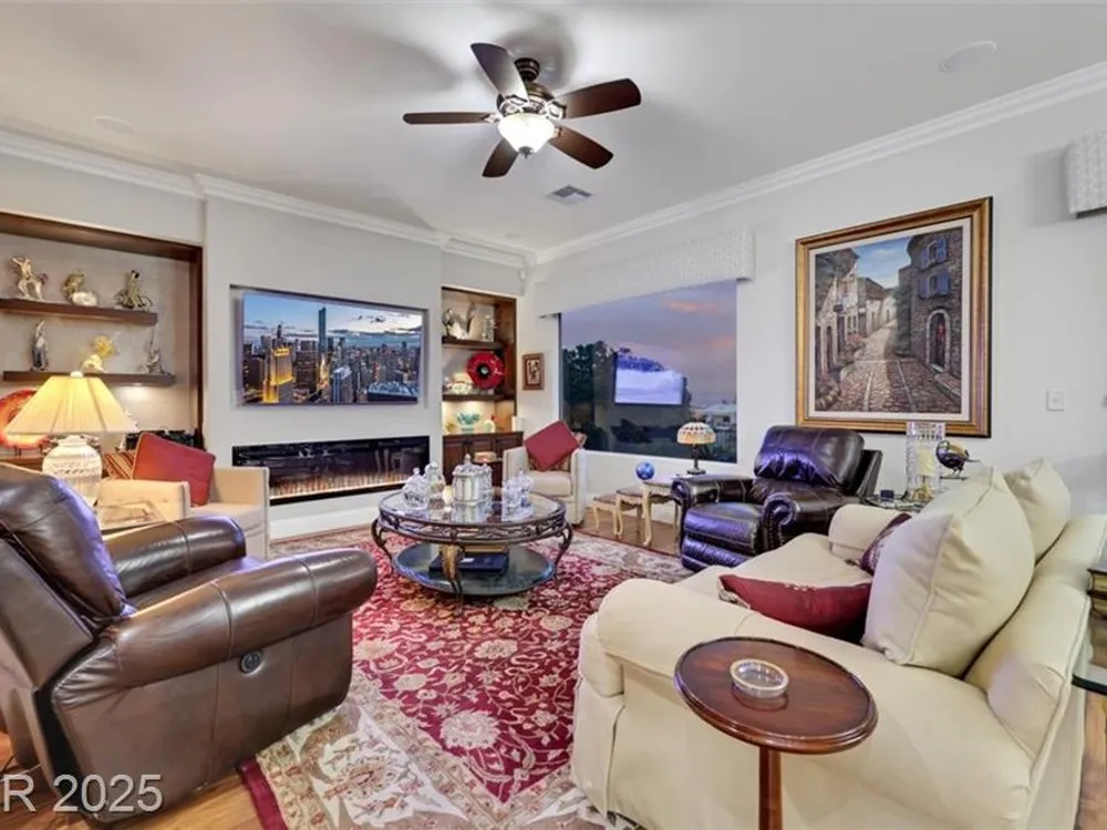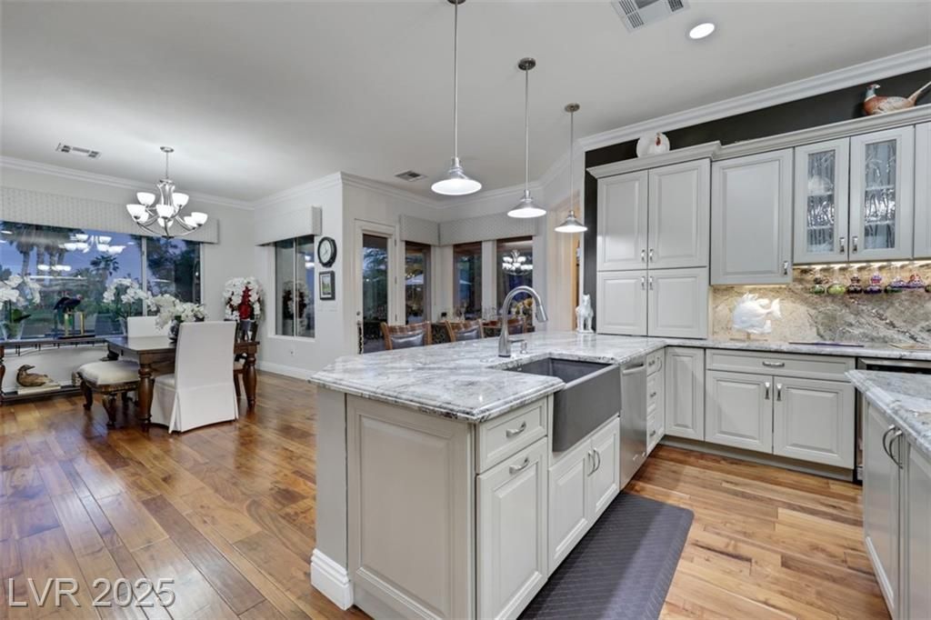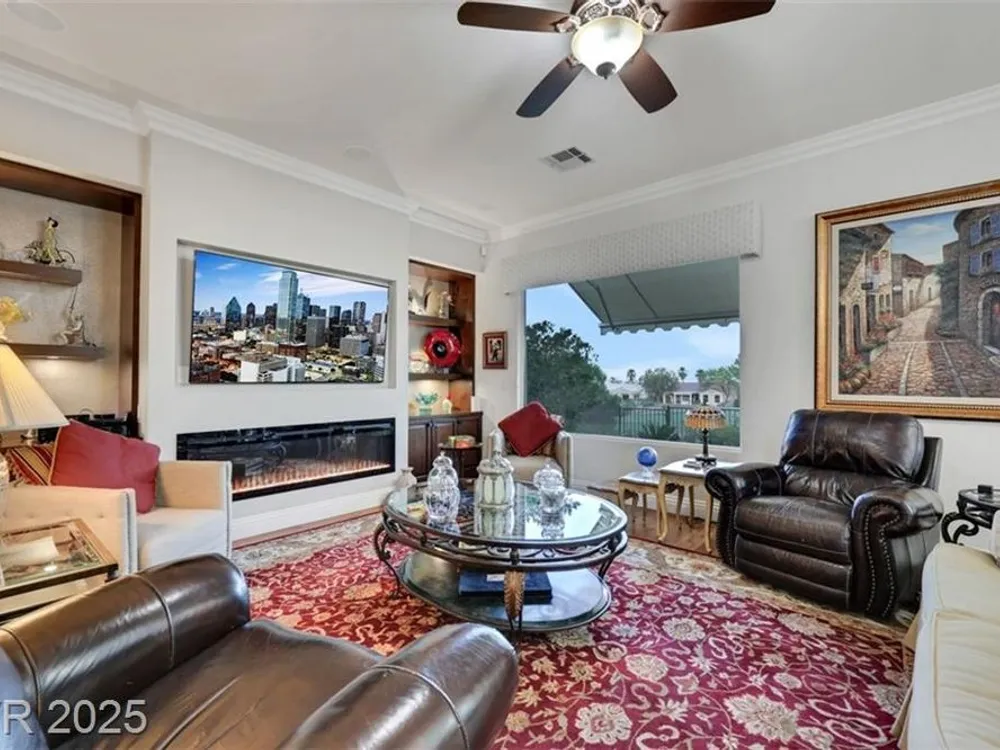 Amazing and incredible golf course property with wide open and beautiful views of the Las Vegas Strip and surrounding mountains. Highly upgraded 3 bedroom home - featuring a private casita - offers luxurious living on the golf course, nestled in the beautiful guard gated community of Siena Country Club. Minutes from the 215, casinos and shopping areas. Enter through the beautiful custom iron gate and serene courtyard to the expansive covered patio with high end BBQ, this home is designed for style and comfort. Inside the custom kitchen dazzles with stainless steel appliances, a wine refrigerator and beautifully upgraded rich cabinetry, showcasing exceptional storage features. Primary suite boasts a bay window overlooking the greens with mountain views. Extensive closet space and an incredible spa like custom bathroom! Additional highlights include crown molding, coffered ceilings, rolling shutters and very lush landscaping. A rare gem offering elegance and breathtaking views!