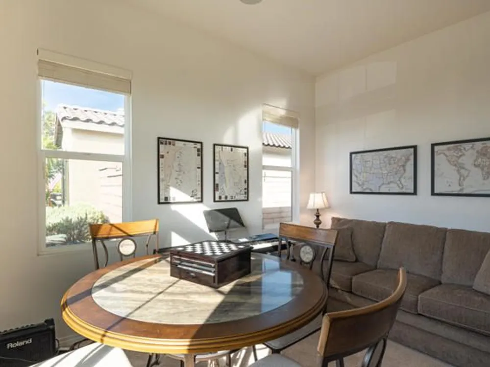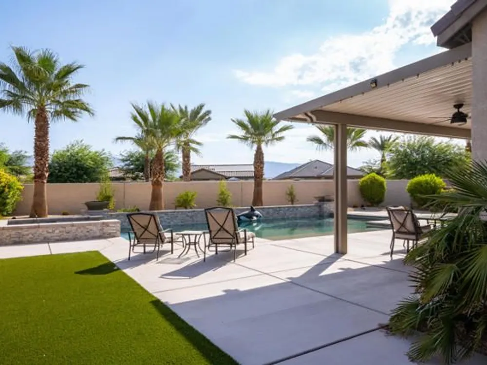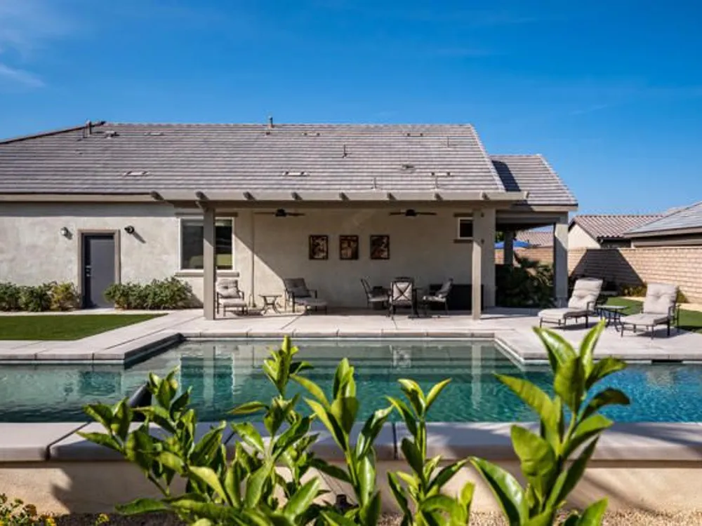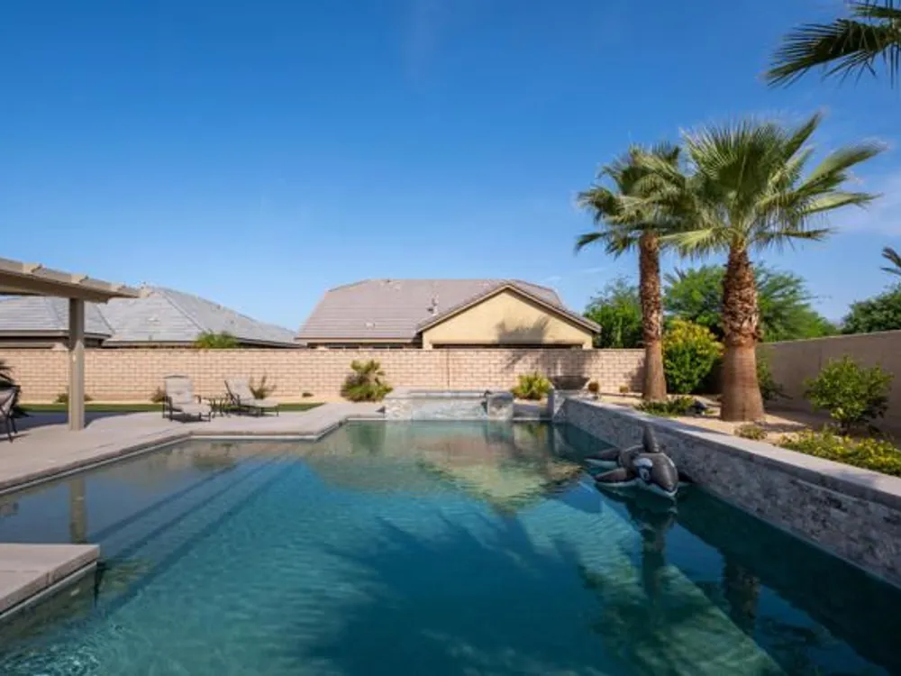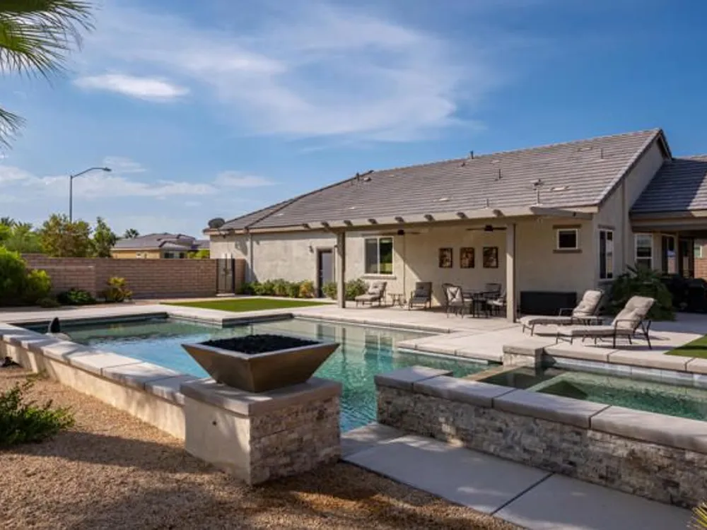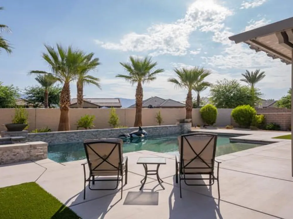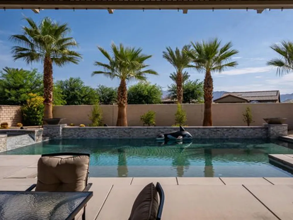 Welcome to 42897 Cusino Ct, a stunning desert retreat tucked at the end of a quiet cul-de-sac on an oversized 12,000 sq. ft. lot in a desirable 55+ community. This spacious home offers two living rooms and a versatile flex space that can serve as a bedroom, office, or hobby room. The kitchen is designed with both style and function in mind, featuring granite countertops, a central island with bar seating, and an open flow to the dining and living areas--ideal for entertaining. The primary suite is a private retreat with a walk-in closet, double vanity, soaking tub, and walk-in shower. Outdoor living is unmatched with two covered patios, custom misting systems, turf landscaping, and a resort-style custom pool with overflow spa, all framed by sweeping north and west-facing views that capture the desert sky and sunsets. A convenient laundry room with utility sink completes the home, which is offered fully furnished and move-in ready for your next desert chapter.