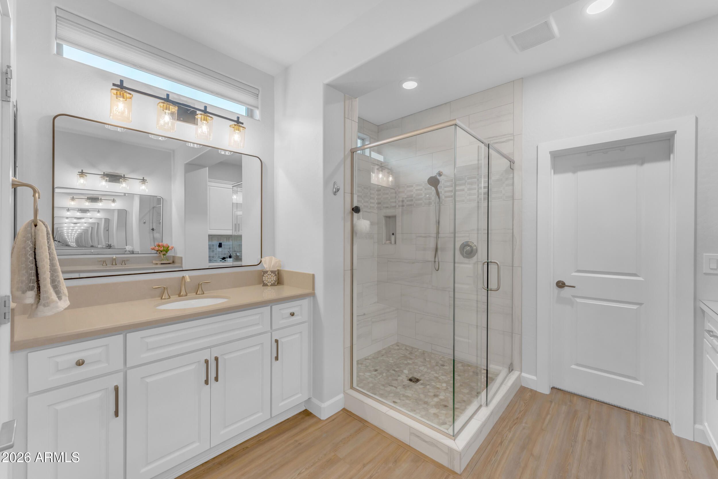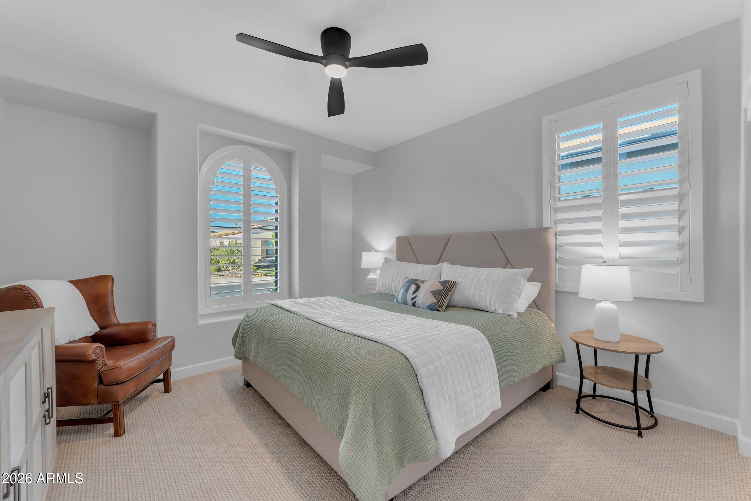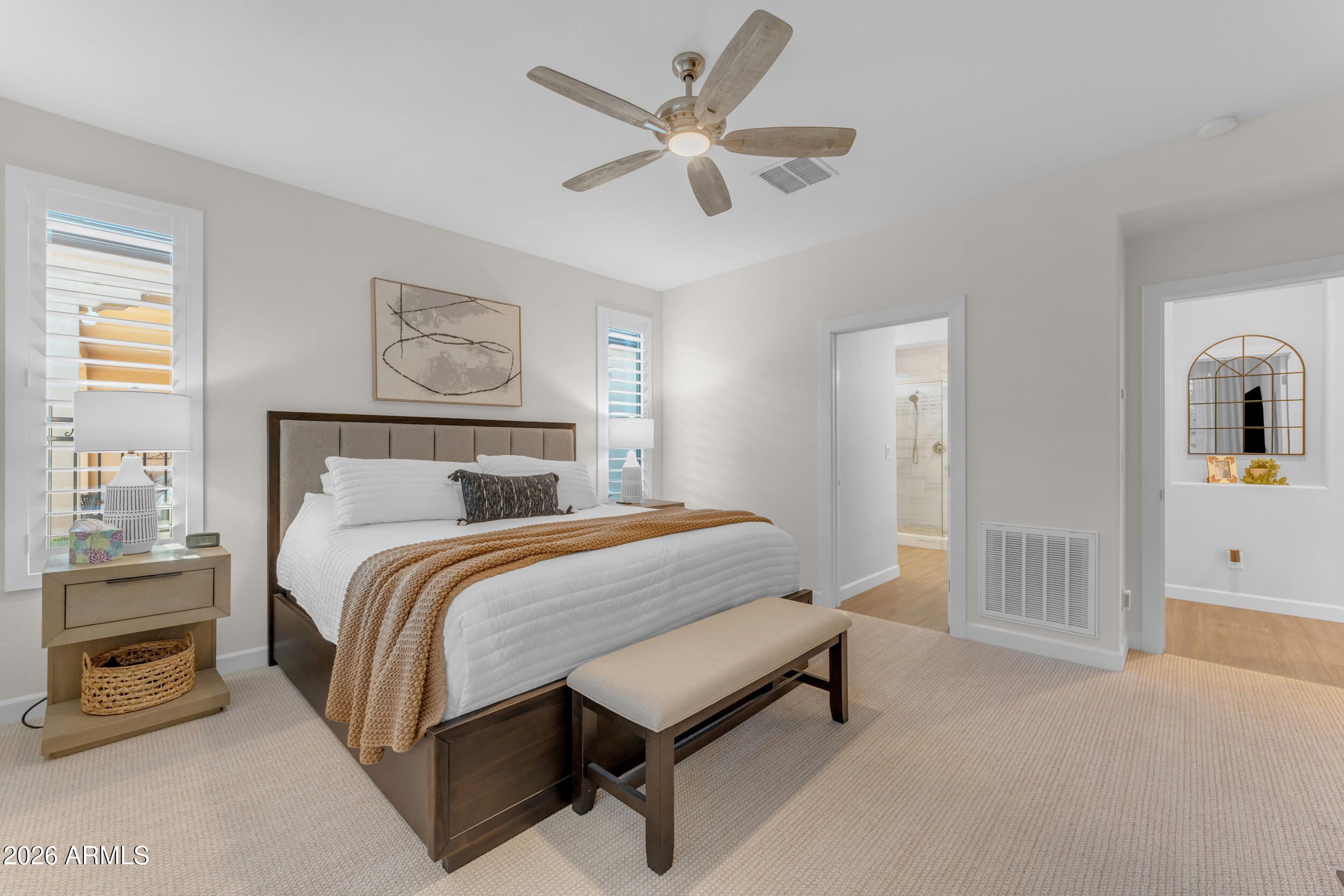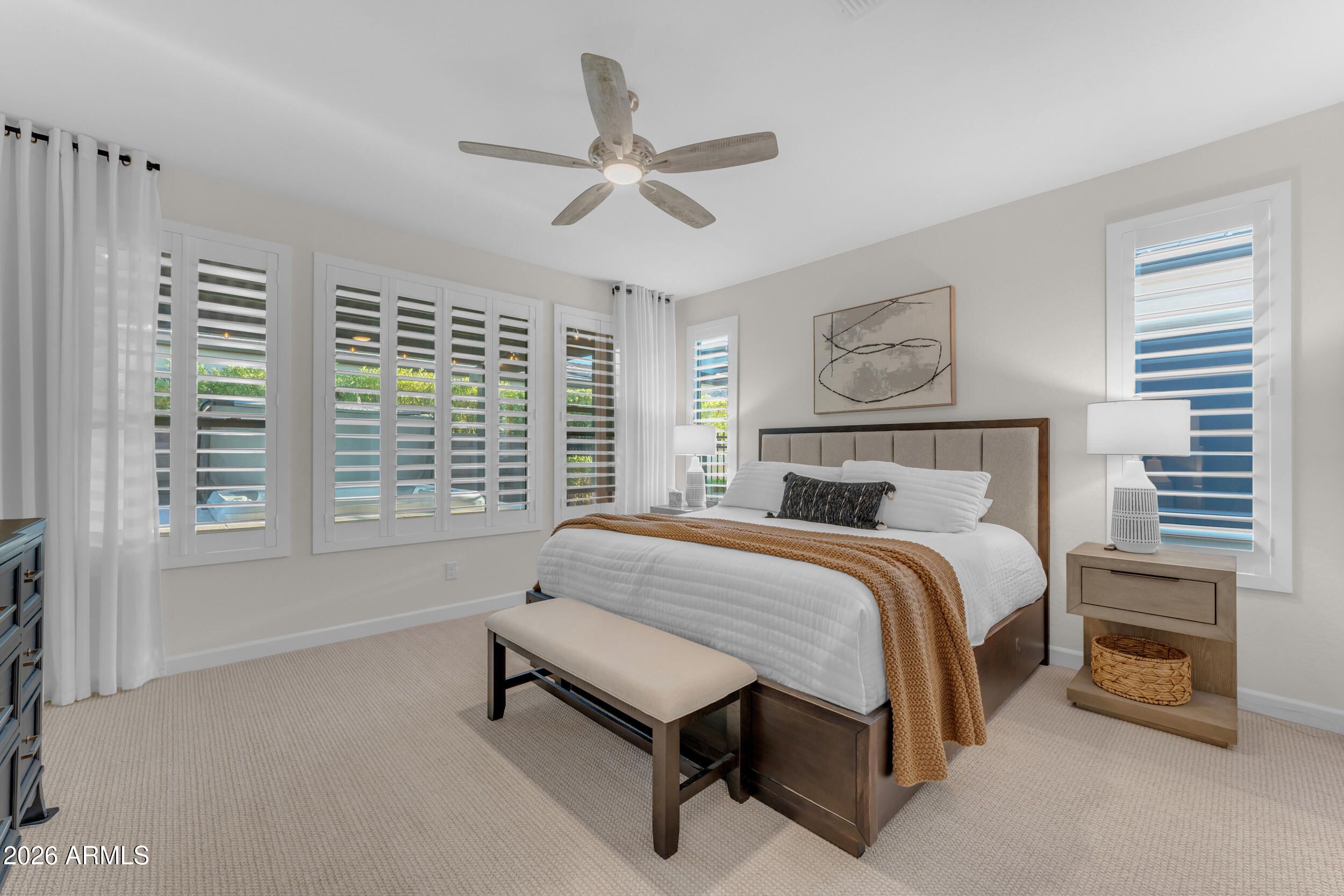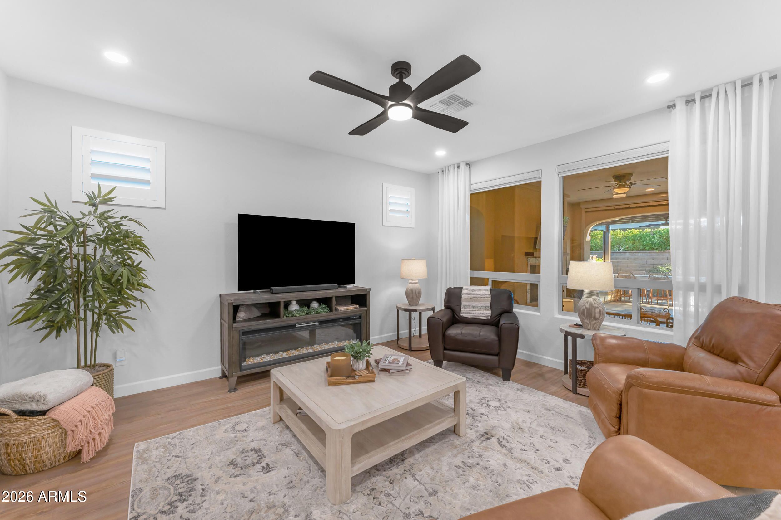 Welcome to an exceptional opportunity in the heart of Encanterra Golf & Country Club, where refined design meets true resort-style living. This stunning residence presents like a model, showcasing brand new interior paint, plush new carpet, updated designer lighting, and elegant shutters throughout offering a fresh, sophisticated, move-in ready experience. Designed with both comfort and elevated entertaining in mind, the split open floor plan is filled with natural light and thoughtfully curated spaces. Luxury plank flooring flows seamlessly throughout, enhancing the home's clean, cohesive aesthetic. At the center, the kitchen anchors the home with quartz countertops, abundant cabinetry, a spacious pantry, and effortless connection to the main living areas. The expanded laundry room adds both function and flexibility, complete with additional storage and a built-in workspace. A large sliding glass door off the dining area creates a seamless indoor-outdoor transition--perfectly blending Arizona living with an elevated entertaining experience. Step outside to a backyard designed to impress and unwind. The covered patio features a built-in fireplace and TV, creating a warm and inviting outdoor living space. The extended outdoor area offers a built-in grill with seating, while a tranquil waterfall feature and private spa under a pergola complete this resort-inspired retreat--ideal for both intimate evenings and elevated gatherings. Perfectly positioned within the community, this home is just steps from the Algarve Clubhouse, where residents enjoy resort-style pools, dining, live music, and a vibrant social atmosphere. Encanterra is renowned for its award-winning, private Tom Lehman-designed golf course and an unmatched collection of amenities, including pickleball, tennis, bocce ball, a state-of-the-art fitness center, and the full-service Alvea Spa. Residents also enjoy an active lifestyle with a full calendar of events, multiple dining experiences including the signature La Palma restaurant and Bodega Wine & Café, and four resort-style pools, including the serene adult-only Algarve pool and the scenic Solaz pool overlooking the golf course. This is more than a home--it's an extension of the Encanterra lifestyle.