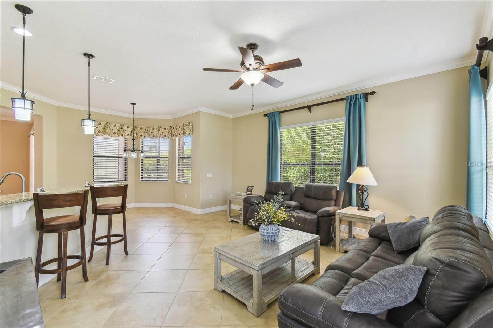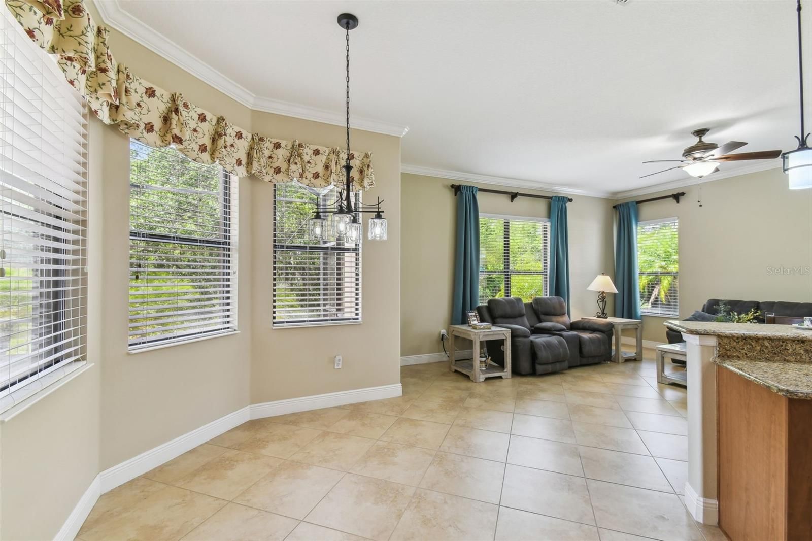 - Ceiling Fan(s), Crown Molding, Eat-in Kitchen, High Ceilings, Kitchen/Family Room Combo, Living/Dining Room, Open Floorplan, Main Level Primary, Solid-Wood Cabinets, Split Bedrooms, Stone Counters, Thermostat, Walk-In Closet(s), Window Treatments