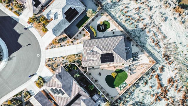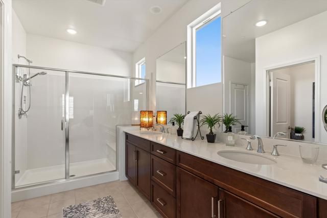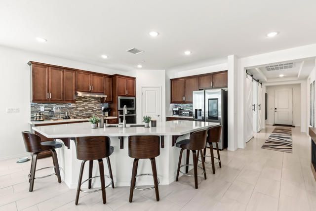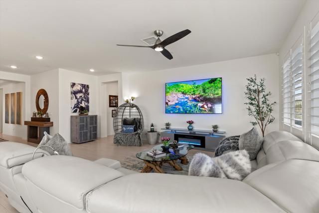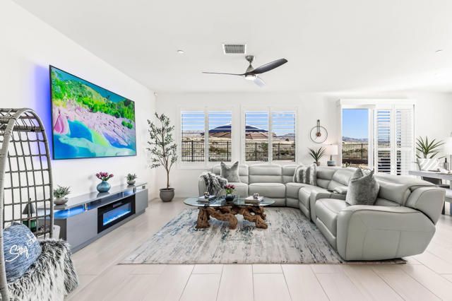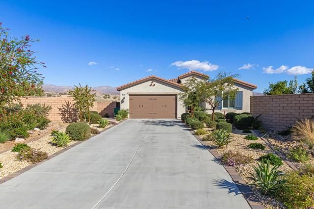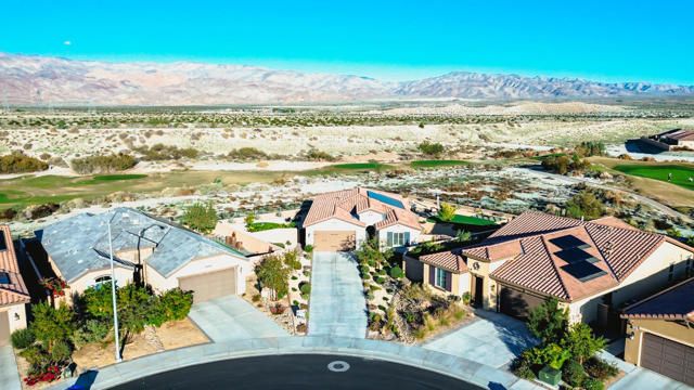 Welcome to this impeccably maintained 2023-built home offering 2,026 square feet of bright, open living in one of the Coachella Valley's most desirable 55+ communities. Perfectly positioned on an oversized 13,068 sq ft premium lot - one of the most unique the community has to offer - this residence showcases sweeping golf course views and breathtaking 360-degree mountain vistas.The thoughtfully designed floor plan features 2 bedrooms, 2 bathrooms, and a generous den/office--ideal for a home workspace or hobby room. Soaring 9-foot ceilings and an open-concept layout create an inviting atmosphere, enhanced by porcelain tile flooring and natural light throughout.The chef's kitchen impresses with quartz countertops, a large center island, dual ovens, stainless steel appliances, and a walk-in pantry. The primary suite offers a custom-designed walk-in closet and a spa-inspired bathroom with modern finishes. Upgraded carpeting in bedrooms, 4-inch plantation shutters, and ceiling fans complete the refined interior.Step outside to professionally landscaped grounds featuring artificial turf, mature fruit trees, and drought-friendly desert plantings. There's no shortage of parking with the expansive driveway and oversized three-bay garage that includes space for a golf cart & an EV charger.Exceptional energy efficiency comes standard with a FULLY OWNED solar system. Even better, the home is located within the Imperial Irrigation District (IID), offering significantly lower utility rates than neighboring areas. Four Seasons Terra Lago boasts an impressive 22,000 sq ft clubhouse featuring a state-of-the-art fitness center, full-service salon, yoga/aerobics studios, library, billiard room, ballroom, bistro, & both indoor & outdoor pools. Stay active with golf, tennis, pickleball, & countless organized activities that foster connection & community.Beyond the gates, the best of the Coachella Valley awaits. Easy I-10 freeway access puts you minutes from world-class dining, shopping, and entertainment. Catch a concert or sporting event at Acrisure Arena, try your luck at nearby casinos, or explore miles of scenic hiking trails in the surrounding desert mountains. The vibrant communities of La Quinta, Palm Desert, & Palm Springs are all a short drive away--offering championship golf courses, boutique shopping on El Paseo, the Palm Springs Aerial Tramway, and the valley's renowned restaurant scene.Turn-key and move-in ready--no new construction wait required.