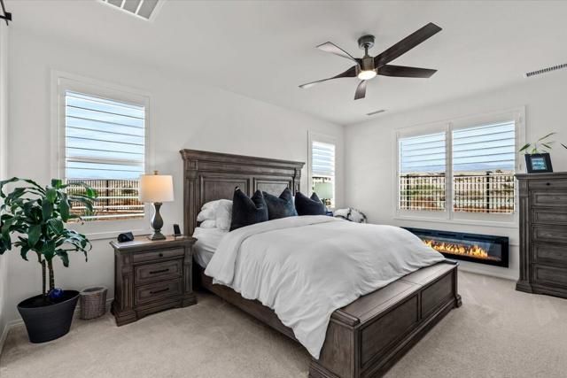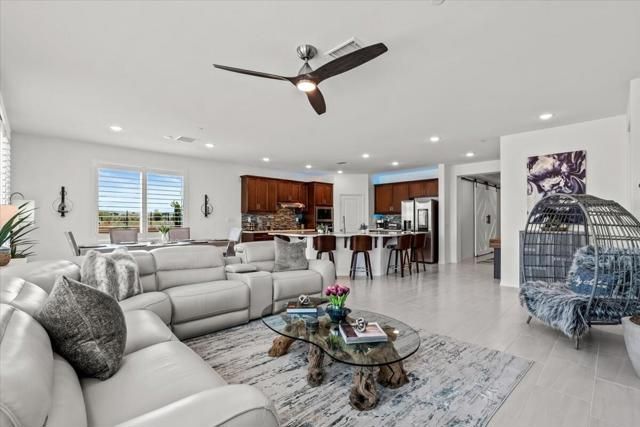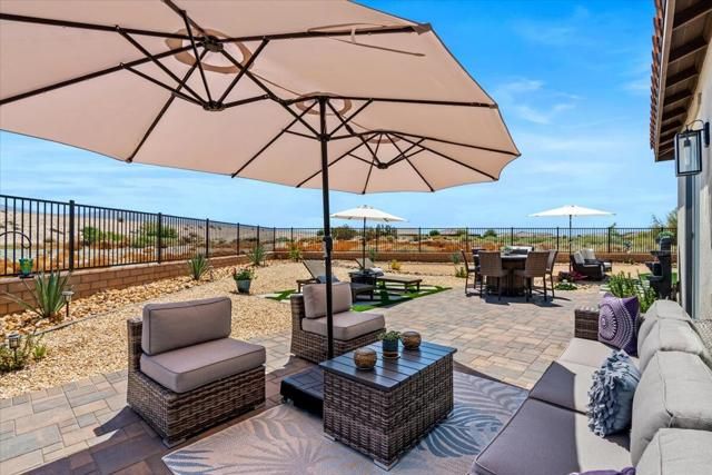 Step into Luxury Desert Living in this Bright, Airy, Single-story home, 2026 sq. ft. with Beautiful WHITE TILE Floors and PAID OFF SOLAR Located in the highly sought after Four Seasons Terra Lago. House completed 2023. This Immaculate 2 bedroom,2 bathroom plus Large 3rd DEN/OFFICE home, sits on a premium +++13,068 sq. ft. lot, with golf course view. Fully landscaped with breathtaking 360 mountain views, artificial turf, mature fruit trees, and drought friendly desert plants.Interior features: Soaring 9' ceilings & an open concept layout, Chef-inspired upgraded kitchen with Quartz countertops throughout ,Large Central Island, walk in pantry, two ovens & stainless appliances, Stylish porcelain tile flooring in living areas, plush upgraded carpeting in bedrooms. Spacious primary suite with beautiful custom-designed walk-in closets, elegant bathrooms with modern finishes, custom cabinetry, utility sink & added storage in laundry room. There are 4'' plantation shutters and ceiling fans throughout. Exterior & Energy Efficiency: Expansive driveway fits up to 6 vehicles,+ 2 car garage Plus Bonus 3rd bay perfect for golf cart. EV CHARGER (Charger point Level 2), FULLY OWNED SOLAR SYSTEM, INCLUDED, Enjoy Energy Savings. Fire Sprinkler System in home and garage. This home is truly turn-key offering modern upgrades all in a friendly Active 55+Community offering a Clubhouse, pools,& ,spa & fitness center, basketball & tennis & pickleball courts. Gated Security and HOA Maintained grounds. The owners are relocating out of state, giving you a rare opportunity to own a home without the wait of new construction.