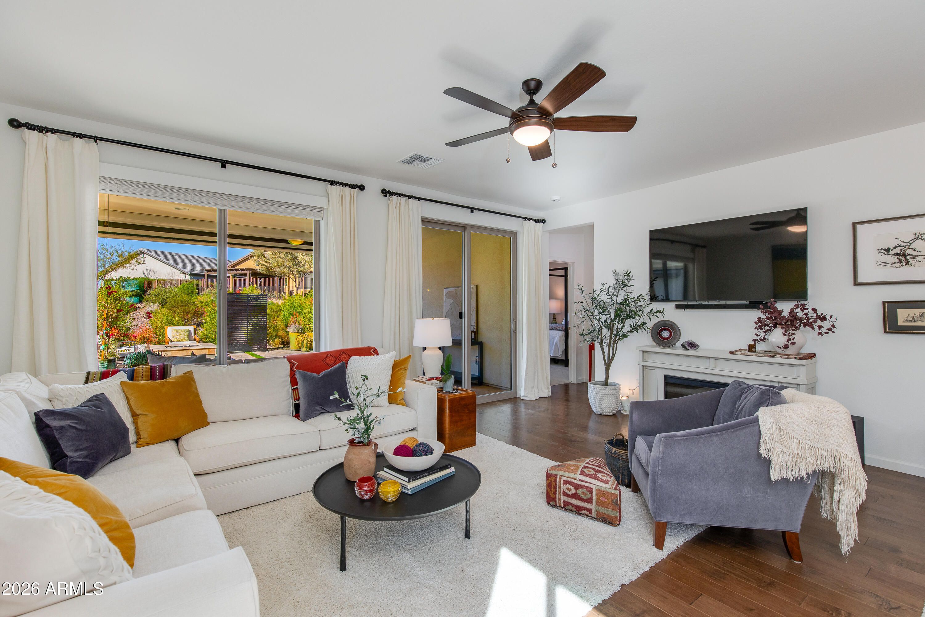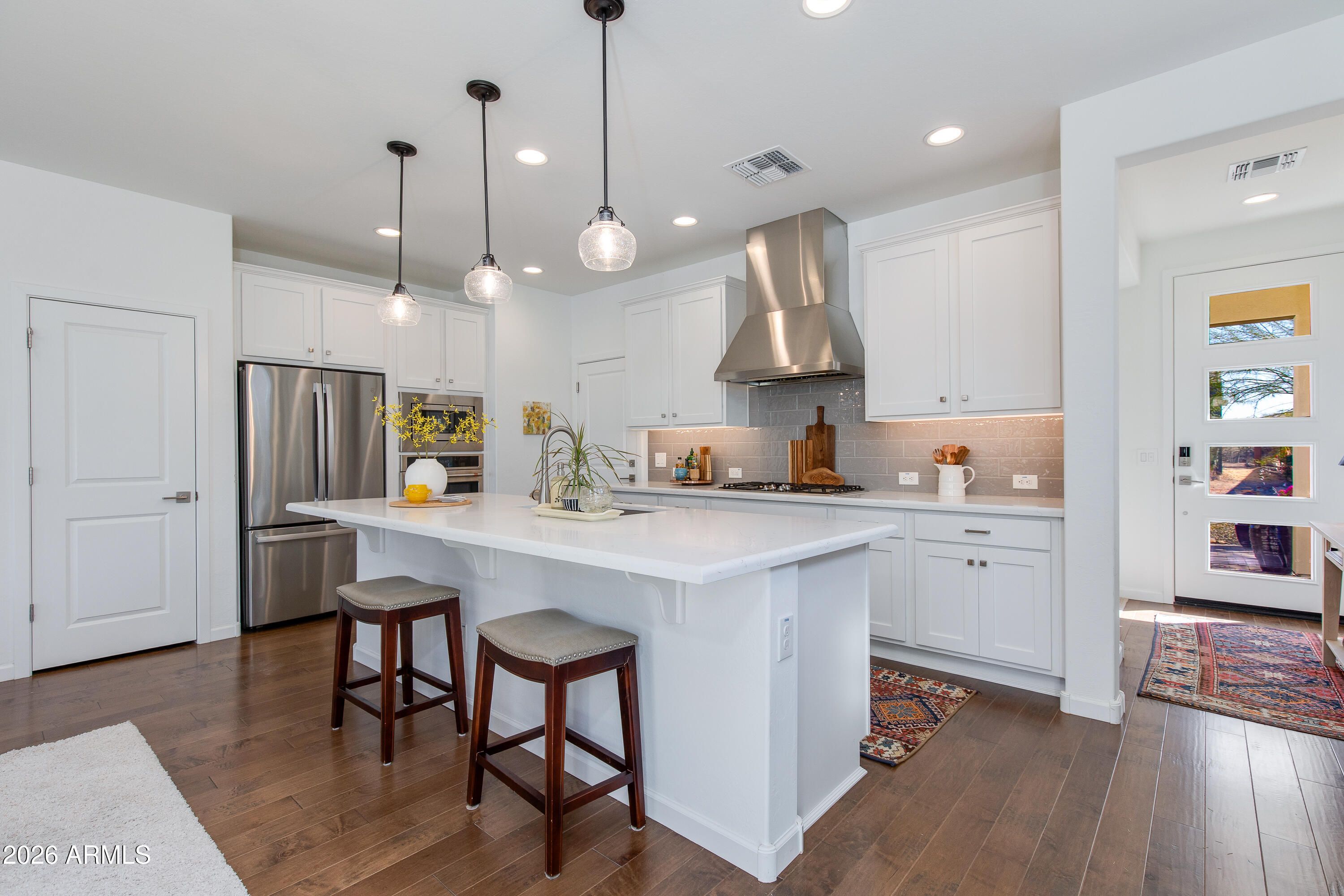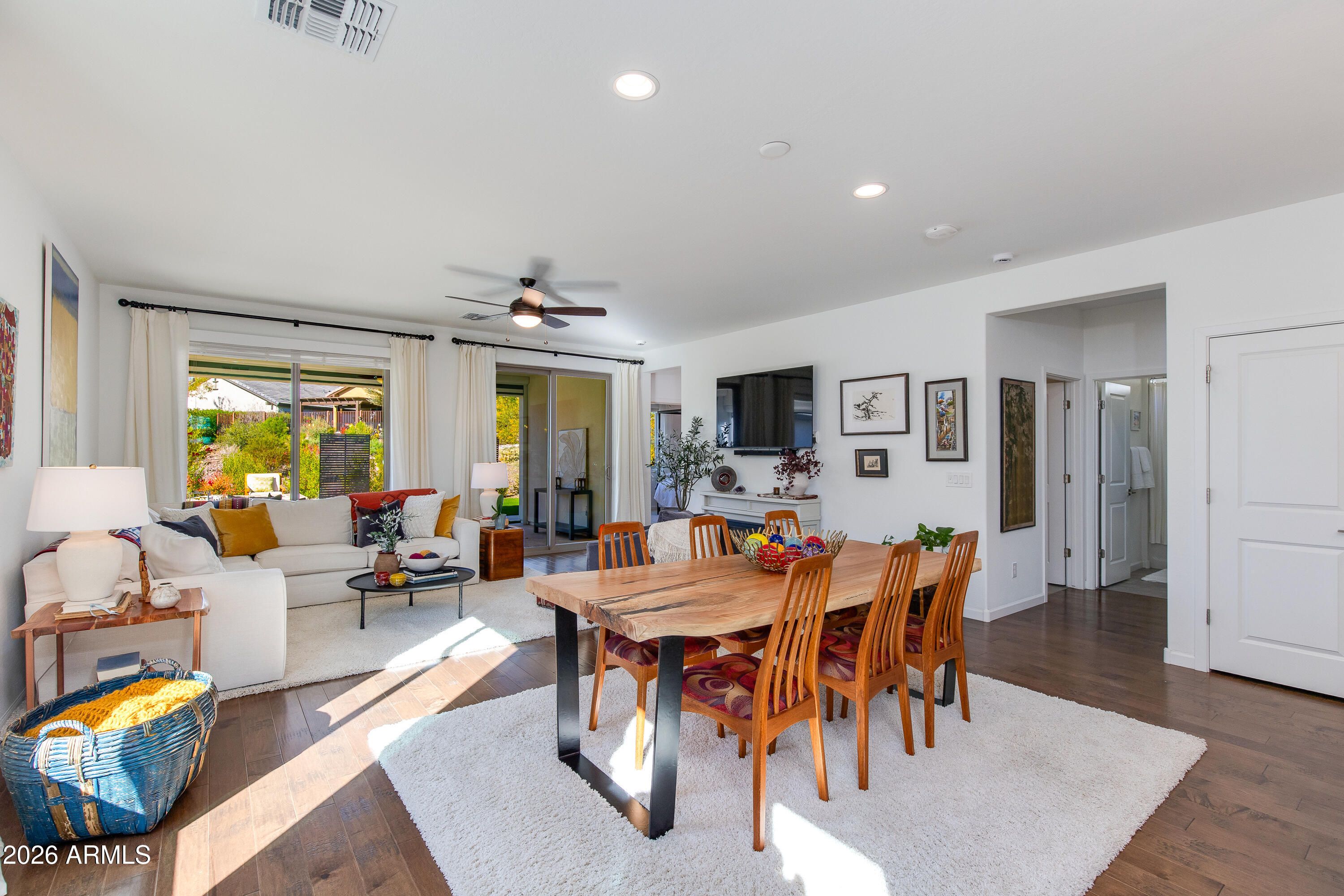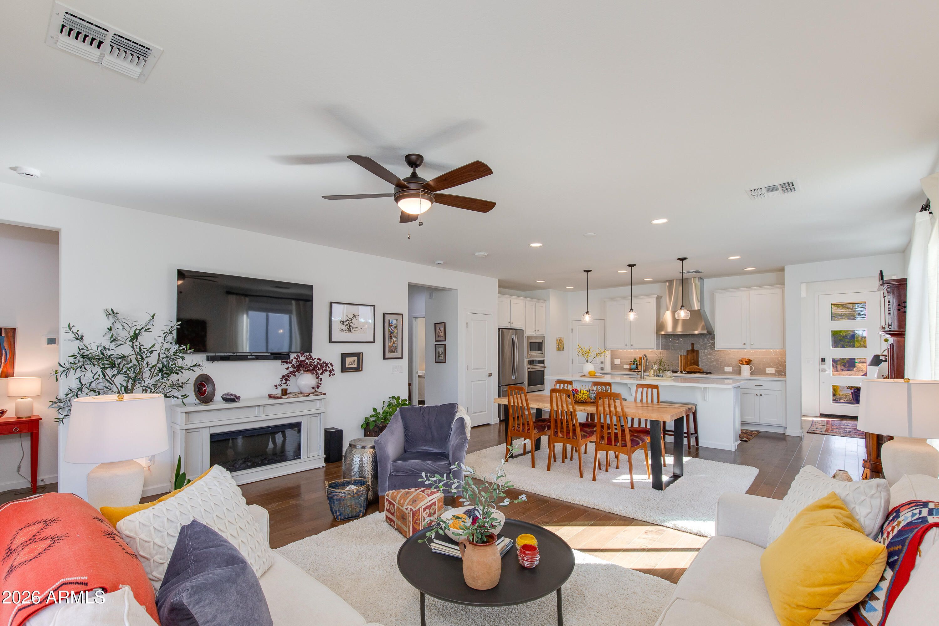 Thrive model by Shea Homes in Wickenburg Ranch! Light & bright 2BD/2BA+den in quiet Horseshoe. Wood flooring throughout w/upgraded carpet in bedrooms. Den w/custom built-in desk. Chef's kitchen w/white upgraded cabinets, quartz counters, custom tile backsplash & built-in GE appliances incl 5-burner gas cooktop. Soft-close wood drawers, pullouts, built-in recycling & upgraded hardware. Spacious primary suite w/upgraded bath: custom shower tile & heavy glass enclosure. Both baths feature quartz tops, custom tile, mirrors & upgraded lighting. Covered patio w/mechanical sunshades extends outdoor living. Backyard oasis w/travertine, custom turf, built-in BBQ & fire pit. Morning coffee in the shade, evening cocktails by the fire—this is the kind of backyard that turns weekdays into weekends Now
