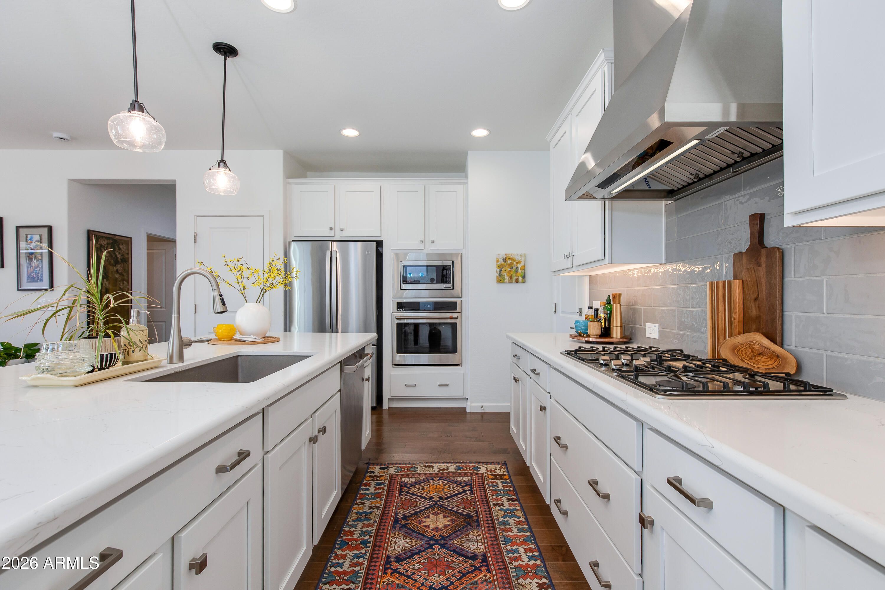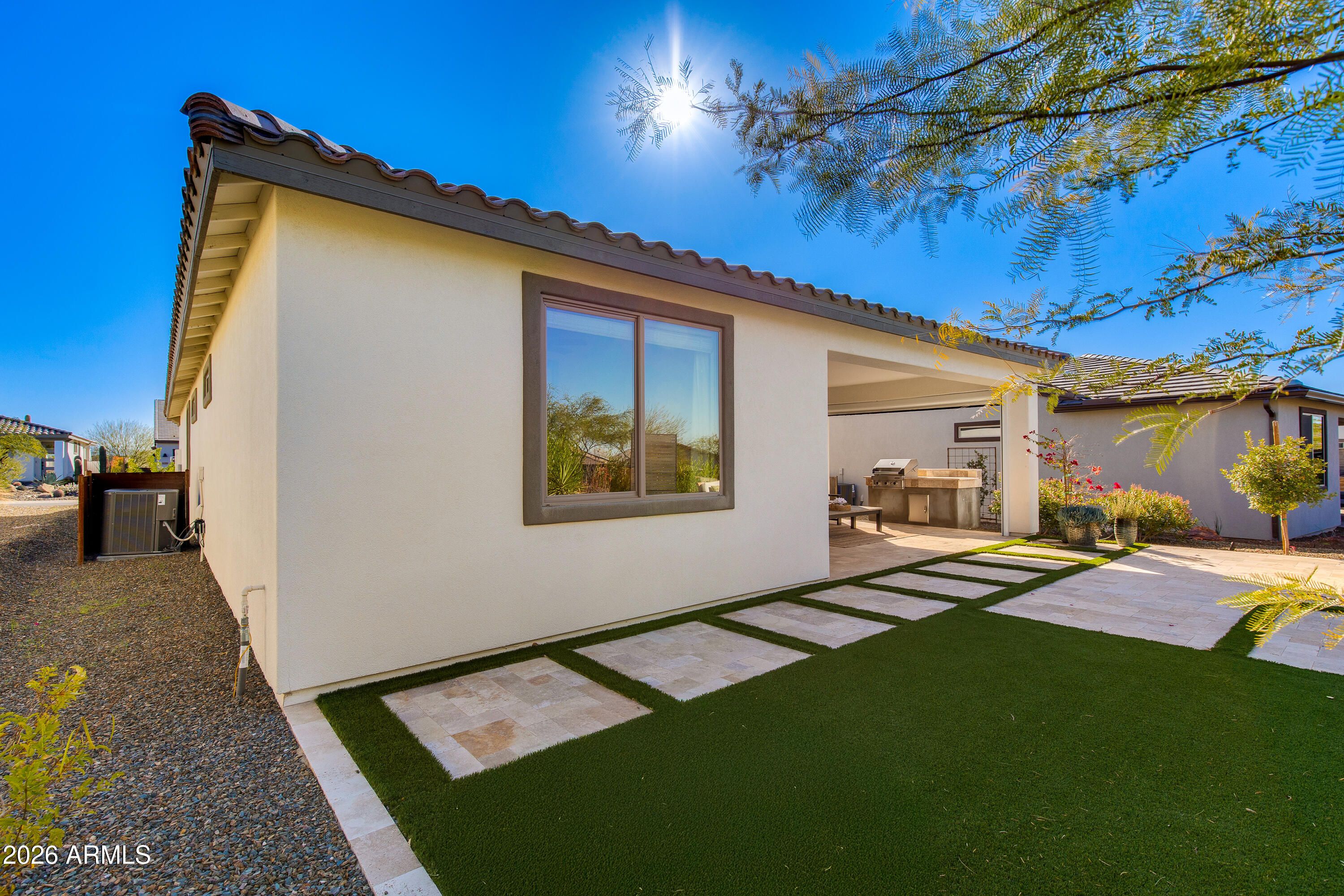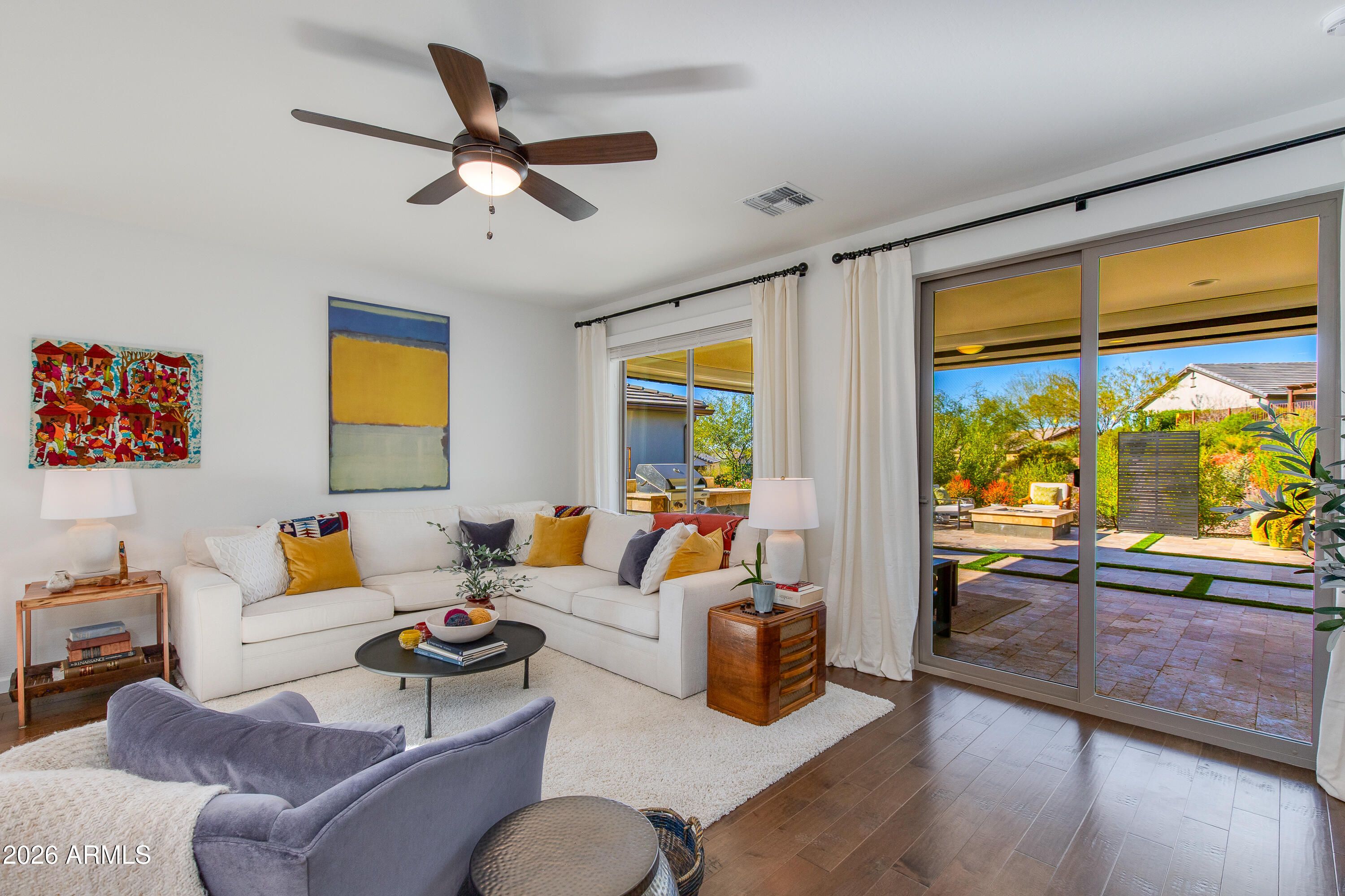 Thrive model by Shea Homes in Wickenburg Ranch! Light & bright 2BD/2BA+den in quiet Horseshoe. Wood flooring throughout w/upgraded carpet in bedrooms. Den w/custom built-in desk. Chef's kitchen w/white upgraded cabinets, quartz counters, custom tile backsplash & built-in GE appliances incl 5-burner gas cooktop. Soft-close wood drawers, pullouts, built-in recycling & upgraded hardware. Spacious primary suite w/upgraded bath: custom shower tile & heavy glass enclosure. Both baths feature quartz tops, custom tile, mirrors & upgraded lighting. Covered patio w/mechanical sunshades extends outdoor living. Backyard oasis w/travertine, custom turf, built-in BBQ & fire pit. Morning coffee in the shade, evening cocktails by the fire—this is the kind of backyard that turns weekdays into weekends Now