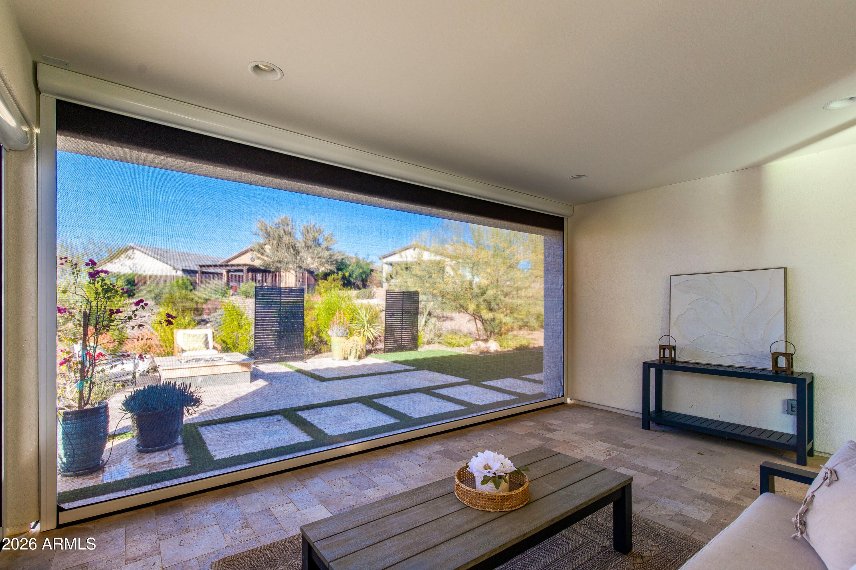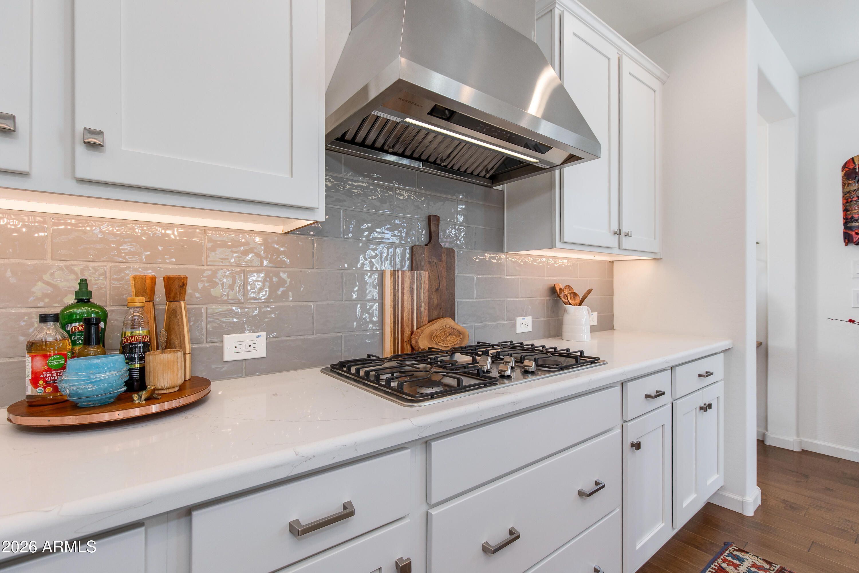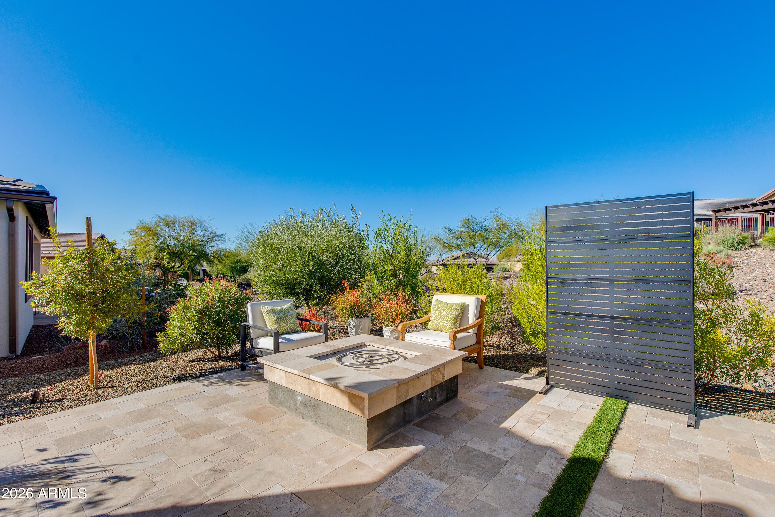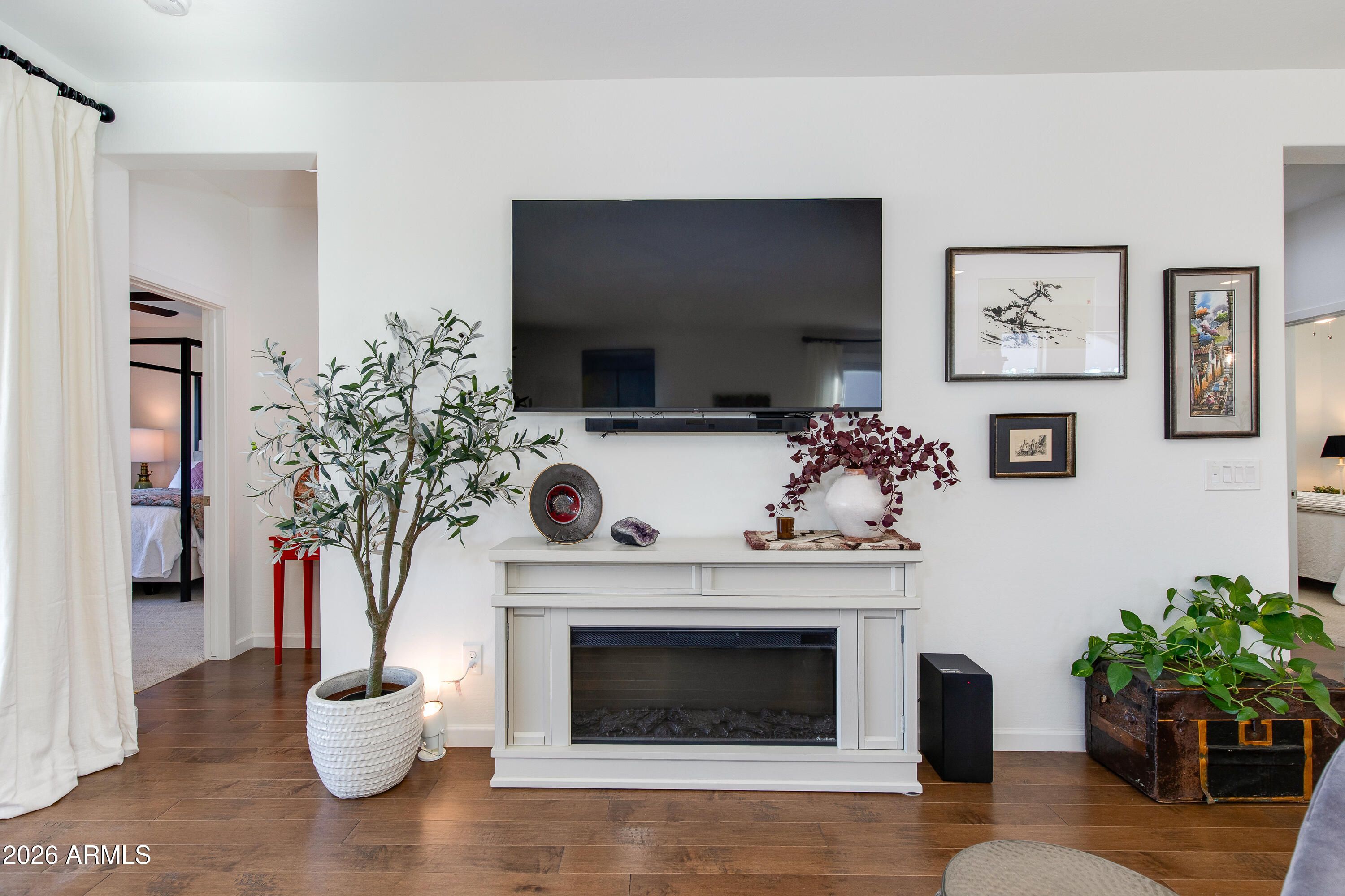 Thrive model by Shea Homes in Wickenburg Ranch! Light & bright 2BD/2BA+den in quiet Horseshoe. Wood flooring throughout w/upgraded carpet in bedrooms. Den w/custom built-in desk. Chef's kitchen w/white upgraded cabinets, quartz counters, custom tile backsplash & built-in GE appliances incl 5-burner gas cooktop. Soft-close wood drawers, pullouts, built-in recycling & upgraded hardware. Spacious primary suite w/upgraded bath: custom shower tile & heavy glass enclosure. Both baths feature quartz tops, custom tile, mirrors & upgraded lighting. Covered patio w/mechanical sunshades extends outdoor living. Backyard oasis w/travertine, custom turf, built-in BBQ & fire pit. Morning coffee in the shade, evening cocktails by the fire—this is the kind of backyard that turns weekdays into weekends Now