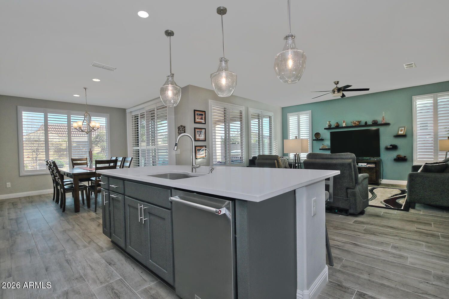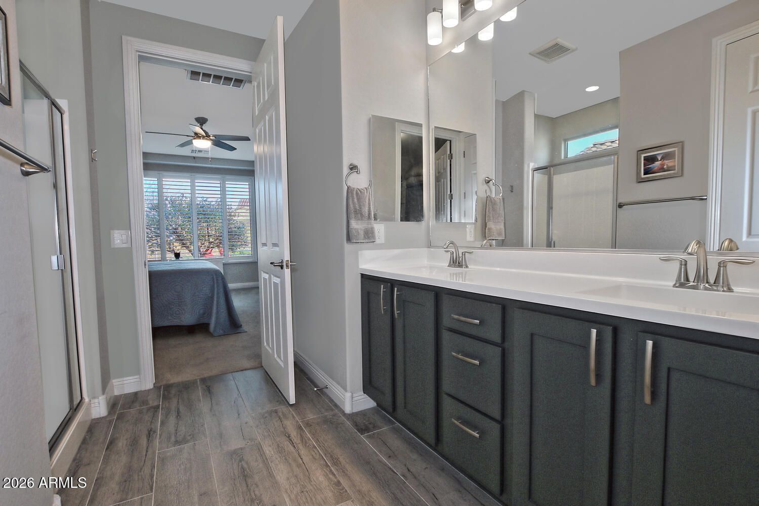 Experience resort style living in this stunning Sanctuary model featuring 2 bedrooms, 2.5 baths, w/versatile den—perfect for a home office or private retreat. Designed with sophistication in mind, this home showcases tray ceilings, plantation shutters, and upgraded tile flooring throughout. The gourmet kitchen is beautifully appointed with quartz countertops, stainless steel appliances and beautiful pendant lights, blending style and function seamlessly. The primary suite is a serene escape with a charming bay window creating an elegant sitting area. A private ensuite guest bedroom offers comfort and privacy. Enjoy seamless indoor-outdoor living on the backyard patio complete with motorized shades. A 4-foot garage extension adds valuable storage and convenience to this exceptional home.