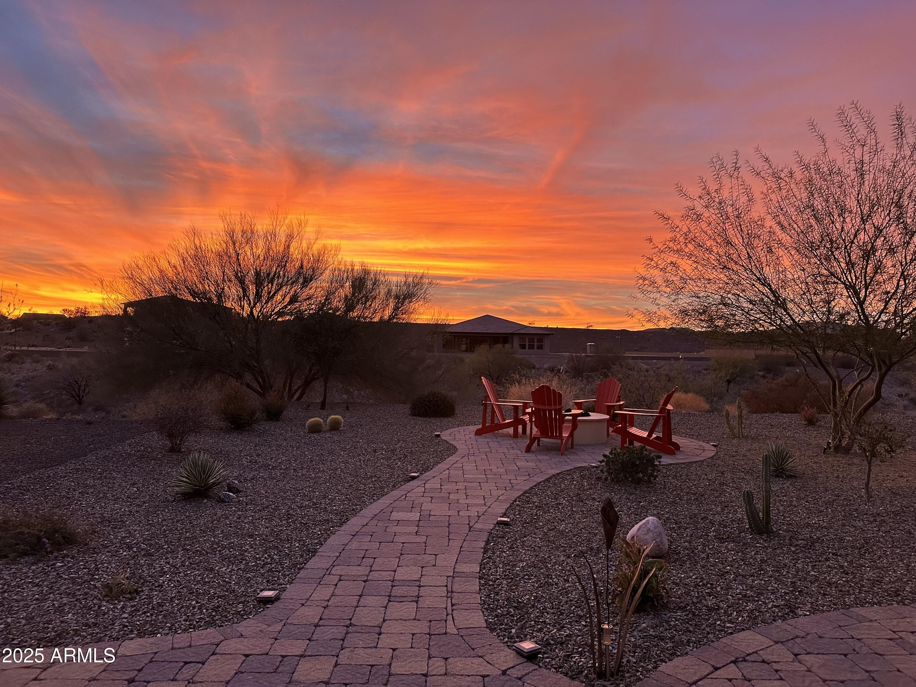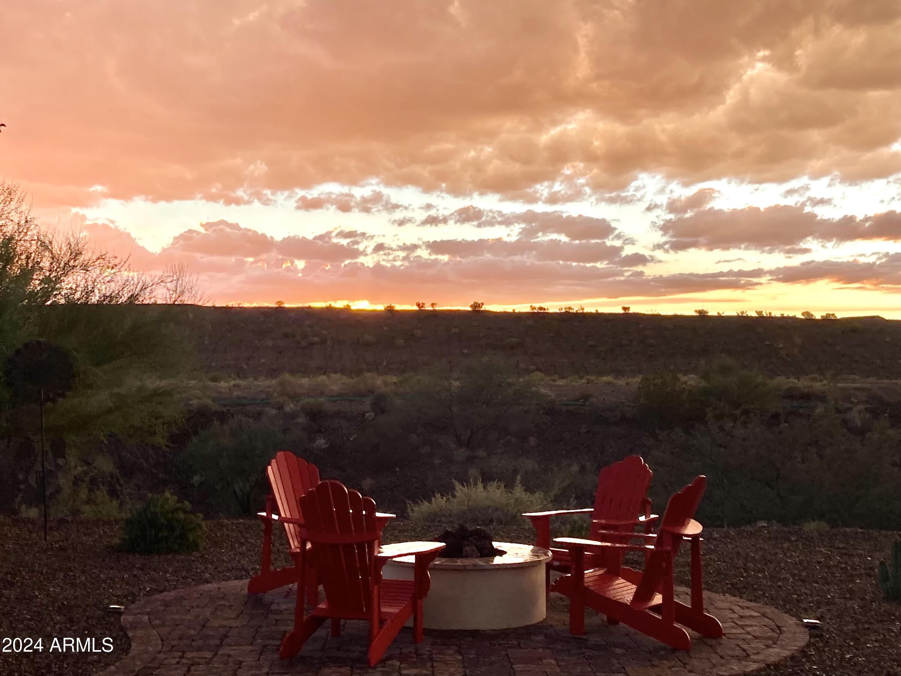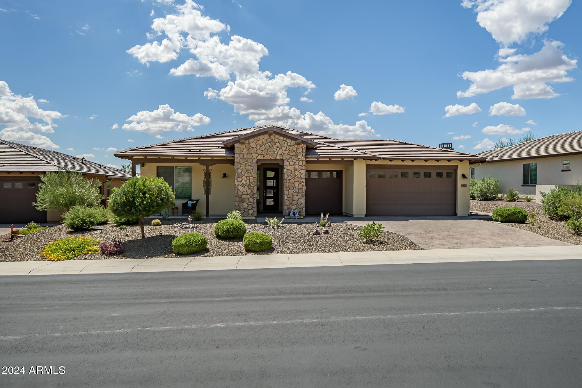 Key features of this home are the hard to find THREE CAR garage perfect for an extra car, golf cart or workshop; PAID Solar so no worries about the increasing costs of electricity. This nearly new home featuring an oversized lot offering backyard and front yard privacy and breathtaking sunsets! Enjoy the serenity of the open desert from your patio, perfect for relaxing and entertaining, with firepit views of the amazing Vulture Peak and a BBQ station for grilling. Two bedrooms, two bathrooms AND a Den that can easily be used as an extra bedroom or office. You will be captivated by the popular open floor plan, featuring a kitchen with multiple upgrades including elegant quartz countertops, a beautiful backsplash, and a convenient beverage fridge. Check out all the upgrades this beautiful home has included with the photos. The large kitchen island/breakfast bar seamlessly connect to the great room, which boasts a 24-foot sliding door and a generous dining area. There are remote shades granting shade for the entire patio offering yet another room to enjoy. This home offers elegant plank ceramic tile accompanied by new luxury vinyl plank flooring in both bedrooms. No carpet! The split bedroom layout provides privacy with a huge master bath within the primary suite, complete with a large walk-in closet. The home has been meticulously maintained, reflecting pride of ownership and is in the highly sought-after Wickenburg Ranch community where you'll have access to walking trails, pickleball courts, year-round heated pool and spa, two golf courses and dining options for either an elegant dinner or a quick breakfast prior to a round of golf. Don't miss your chance to own this incredible property!