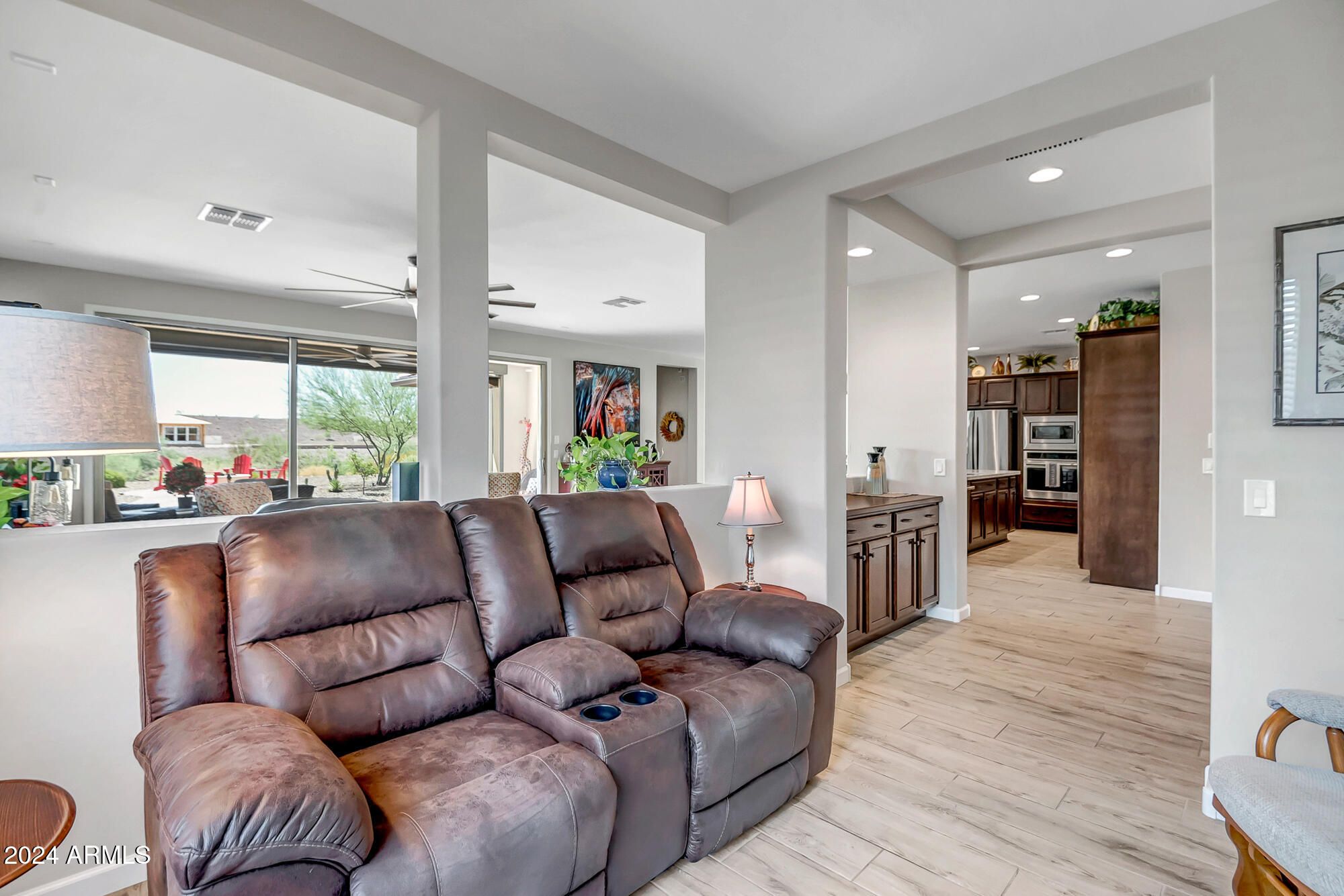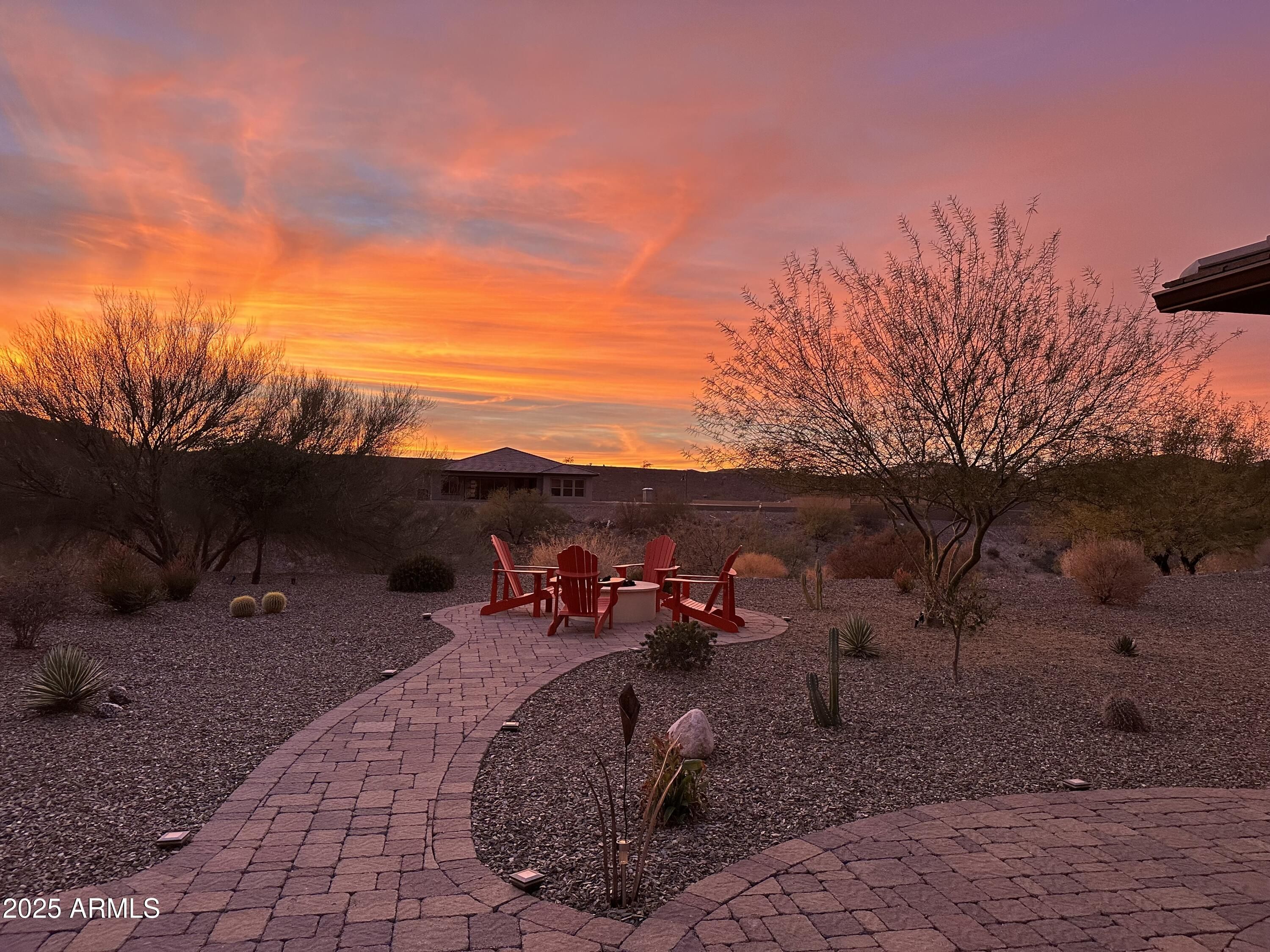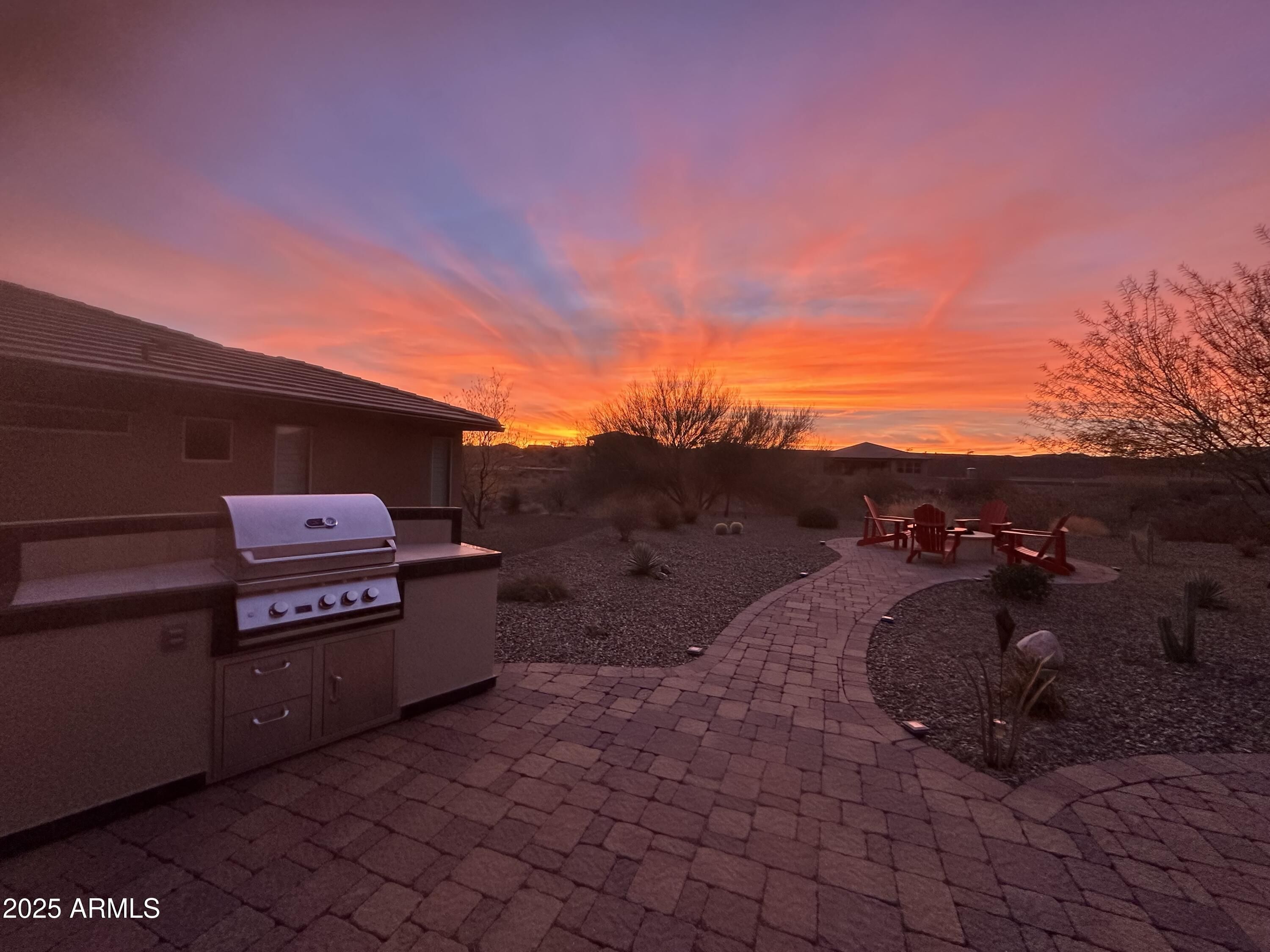 Key features of this home are the hard to find THREE CAR garage perfect for an extra car, golf cart or workshop; PAID Solar so no worries about the increasing costs of electricity. This nearly new home featuring an oversized lot offering backyard and front yard privacy and breathtaking sunsets! Enjoy the serenity of the open desert from your patio, perfect for relaxing and entertaining, with firepit views of the amazing Vulture Peak and a BBQ station for grilling. Two bedrooms, two bathrooms AND a Den that can easily be used as an extra bedroom or office. You will be captivated by the popular open floor plan, featuring a kitchen with multiple upgrades including elegant quartz countertops, a beautiful backsplash, and a convenient beverage fridge. Check out all the upgrades this beautiful home has included with the photos. The large kitchen island/breakfast bar seamlessly connect to the great room, which boasts a 24-foot sliding door and a generous dining area. There are remote shades granting shade for the entire patio offering yet another room to enjoy. This home offers elegant plank ceramic tile accompanied by new luxury vinyl plank flooring in both bedrooms. No carpet! The split bedroom layout provides privacy with a huge master bath within the primary suite, complete with a large walk-in closet. The home has been meticulously maintained, reflecting pride of ownership and is in the highly sought-after Wickenburg Ranch community where you'll have access to walking trails, pickleball courts, year-round heated pool and spa, two golf courses and dining options for either an elegant dinner or a quick breakfast prior to a round of golf. Don't miss your chance to own this incredible property!