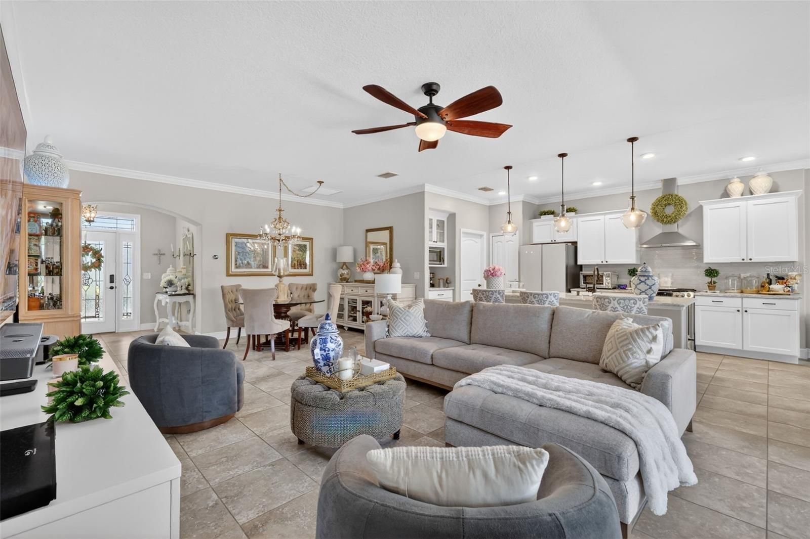 - Ceiling Fan(s), Crown Molding, High Ceilings, Living/Dining Room, Open Floorplan, Stone Counters, Walk-In Closet(s)