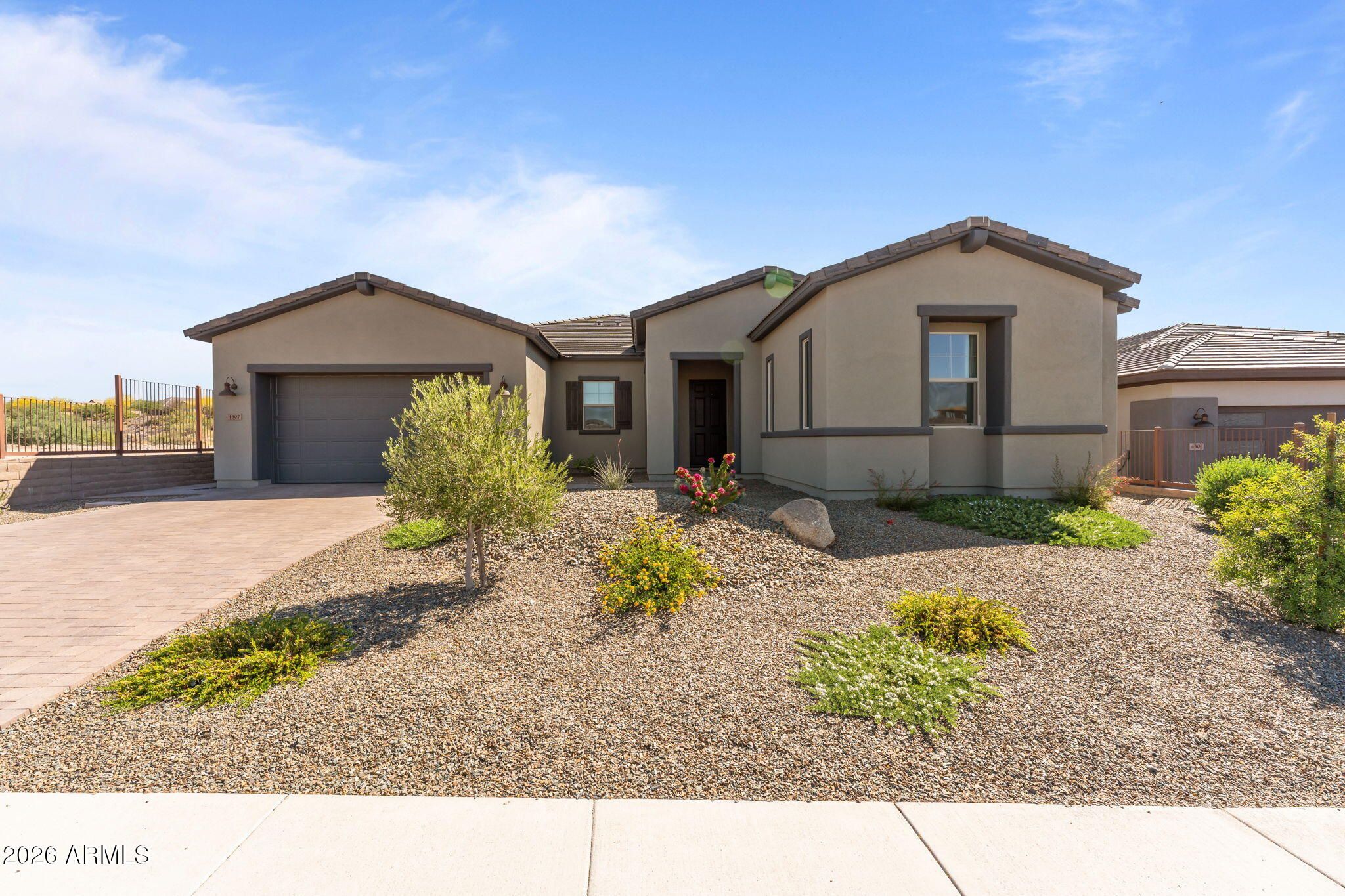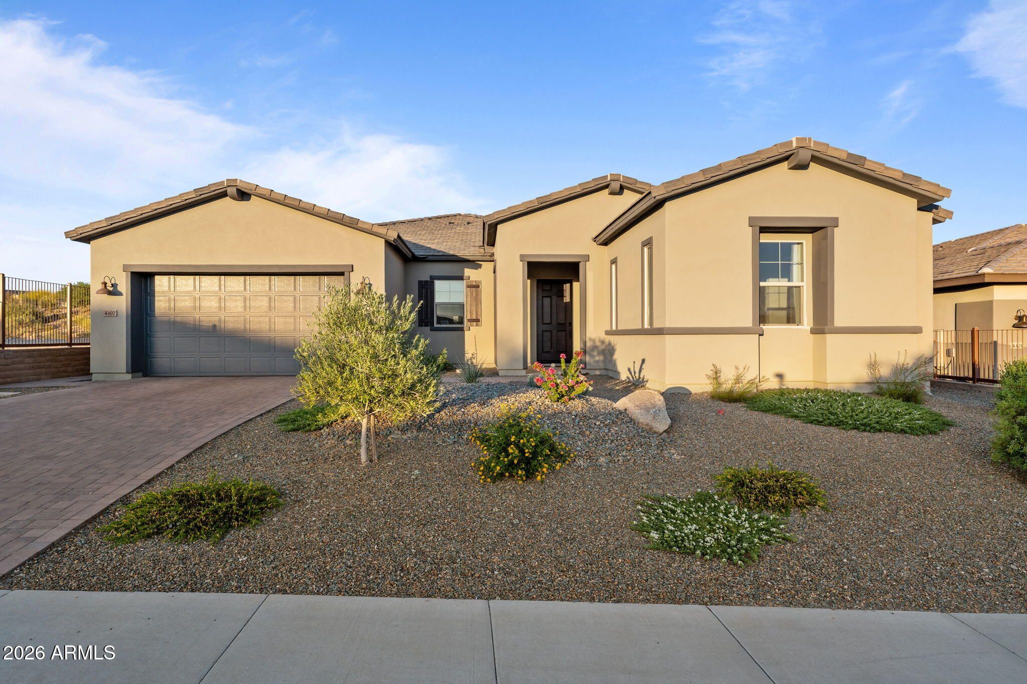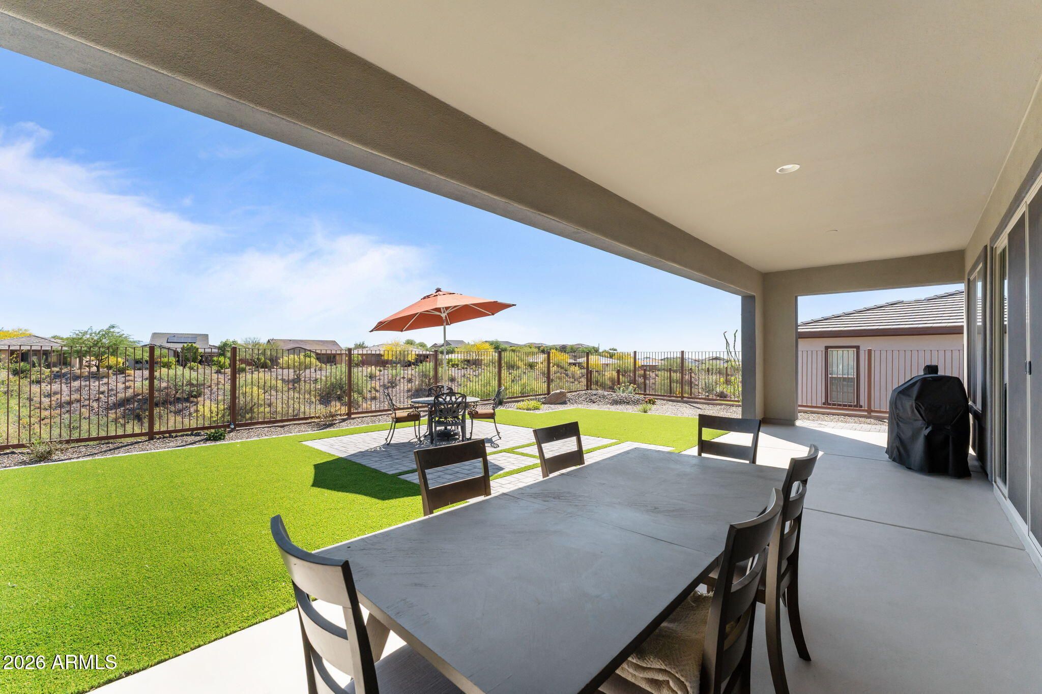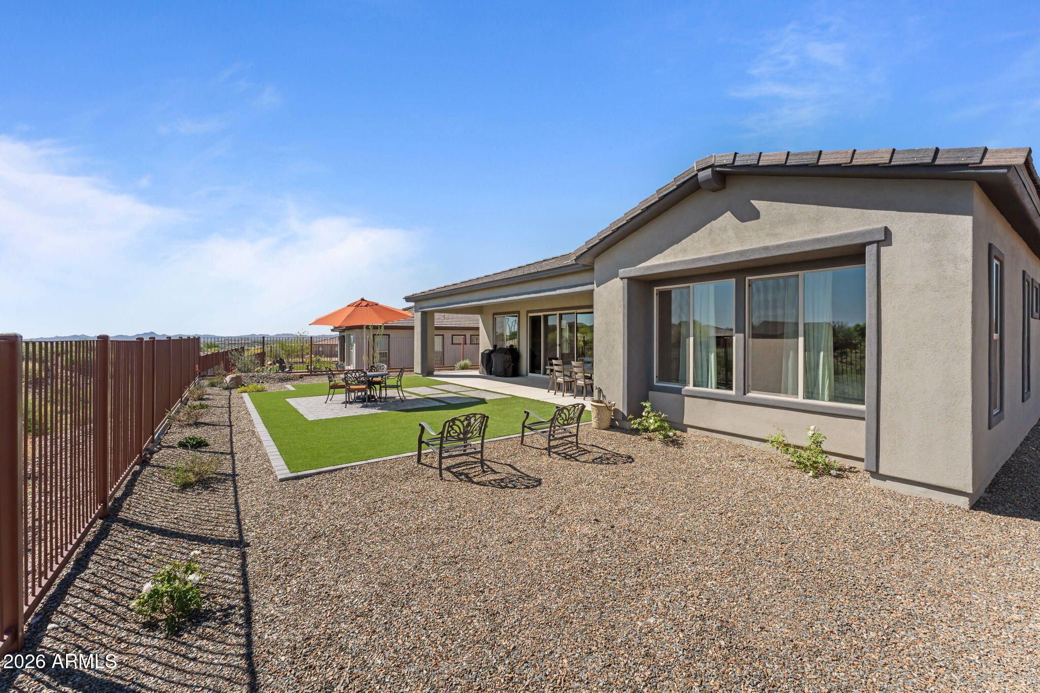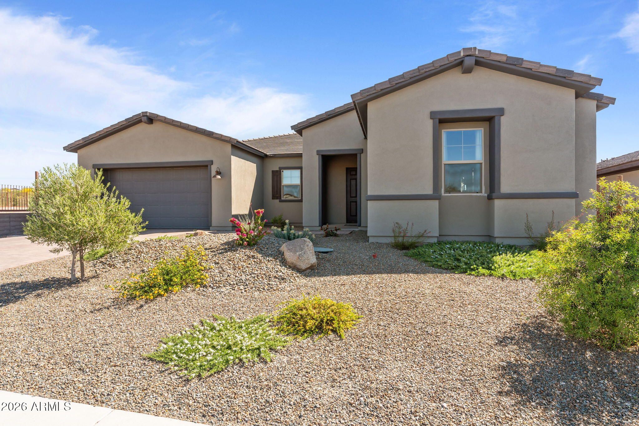 Sophisticated Cordoba Plan on an elevated lot with stunning desert views. This 2,861 sq ft home offers 3BD/3.5BA which includes a private attached Guest Suite featuring 1BD, 1-full BA, living space & kitchenette - ideal for guests or multigenerational living. The modern kitchen boasts granite countertops, a large island, pull-outs, high-end appliances, and oversized walk-in pantry. Enjoy a spacious living room with a unique conversation area, plus a versatile office/den. The primary suite offers a spa-like bath with an oversized shower and soaking tub. Large windows fill the home with natural light. Outdoor living shines with a covered patio and lush artificial turf set against a beautiful Arizona desert backdrop. Multi-zoned heating/cooling for max. comfort & excellent efficiency.