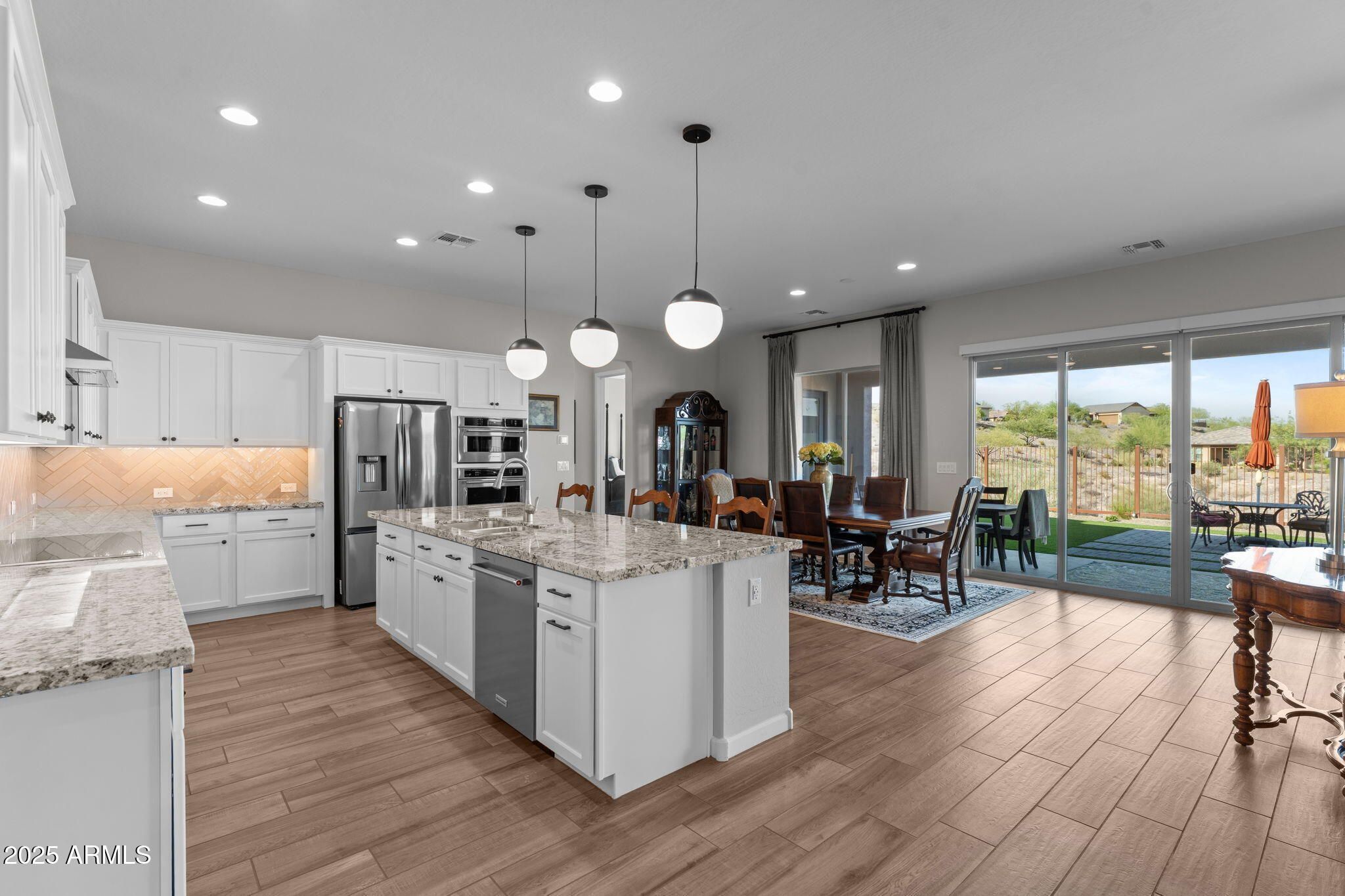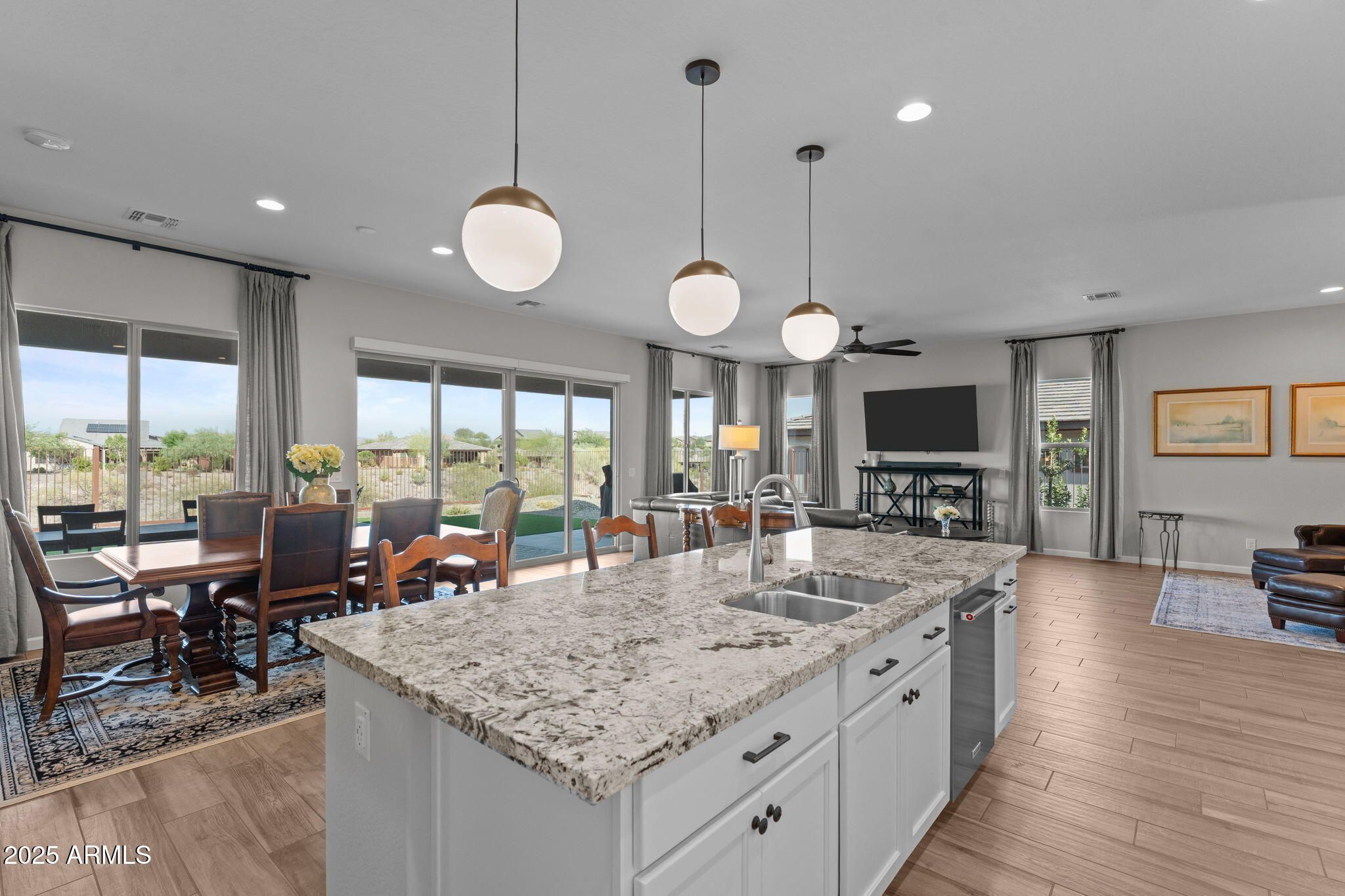Step into this beautifully designed, like-new home offering 2,861 sq feet of sophisticated living space. Built only a year ago, this residence combines modern comfort with thoughtful functionality. The main section of the home features 2 spacious ensuite bedrooms and 3.5 bathrooms. The private casita provides an ideal retreat for guests or extended family, complete with its own sitting room, en suite bathroom, walk-in closet, and convenient beverage center. The heart of the home is the stunning upgraded sparkling white kitchen, offering a clean, modern aesthetic with ample cabinetry and counter space, perfect for cooking, entertaining, or gathering with friends and family. The open floor plan is enhanced by upgraded wood look tile flooring throughout the main living areas of the home. The luxurious primary bathroom features beautiful ceramic tile, a relaxing drop-in tub, and elegant finishes that create a spa-like experience. A upgraded fully built out smart space adds flexibility, ideal for a home office, hobby area, or extra storage. Situated on a large, fully fenced lot backing to a desert wash, the home offers privacy and plenty of room to enjoy the outdoors, along with a 2-car garage for everyday ease and convenience. Best of all, this home is ideally located in the brand new Homestead neighborhood.