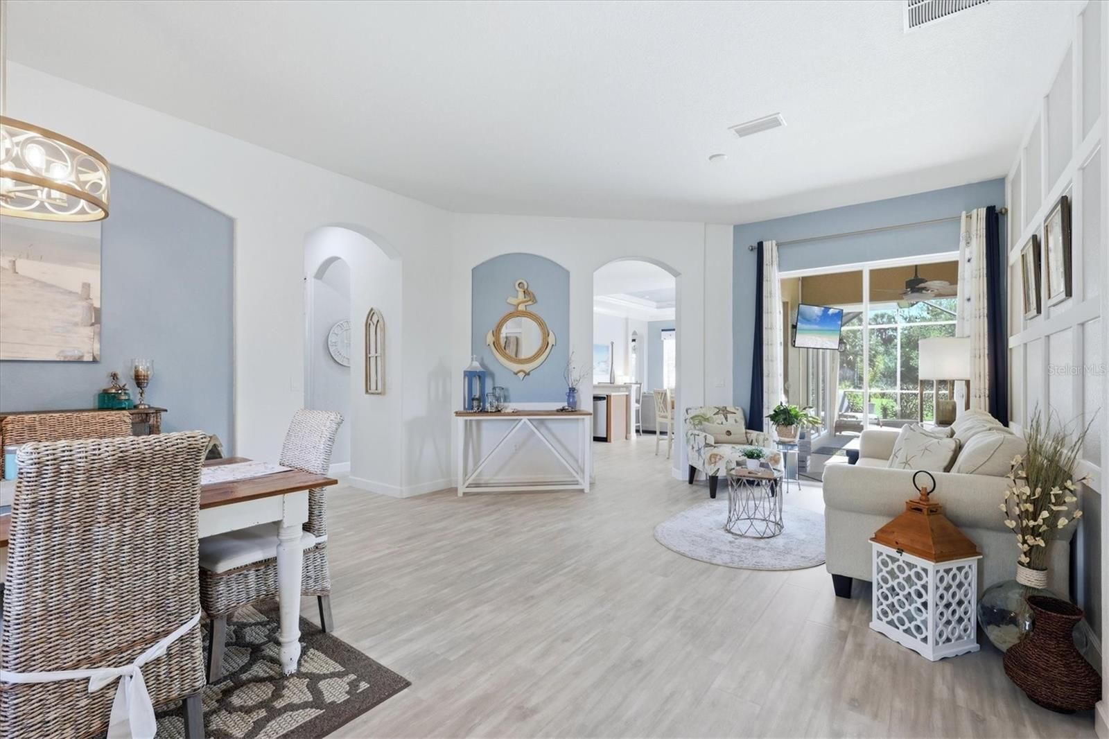 Welcome to luxury living in the highly sought-after River Strand Golf & Country Club, where elegance, comfort, and breathtaking surroundings come together in this beautifully updated 4-bedroom, 3-bathroom, 3-car garage, pool and spa home. From the moment you arrive, you'll notice the impressive curb appeal, enhanced by freshly painted exterior, upgraded landscaping, sealed driveway and stylish new exterior lighting. Step inside to a completely refreshed interior featuring fresh paint throughout, newer carpet, gorgeous luxury vinyl plank flooring and crown molding that flows seamlessly through the home. The living and dining areas are elevated with custom accent wall detailing, while updated light fixtures, ceiling fans, and window treatments add a modern, polished touch throughout. The kitchen shines with a newly added backsplash and updated faucet, making it both functional and visually appealing. The thoughtfully upgraded laundry room includes added cabinetry and wainscoting which add to the storage and elegant style. The guest bathroom has been beautifully remodeled with a new vanity, mirror, faucet, lighting, and fresh paint, along with the addition of a sleek shower door. Step outside to your private oasis, featuring a sparkling pool and spa with a new pool pump, plus a rescreened lanai for uninterrupted relaxation. The backyard offers serene water views and backs up to a peaceful conservation area, providing extra privacy and a spacious, open feeling rarely found. Addition upgrades include garage storage solutions, new window blinds, and numerous finishing touches that make this home truly move-in ready. Located in the gaited, maintenance-free River Strand Golf & Country Club, this home features the FULL GOLF MEMBERSHIP. As a resident you will enjoy resort-style amenities including championship golf, multiple pools, tennis, pickleball, fitness center, dining, and more. This is Florida living at its finest - schedule your private showing today!