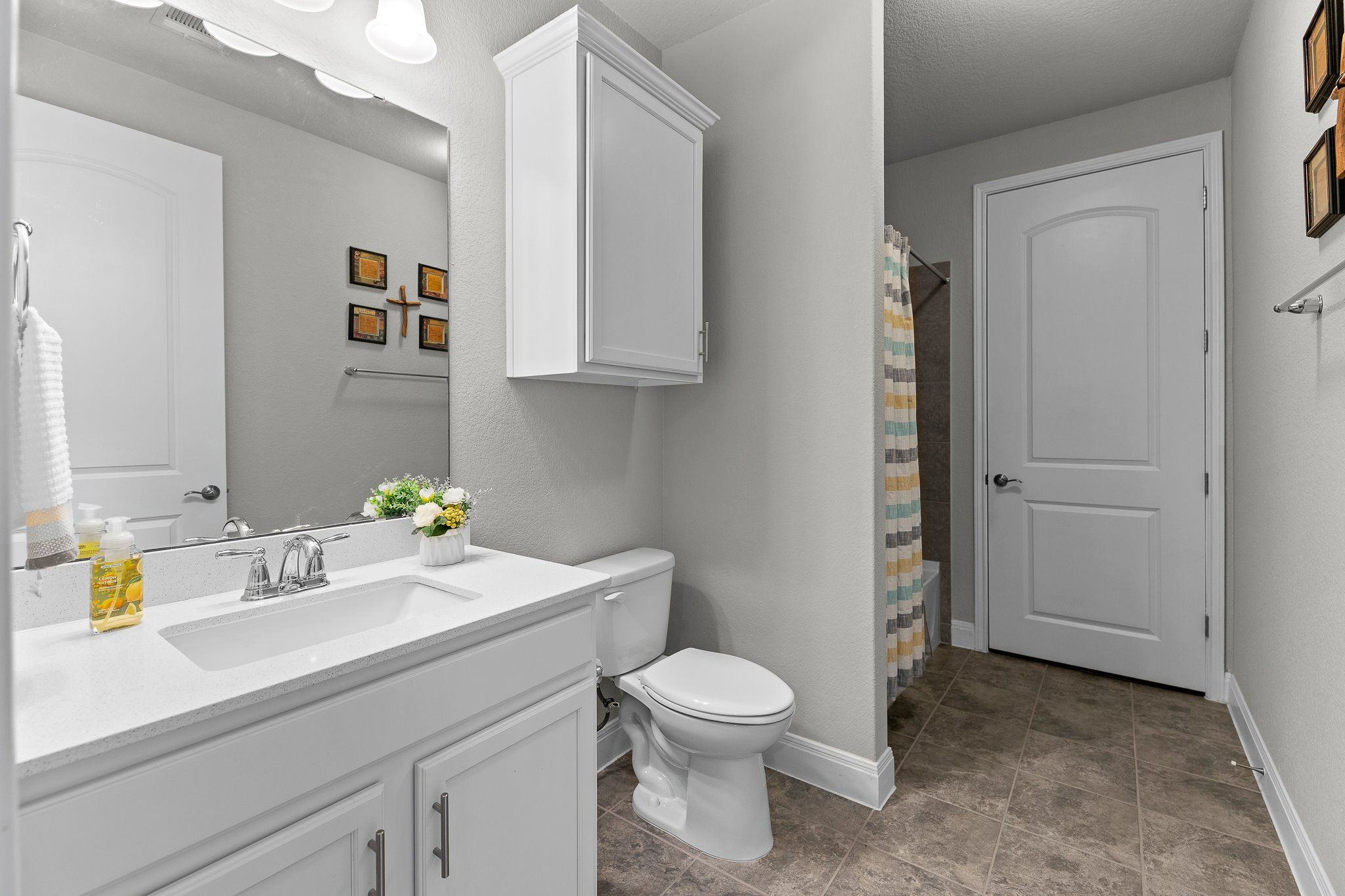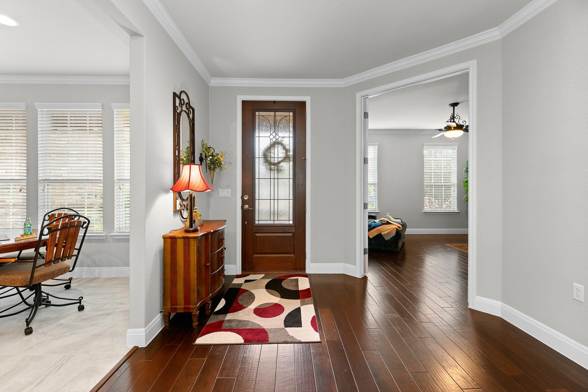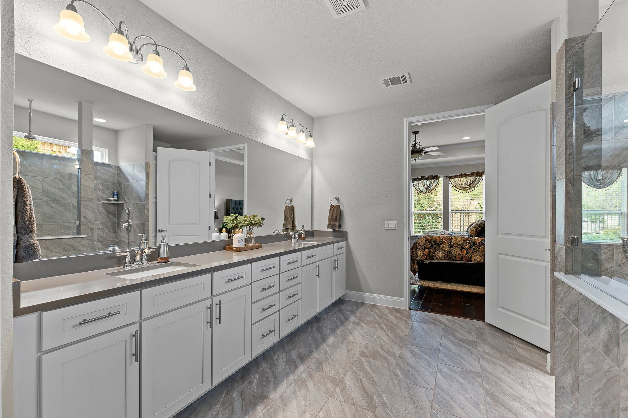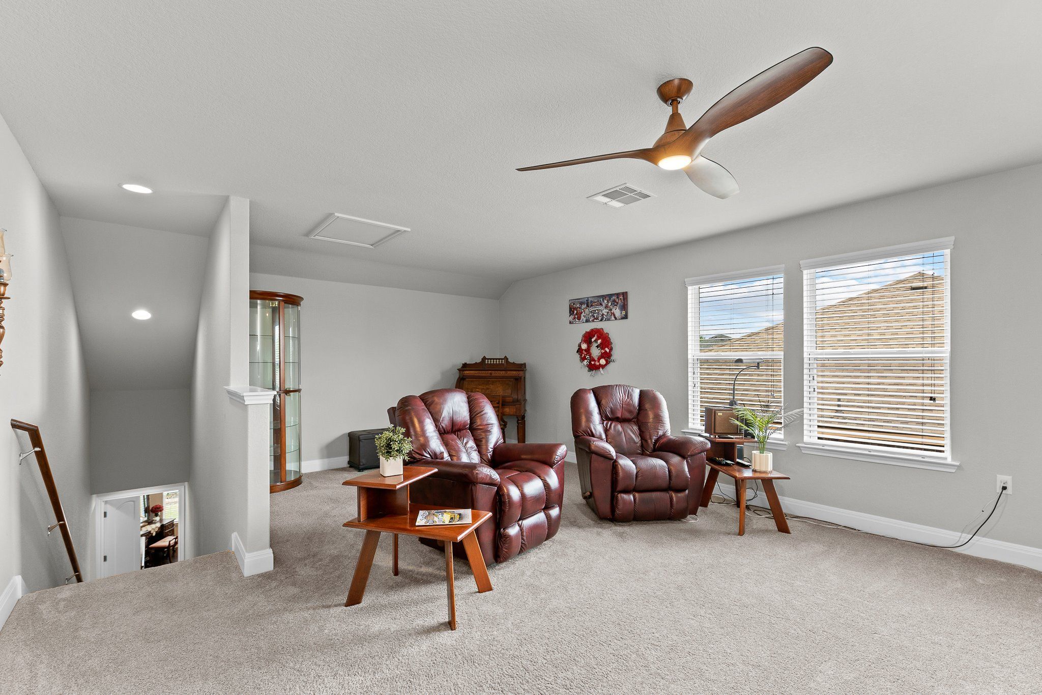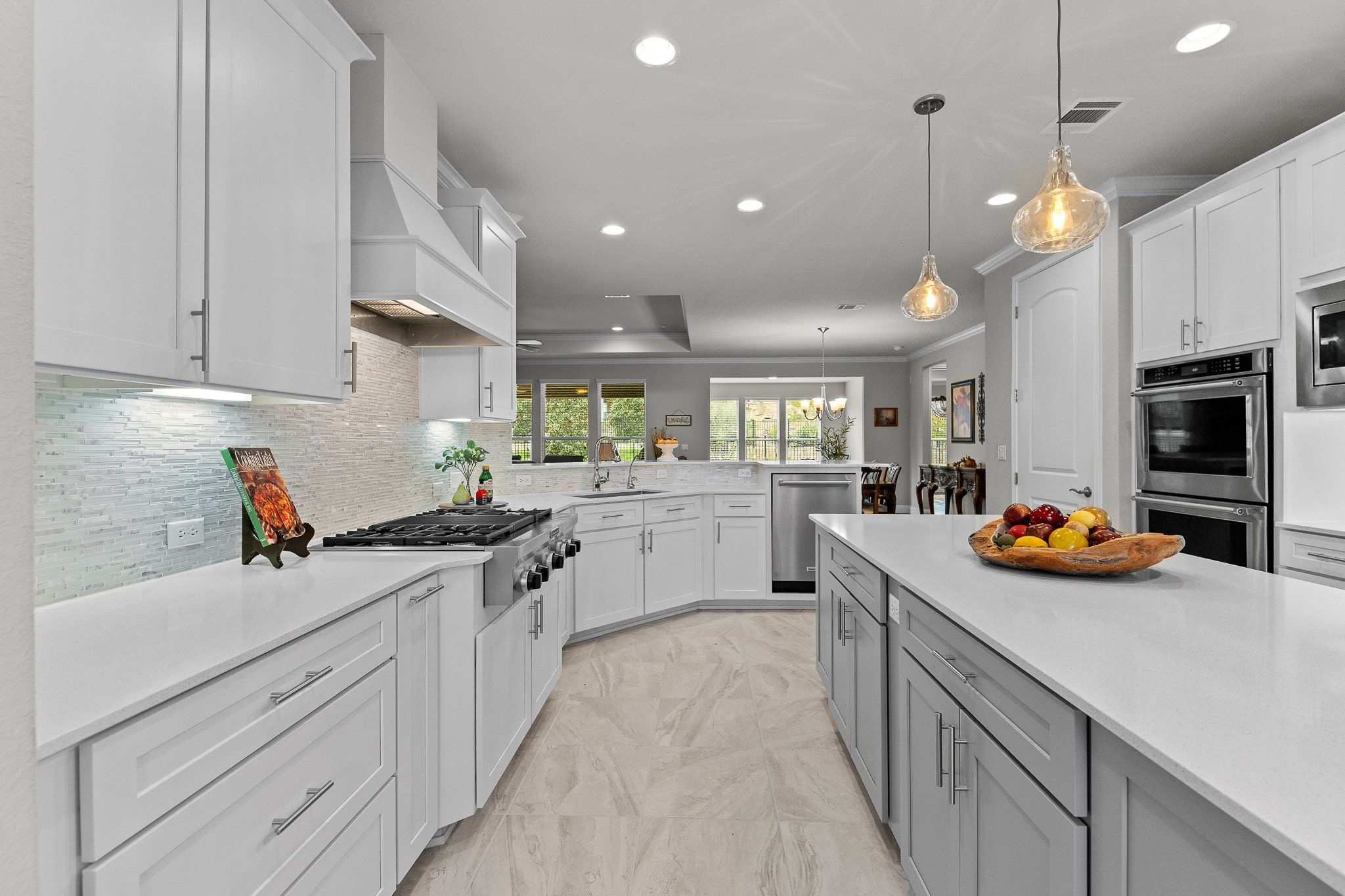 Need space? Welcome to your dream home in Sun City! This exquisite property offers a perfect blend of style and comfort. Step into a spacious living area with elegant hardwood flooring and a fantastic floor plan. The modern kitchen is a chef's delight, featuring quartz countertops, stainless steel Pro-Line Kitchenaid appliances including double ovens and a 36 inch gas cooktop, chimney hood, roll-outs in the base cabinets, and a large island, plus a huge pantry! The primary suite overlooks the landscaped backyard and features a tray ceiling and crown molding. The attached bath with a spa shower and dual vanities also is equipped with a fantastic storage cabinet as well as divided closet space with custom built-ins. A second bedroom downstairs can be an additional primary suite, or an en-suite for guests. The front office/flex space is conveniently located, and separate from the main living area. The sunroom extension currently houses a pool table, which can convey. Upstairs- is whatever you need it to be! Still working- you have full privacy. Are you a quilter? Plenty of room to spread out. Do you have guests/grandkids? Great space for them all- with a loft living area as well as a bedroom and bath? Or maybe you have a family member or roommate who would like a separate and private area? Outside, a fenced backyard on a ribbon greenbelt offers privacy and an extended covered porch is perfect for grilling, and outdoor gatherings. Another bonus is the tandem garage with 4 ft extension (2 cars + golf cart parking) with an epoxy floor, textured and painted walls, and baseboards. Water heaters (2) and garbage disposal replaced 2025.