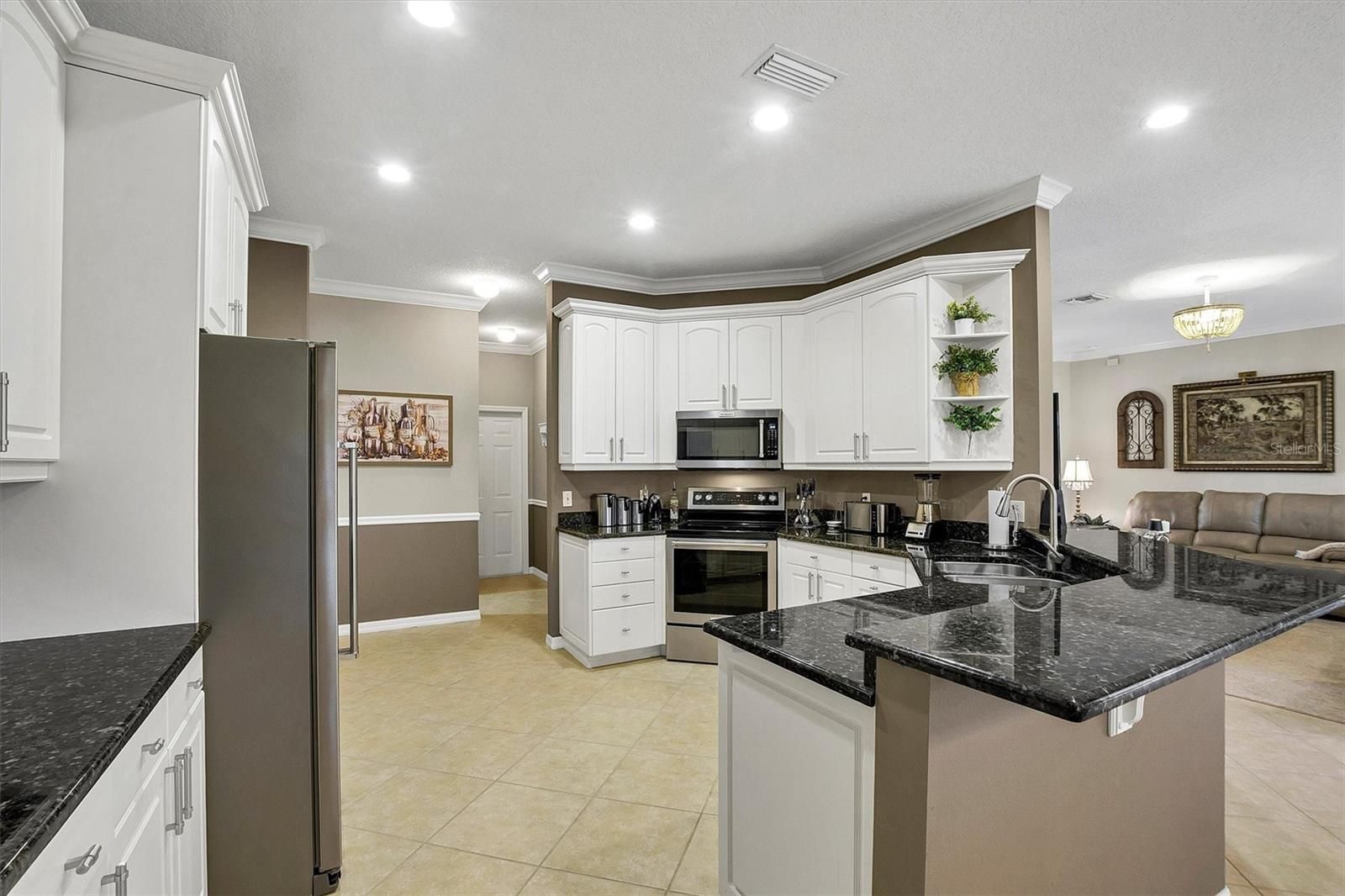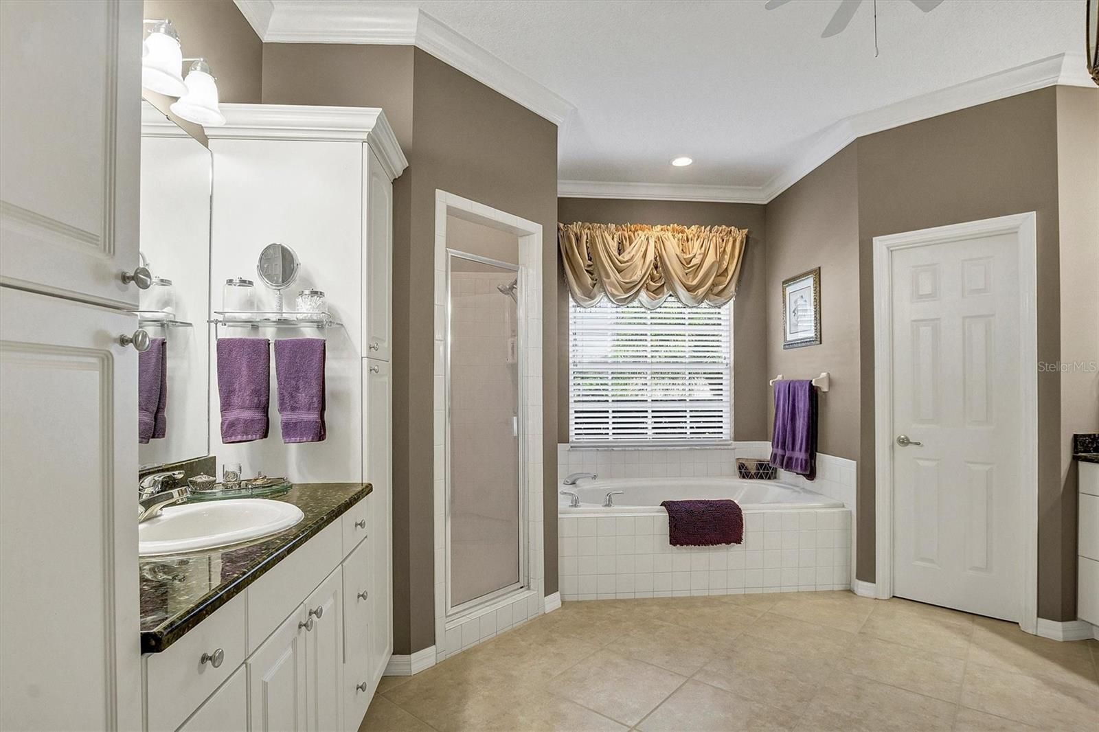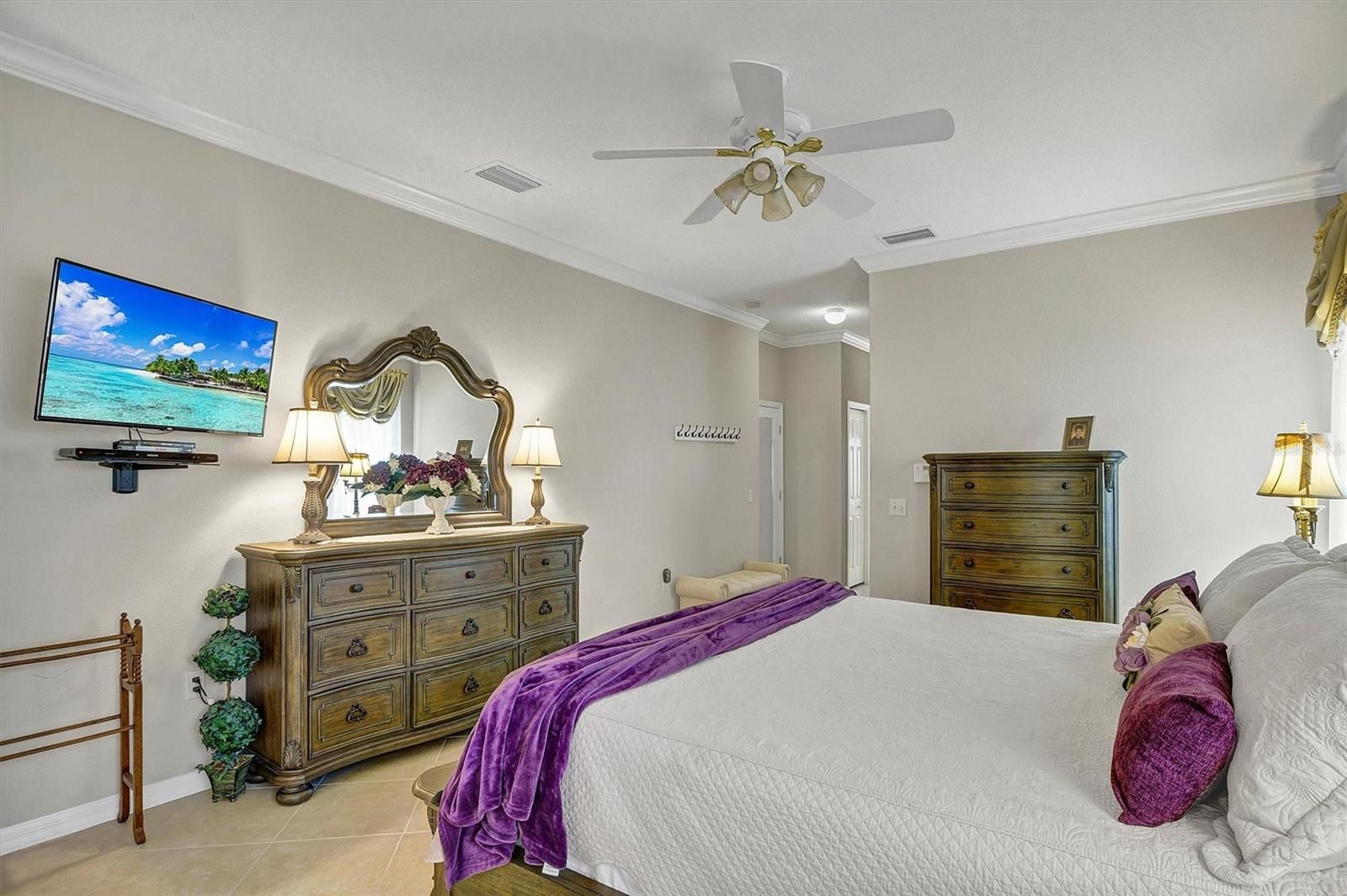 - Ceiling Fan(s), Crown Molding, Eat-in Kitchen, High Ceilings, Open Floorplan, Main Level Primary, Split Bedrooms, Stone Counters, Walk-In Closet(s), Window Treatments
