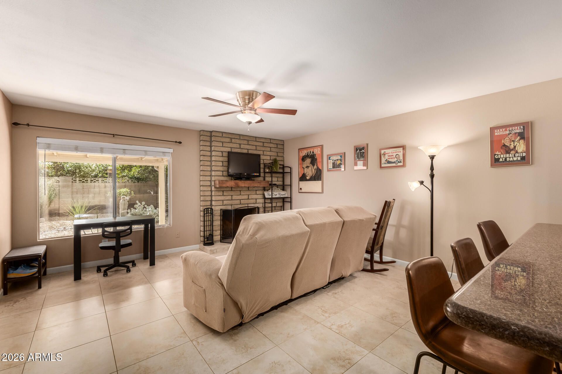 Become the proud owner of this lovely 2-bedroom residence in the vibrant adult Community of Ahwatukee! Discover an inviting living/dining room with a soothing palette and a harmonious blend of tile flooring and soft carpeting. The dedicated family room has a cozy fireplace for relaxing evenings with loved ones. Cook delicious meals in the kitchen, equipped with granite counters, ample wood cabinets, recessed lighting, built-in appliances, and a peninsula with a breakfast bar. You'll also find a bright sunroom for peaceful afternoons. The main bedroom features a make-up vanity, a closet with mirrored doors, and an ensuite with dual sinks. Unwind at the end of a long day in the backyard, showcasing a covered patio and a charming desert landscape. Don't miss out on this gem!