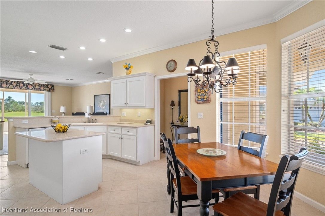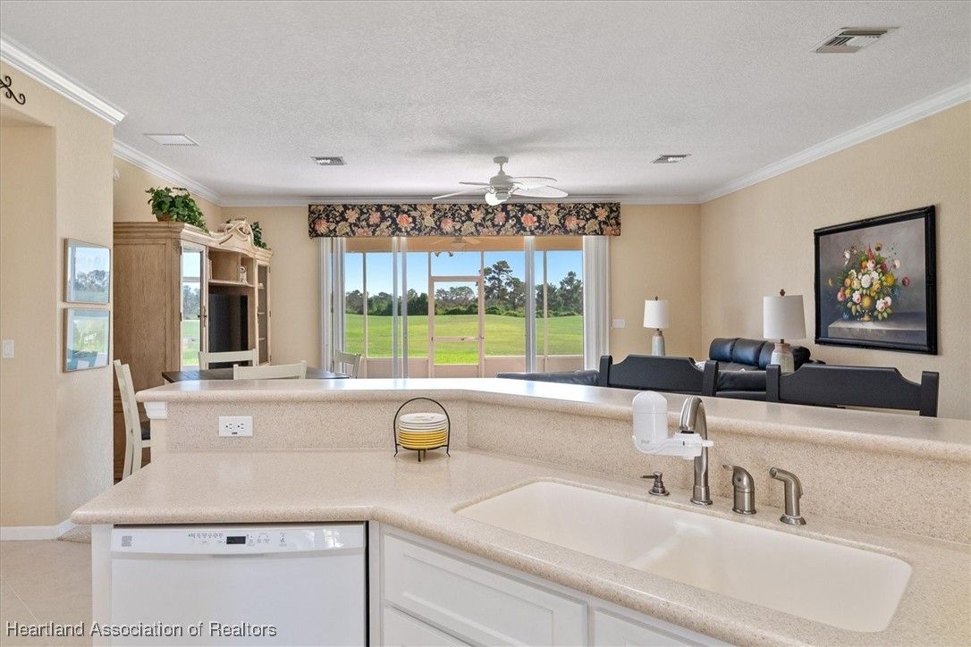 STUNNING VIEWS OF THE GOLF COURSE - Is what you'll see as soon as you open the front door of this beautiful, split plan, 3 bedroom, 2 bath home, nestled on a lovely cul-de-sac, with many exceptional features including *2023 rain gutters & landscape curbing *2018 roof *Paver drive, patio, walkways & inviting front porch *Well for irrigation *Side-load oversized 2-car garage w/8' door + golf cart door *Large & inviting foyer entry *High ceilings with crown molding *Bright white kitchen w/center island, solid-surface countertops, pantry & breakfast bar overlooking the living area with those fantastic views! *Primary suite w/wood laminate flooring, walk-in closet, his & her double sink vanity, corner shower & private water closet *Two nice-size guest bedrooms & bath *Inside laundry room & an extra bonus room that's perfect for an office, exercise or hobby space *Screened lanai in back + paver patio overlooking the golf course & plenty of room for a pool *PLUS, this home comes completely & BEAUTIFULLY FURNISHED! *AND you're sure to enjoy all the amenities offered in this gated, 55+ golfing community with clubhouse, pools, tennis, pickleball and so much more *This is not just a home - it's a lifestyle!