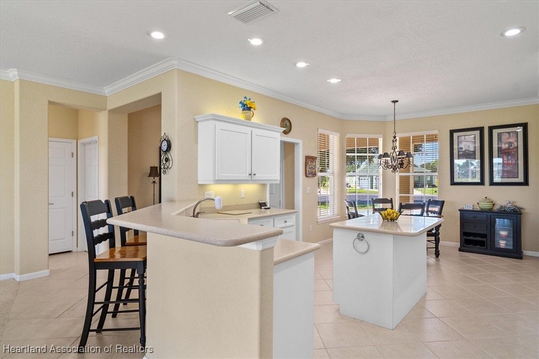 STUNNING VIEWS OF THE GOLF COURSE - Is what you'll see as soon as you open the front door of this beautiful, split plan, 3 bedroom, 2 bath home, nestled on a lovely cul-de-sac, with many exceptional features including *2023 rain gutters & landscape curbing *2018 roof *Paver drive, patio, walkways & inviting front porch *Well for irrigation *Side-load oversized 2-car garage w/8' door + golf cart door *Large & inviting foyer entry *High ceilings with crown molding *Bright white kitchen w/center island, solid-surface countertops, pantry & breakfast bar overlooking the living area with those fantastic views! *Primary suite w/wood laminate flooring, walk-in closet, his & her double sink vanity, corner shower & private water closet *Two nice-size guest bedrooms & bath *Inside laundry room & an extra bonus room that's perfect for an office, exercise or hobby space *Screened lanai in back + paver patio overlooking the golf course & plenty of room for a pool *PLUS, this home comes completely & BEAUTIFULLY FURNISHED! *AND you're sure to enjoy all the amenities offered in this gated, 55+ golfing community with clubhouse, pools, tennis, pickleball and so much more *This is not just a home - it's a lifestyle!
