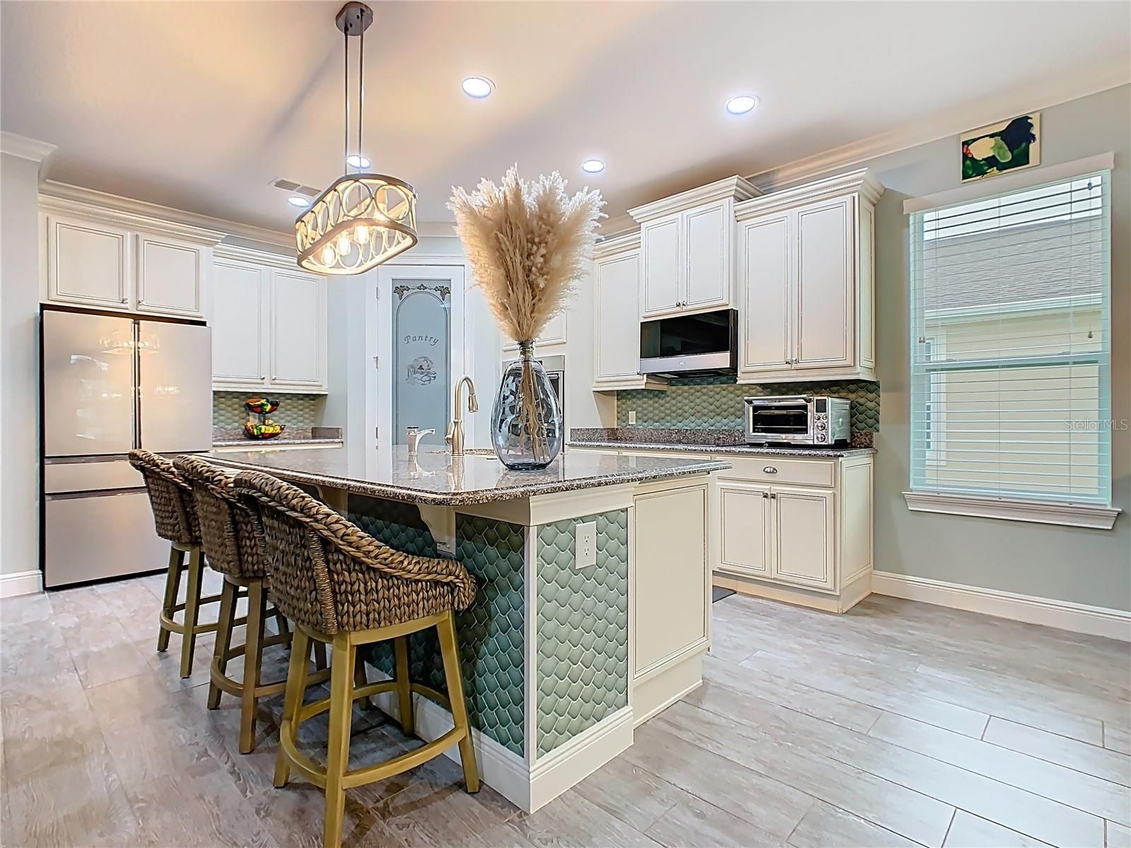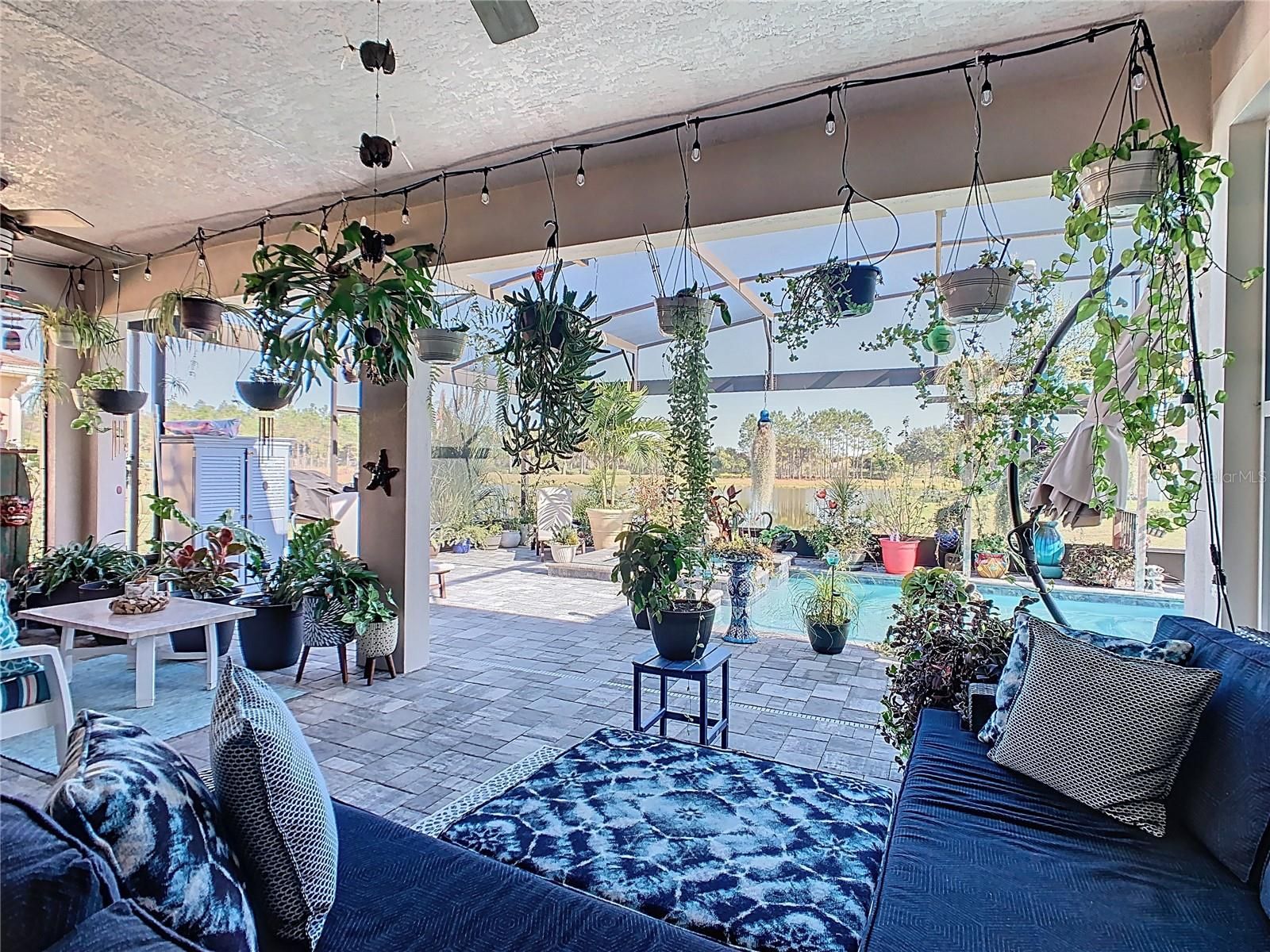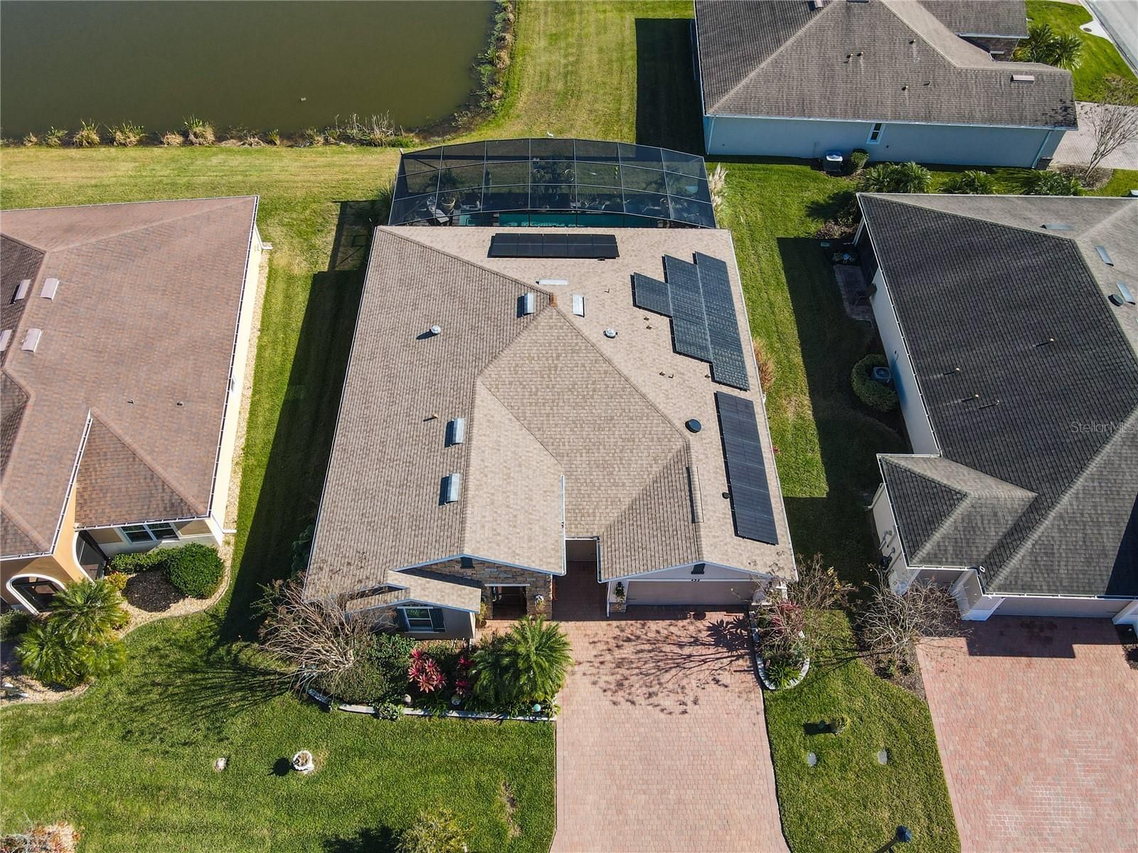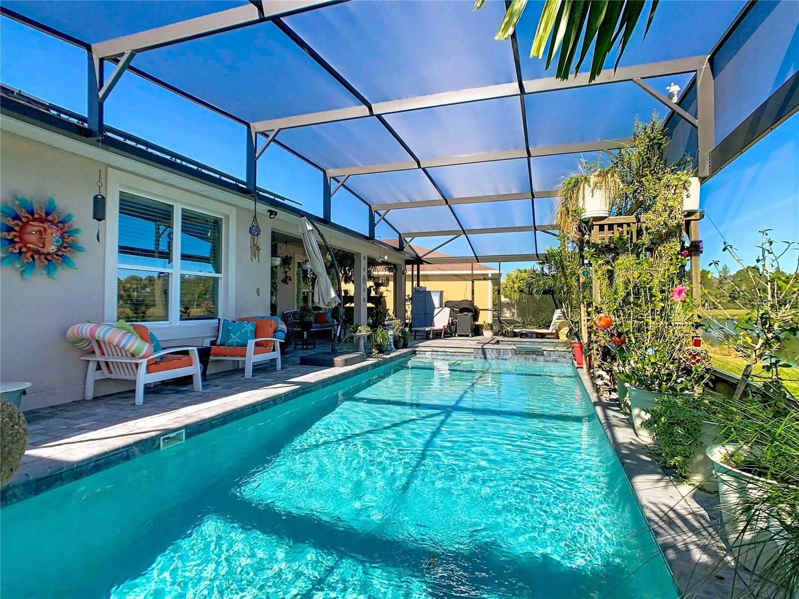 Exquisite WATERVIEW POOL HOME**SIENA** in Solivita. Step into pure LUXURY and experience the pinnacle of elegance from the moment you enter. This breathtaking, ONE-OF-A-KIND residence. is meticulously crafted to impress and intentionally designed to deliver that coveted “WOW” factor that will leave every guest speechless. Built in 2016, this MASTERPIECE DREAM HOME blends modern sophistication with true peace of mind. Its OPEN-CONCEPT DESIGN highlights UPSCALE finishes and thoughtful UPGRADES throughout. Step through the door and unveil 2,427 sq. ft. of luxurious interior living (3,382 sq. ft. total area) Featuring THREE spacious bedrooms, TWO full bathrooms, a powder room, and a FLEX ROOM perfectly suited for a home office, craft room, or private GYM. Striking EXTERIOR STONE ACCENTS deliver an instant feeling of exclusivity. Beautifully UPGRADED LANDSCAPING, complete with a vibrant FLOWER BED and elegant CURBING AROUND THE HOUSE, enhances the home’s appeal. An expanded TWO-CAR GARAGE plus a dedicated GOLF CART BAY. A grand hallway featuring a TRAY CEILING and striking leaded glass door establishes an atmosphere of elevated living. The CUSTOM ENTRY CABINET adds both beauty and convenience, serving as a perfect drop zone. Additional EXTERIOR LIGHTING enhances both curb appeal and nighttime visibility. The GOURMET KITCHEN highlights an OPEN LAYOUT with a BREAKFAST BAR, SOFT-CLOSE CABINETRY, UNDER-CABINET LIGHTING, stylish PENDANT LIGHTS, An Insta-Hot system newly installed, and a spacious WALK-IN PANTRY with newly designed and installed PANTRY CABINETS. Versatile BREAKFAST NOOK offers the perfect spot for a wine bar or workspace. Premium STAINLESS-STEEL appliances elevate the space, complemented by a NEW BOSCH DISHWASHER, GE CAFE Profile refrigerator, TOP OF THE LINE GE microwave, and 2024 INDUCTION COOKTOP. A beautifully added BACKSPLASH enhances both the kitchen and the island. The adjoining dining room comfortably accommodates a six- to eight-person table. The OWNER’S SUITE offers a spacious private retreat, featuring TWO WALK-IN CLOSETS, an adjoining FLEX ROOM ideal for an office, den, study, or craft space, and an elegant EN-SUITE BATHROOM with DUAL SINKS, a FRAMELESS GLASS WALK-IN SHOWER, and a built-in bench for added comfort. All bedrooms received updated paint, new flooring, and custom closet organizers in 2024, along with updated light fixtures throughout. Every bathroom has been enhanced with newly refreshed cabinetry, creating a modern, unified feel. The resort-style POOL and SPA, set within the EXTENDED, COVERED and SCREENED LANAI with inviting spaces for both relaxation and entertaining, complete with ceiling fans. CENTRAL VACUUM system. The LAUNDRY ROOM shines with BRAND NEW-2024 APPLIANCES and CUSTOM-BUILT CABINETRY. A TOP-TIER LENNOX AIR HANDLER was installed in February 2024, ensuring comfort and efficiency. The property also boasts 16 **PAID-OFF** SOLAR PANELS, two solar tube lights, a NEW 2024 WATER SOFTENER, and a FULL INTERIOR REPAINT completed in 2024. All light switches in the living room, hallway, and kitchen have been upgraded to dimmable switches for enhanced ambiance and control. Both primary bedroom closets were elevated with tile backsplash, upgraded lighting, and elegant chandeliers. The laundry room also features a new tile backsplash for a refined, cohesive look. Additional upgrades include a smart lock at the front entry, a Ring camera, and new gutters and downspouts installed in 2024.