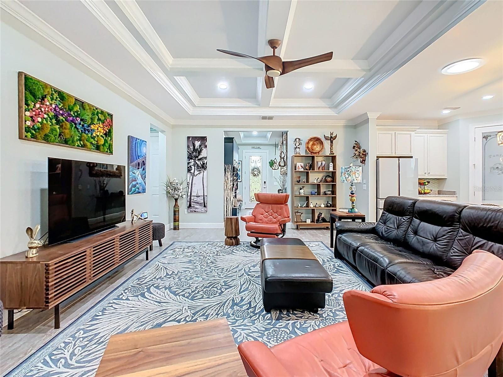 - Built-in Features, Ceiling Fan(s), Central Vacuum, Coffered Ceiling(s), Eat-in Kitchen, Kitchen/Family Room Combo, Open Floorplan, Main Level Primary, Solid Surface Counters, Solid-Wood Cabinets, Split Bedrooms, Thermostat, Walk-In Closet(s)