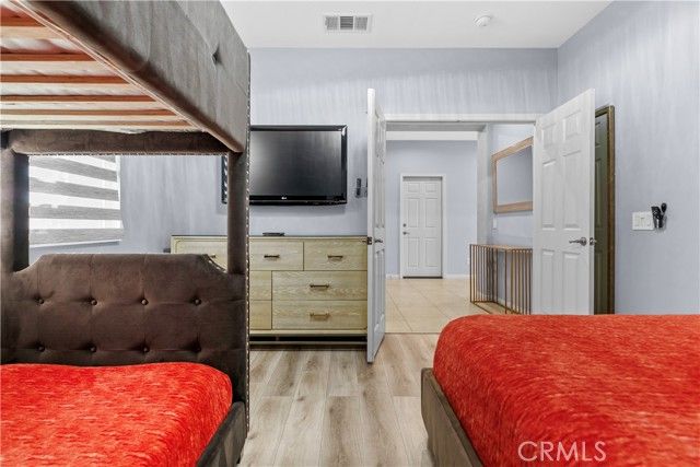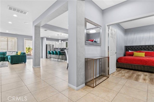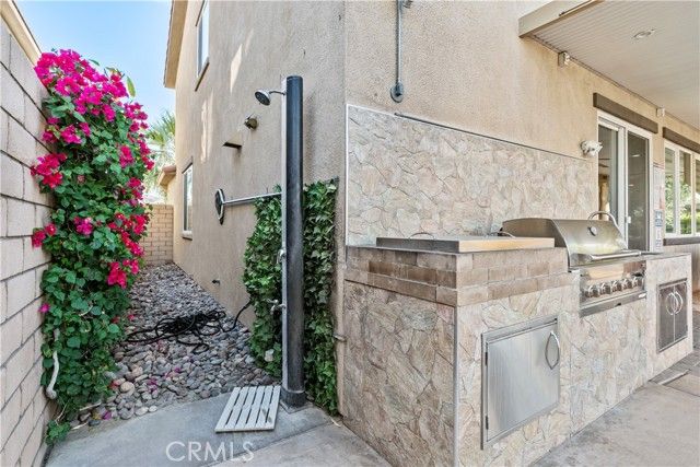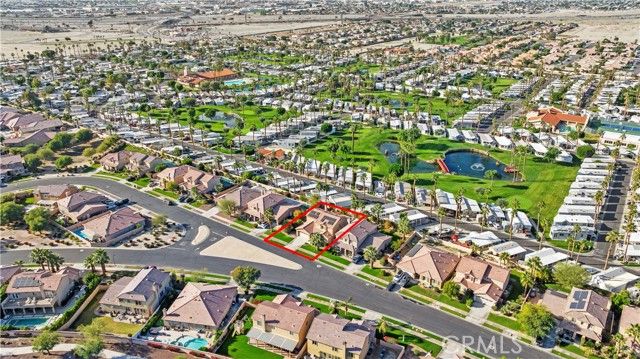Welcome to Terra Lago! Luxurious 2-story home with 5 bedrooms, 2.5 baths, and a full-size saltwater pool & spa. Fully licensed STR with stunning mountain, sunset & city-light views. Bright open floor plan features great room with fireplace and upgraded entertainer’s kitchen with quartz counters, gold-trim cabinetry, custom backsplash, farmhouse sink, stainless appliances, new fridge, built-in cooktop & breakfast island. Large dining area with built-in credenza, wine & beverage fridges. Ceramic tile & luxury laminate flooring—no carpet! Motion lighting, surround sound & custom fixtures throughout. Private yard with pavers, covered patio w/misters & fans, outdoor shower, BBQ island, fire pit, and new pool heater. Beautifully landscaped front & back. Leased solar (removable) plus 2-car garage & golf-cart space. Your desert oasis awaits!