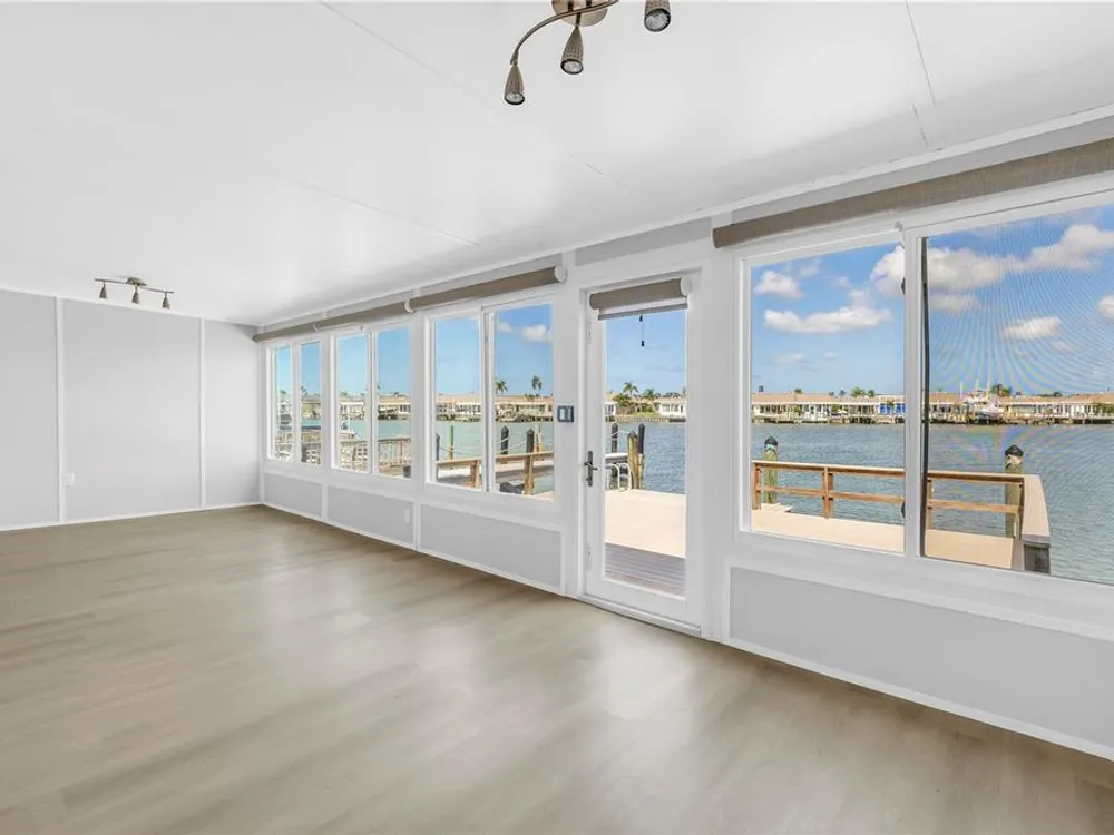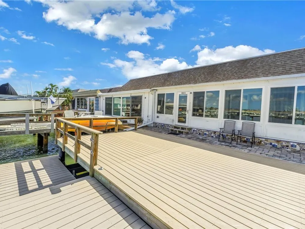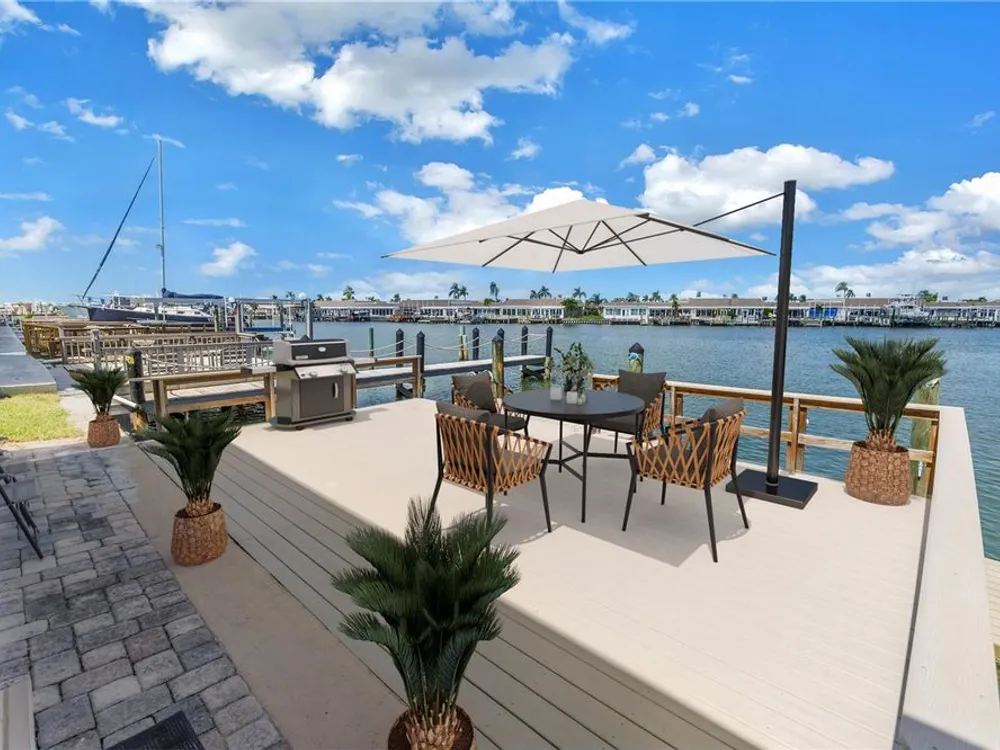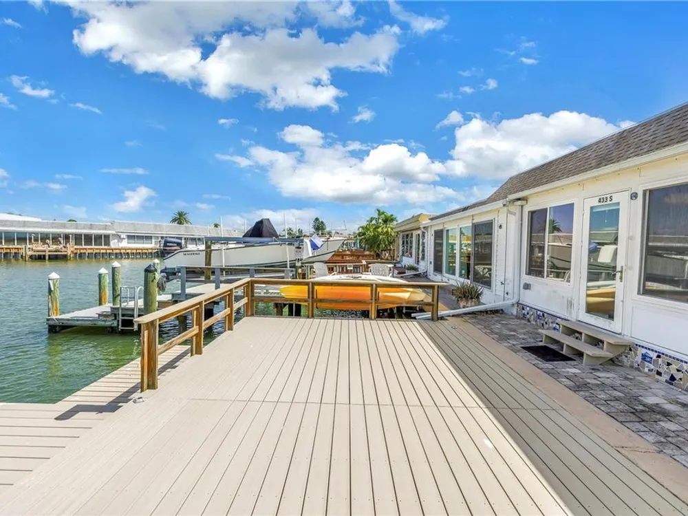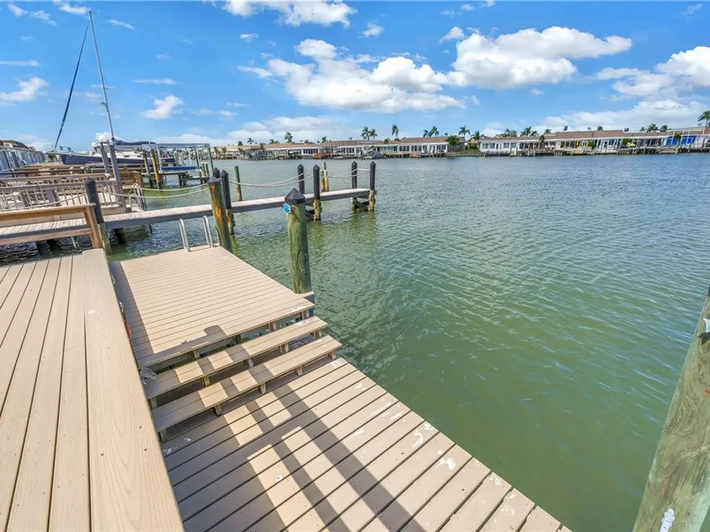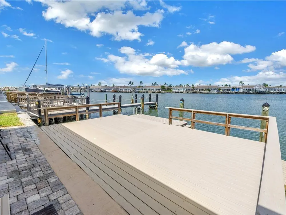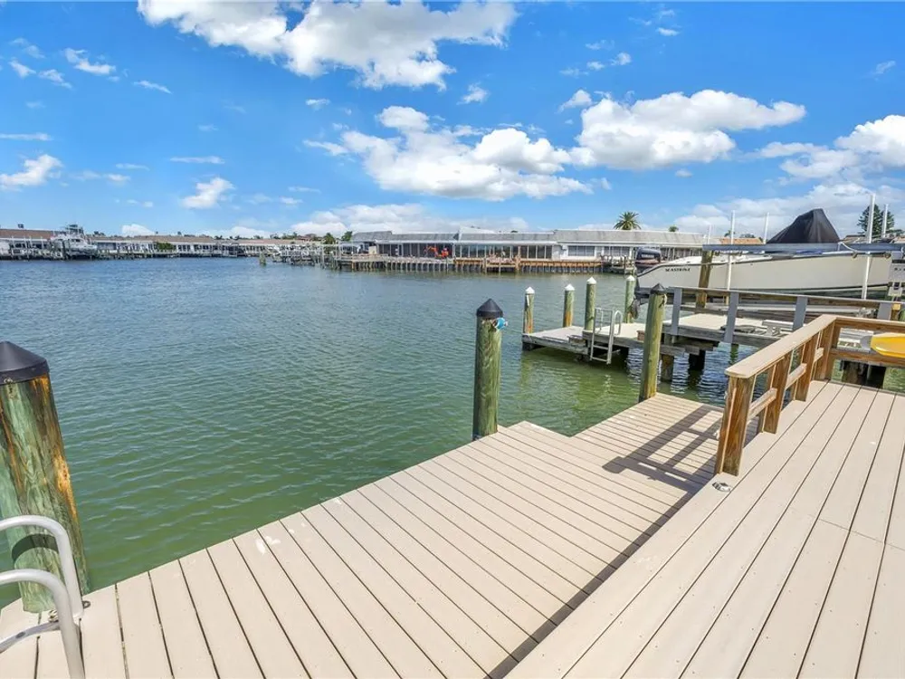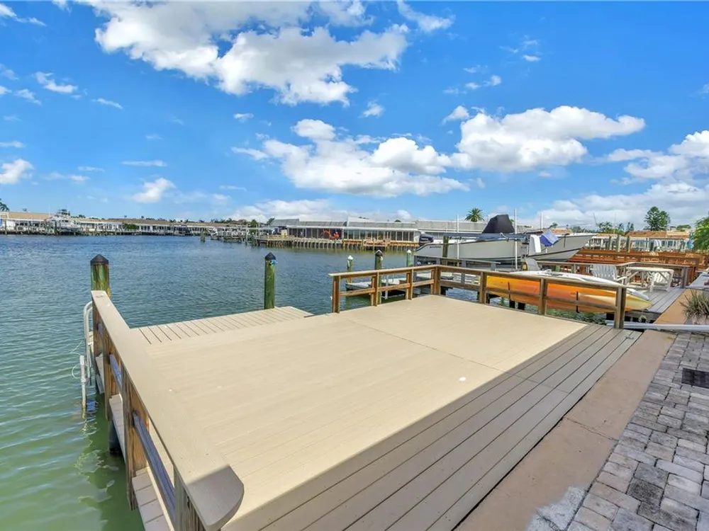 One or more photo(s) has been virtually staged. Welcome to Boca Ciega Point East, the hidden gem of 55+ waterfront living in beautiful Saint Petersburg! This stunning 2-bedroom, 2-bath end-unit villa is fully remodeled and move-in ready with over 1,400 sq ft of heated/cooled space and an oversized 1-car garage. Boasting luxurious wood-tone vinyl flooring, this home showcases designer touches from top to bottom. The kitchen is a showstopper with gorgeous blue wood cabinetry, sleek quartz countertops, gold hardware, stainless steel appliances, and an open layout that flows seamlessly into the dining and living areas. Natural light pours in through extra end-unit windows and glass sliders leading to both a private front patio and a huge back deck with boat dock. Enjoy sunset views, dolphin sightings, and fishing right from your backyard! The primary suite offers deck access, a large walk-in closet, and a luxurious en-suite bath featuring a quartz vanity, subway-tiled walk-in shower, glass doors, and penny-tile flooring. The second bedroom, located at the front of the home, provides direct access to the front patio—ideal for guests or a home office. Enjoy year-round resort-style amenities including a heated/cooled pool, tennis, pickleball, shuffleboard, and bocce courts. Two clubhouses are being fully renovated—one ready for social events by the end of October, and the other with a library, gym, and office space ready by November. Boca Ciega East is a gated, secure community, offering peace of mind and an active, social lifestyle. Don’t miss this rare opportunity to own a waterfront villa with boat access in a vibrant intracoastal community. Whether you're a full-time resident or a seasonal snowbird, this is Florida living at its finest!