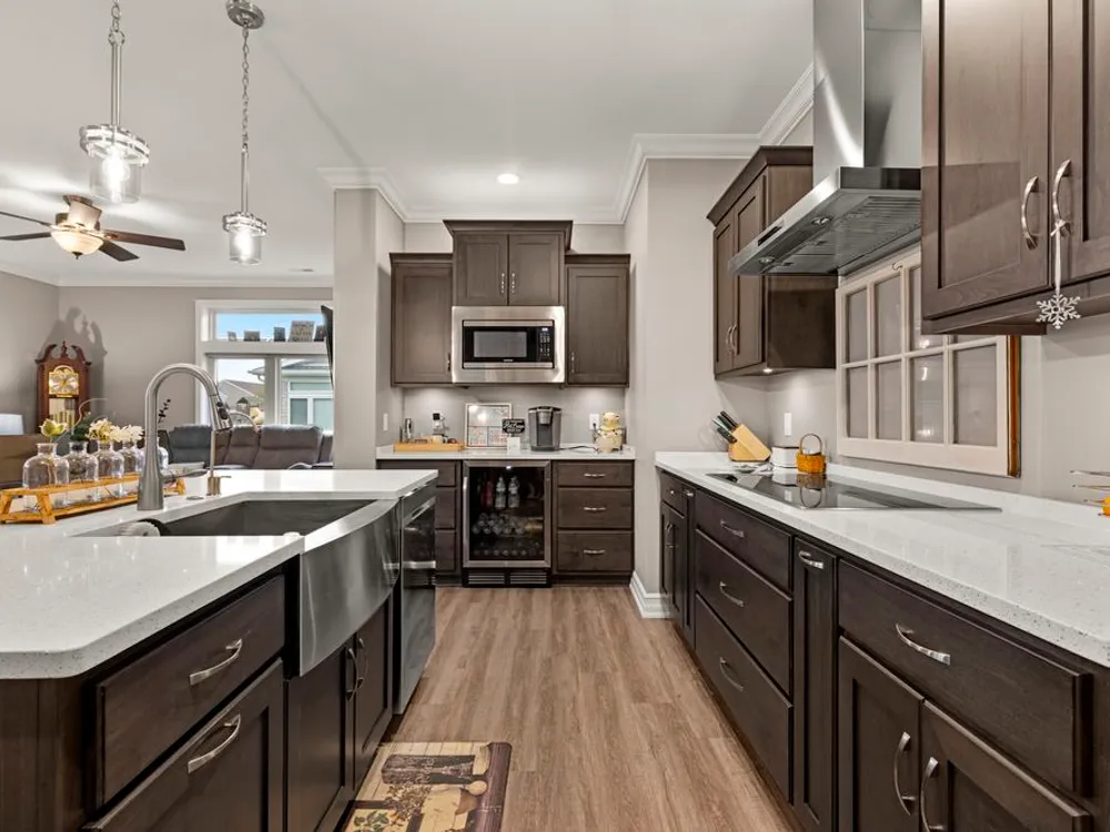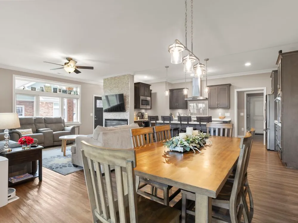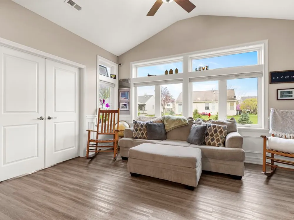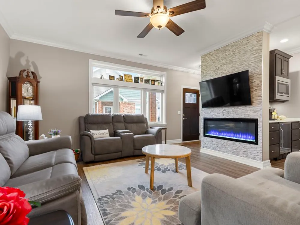 Experience elevated luxury in this stunning custom-designed condo suited for those 55 and better. Every thoughtful detail has been taken care of, just move in and enjoy! As you enter, notice transom windows, French doors that lead into the office, crown molding, and a fireplace feature wall. The kitchen is well appointed with upgraded Barkur custom cabinetry offering many useful details such as a pull-out spice cabinet and drawer inserts. Quartz counters, double ovens, beverage refrigerator, recirculating hot water, and a walk-in pantry are just some of a vast list of notable kitchen amenities. The Primary Retreat is a dream come true with illuminated tray ceiling and picture molding, no detail is spared. Offering a spa-like experience with a soaker tub, massive no-step shower, and a walk-in closet. You'll find a second bedroom and full bathroom tucked away for privacy. Off the main living area is a perfectly sized sun room with massive windows. Beyond that you'll appreciate the screened-in patio with an additional 11x12 uncovered patio. In the 3 car garage you'll see 2 parking spaces and a finished tandem area for storage. Up the stairs you'll find an additional finished space perfect for a rec room, storage, exercise equipment, or studio. Fee includes common insurance, exterior maintenance, lawn care, snow removal, Spectrum internet and streaming, pickleball courts and clubhouse access. See list of upgrades in documents.