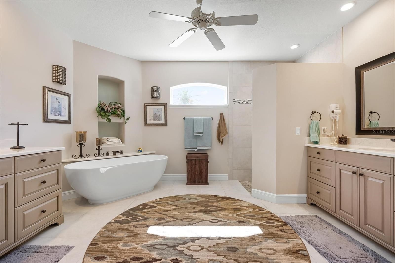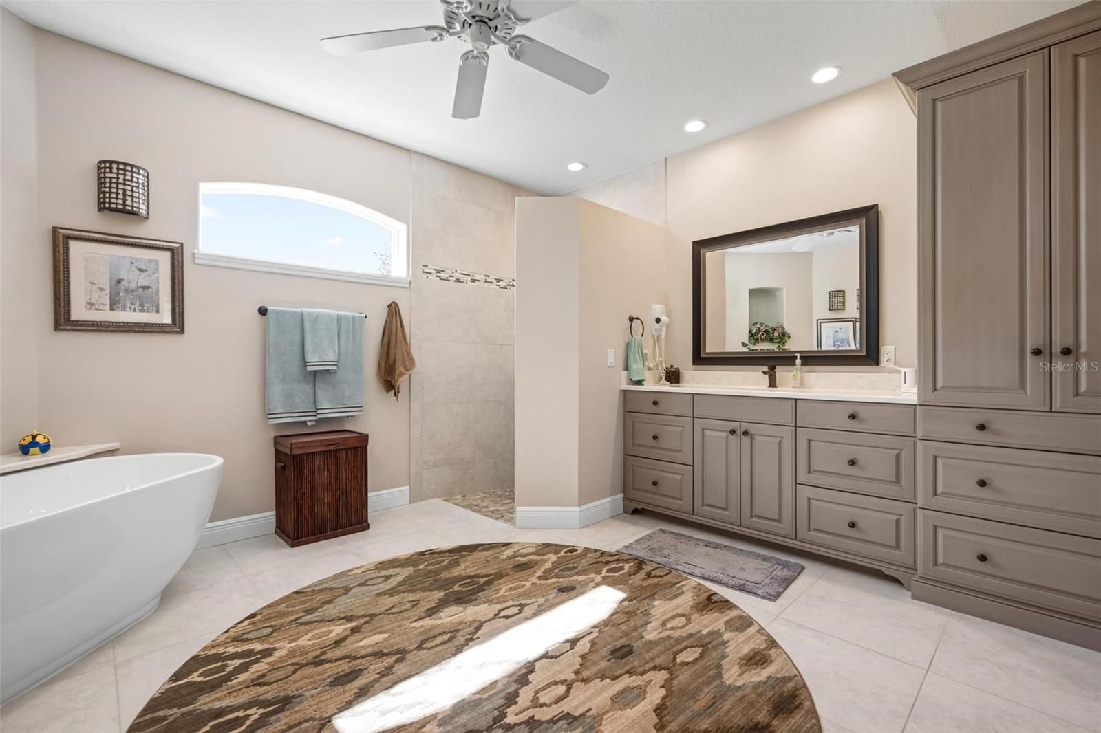 - Ceiling Fan(s), Crown Molding, Dry Bar, Eat-in Kitchen, High Ceilings, Open Floorplan, Main Level Primary, Solid Surface Counters, Solid-Wood Cabinets, Split Bedrooms, Thermostat, Vaulted Ceiling(s), Walk-In Closet(s), Window Treatments