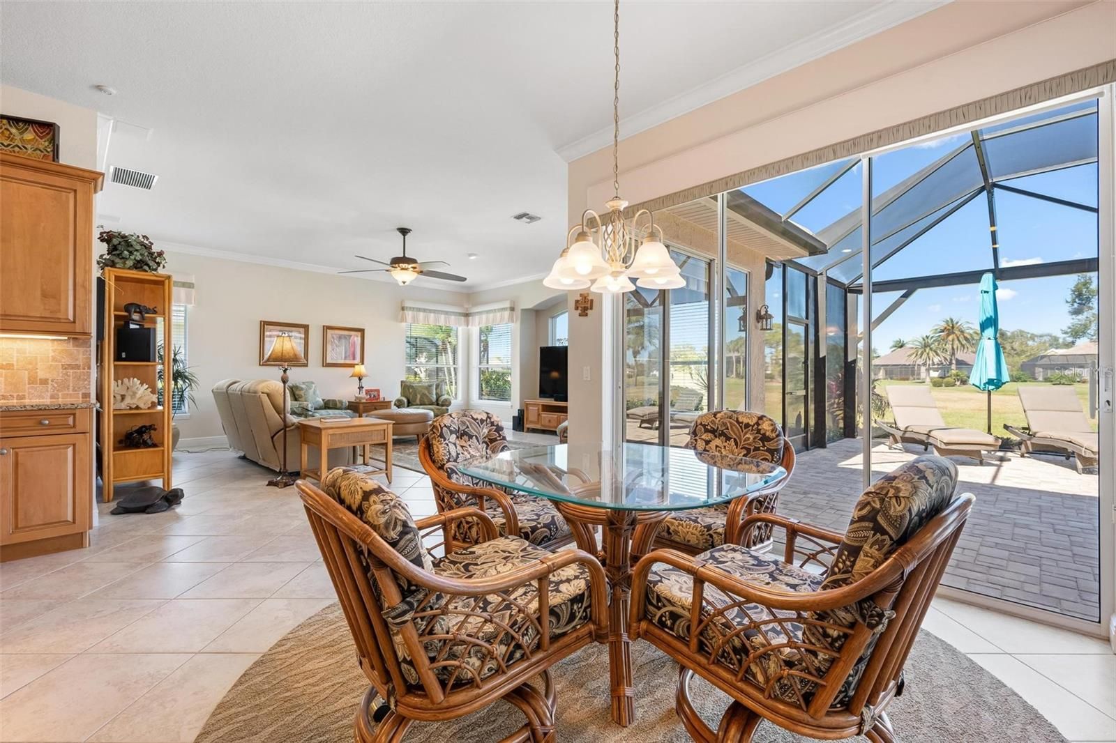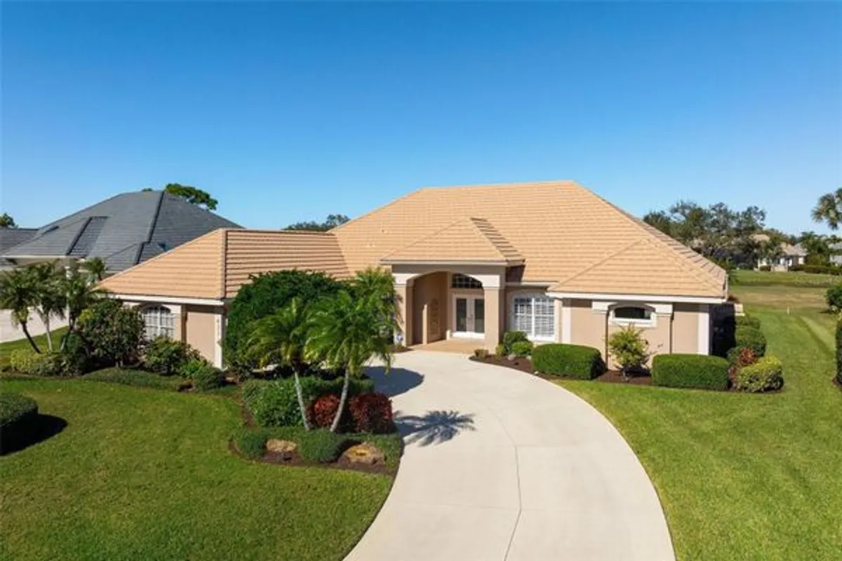 Welcome home to The Reserve at The Plantation, a premier gated enclave where pride of ownership, timeless elegance, and resort-style living come together. This visibly striking residence offers exceptional curb appeal and has been meticulously cared for and thoughtfully updated throughout. Situated on a choice quarter-plus-acre lot, the home enjoys panoramic golf and lake views overlooking the Panther 7th and 8th fairways, all tucked away on a quiet, dead-end street-perfect for morning strolls with neighbors and furry friends alike. Designed with a desirable split-bedroom floor plan, the home features three spacious bedrooms and three baths, each offering generous closet space. The primary suite is a true retreat, complete with walk-in closets and a beautifully updated spa-inspired bath featuring custom cabinetry, quartz countertops, a spacious walk-in shower, and a luxurious soaking tub. Entertain with ease in the formal living and dining rooms, highlighted by crown molding, stylish plank tile flooring and pocketing sliding glass doors that open seamlessly to the expansive lanai. Outside, a stunning heated pool and spa are framed by a clear-view screen cage, offering breathtaking, unobstructed vistas of rolling fairways, tranquil lakes, and Florida's abundant wildlife. The updated kitchen and family room truly form the heart of the home. Custom BROOKHAVEN cabinetry, quartz countertops, walls of storage, a pantry, and a dry bar with wine refrigerator and glass-front cabinets create both beauty and function. Walls of glass provide front-row seats to sweeping golf and water views, making everyday living feel extraordinary. A private office with closet, finished with plank tile and peaceful views, offers flexible space for work or guests. The spacious laundry room is equally impressive, featuring wall cabinetry, a laundry tub, washer and dryer, and a full-size second refrigerator. The tropical landscaped yard and long winding driveway lead to an oversized, side-load two-car garage with room for golf cart parking, epoxy flooring, abundant storage, and attic access-immaculate and thoughtfully designed. Located within The Plantation Golf and Country Club, golf and social memberships are available but not mandatory, allowing you to enjoy the lifestyle at your own pace. Best of all, there are no CDD fees. Centrally positioned just 15 minutes from pristine Gulf beaches, historic Downtown Venice, the Legacy Trail, Downtown Wellen Park, and a wide array of shopping and dining, this home delivers the perfect balance of tranquility and convenience. A truly fabulous home in an exceptional location-where pride of ownership shines throughout. A full list of upgrades is available.