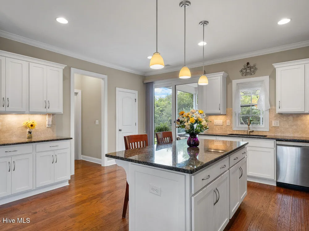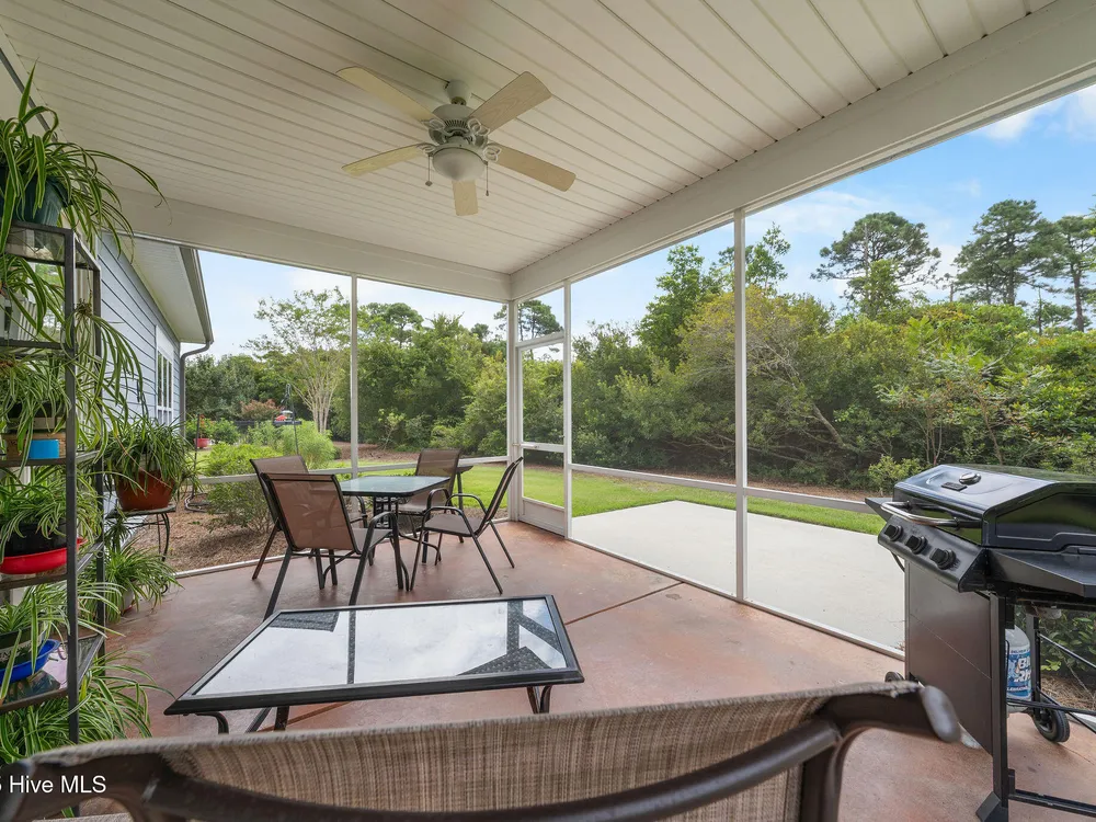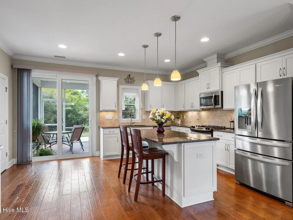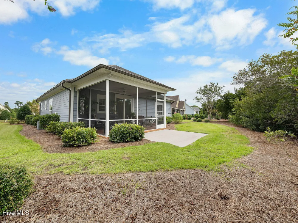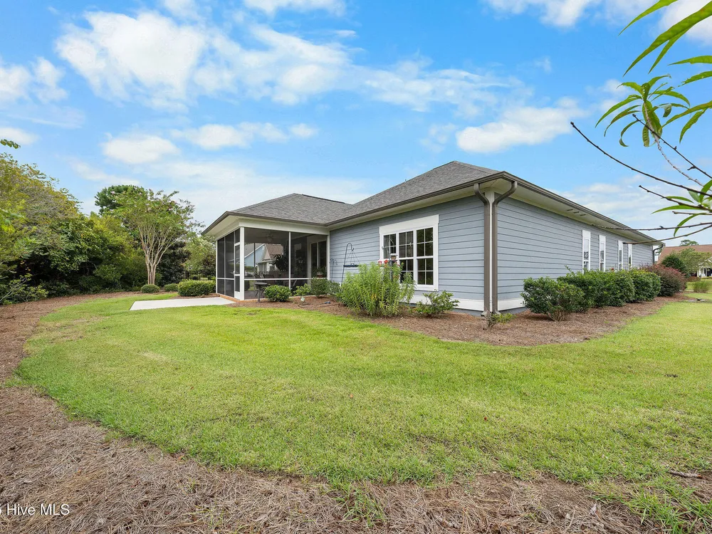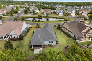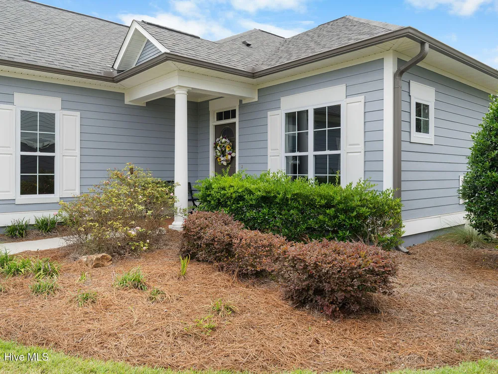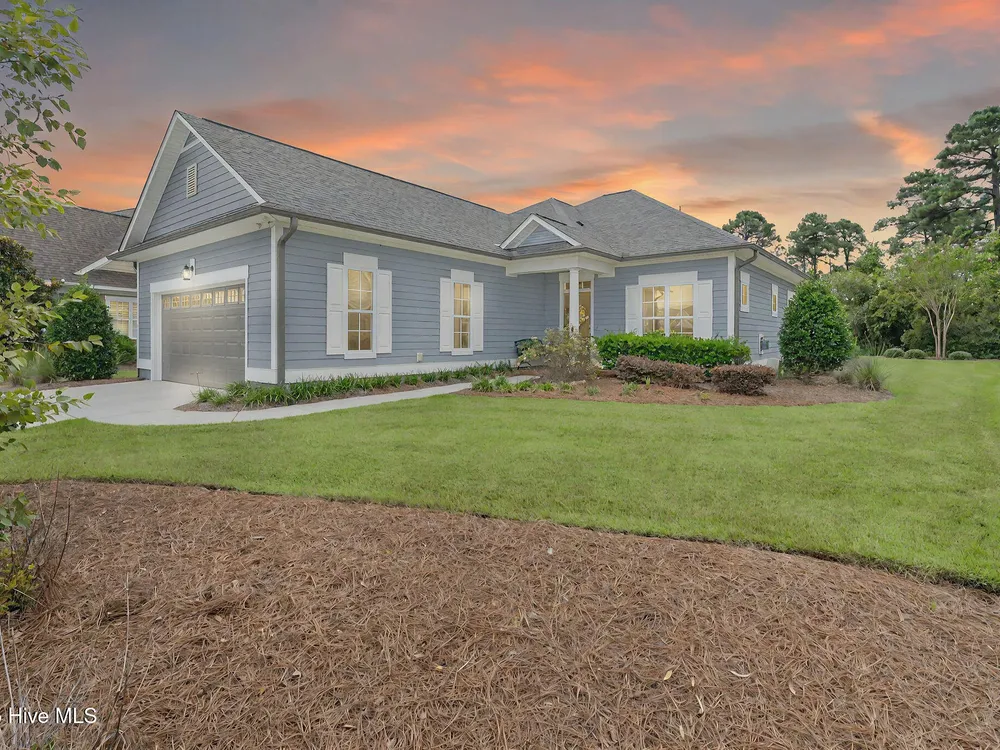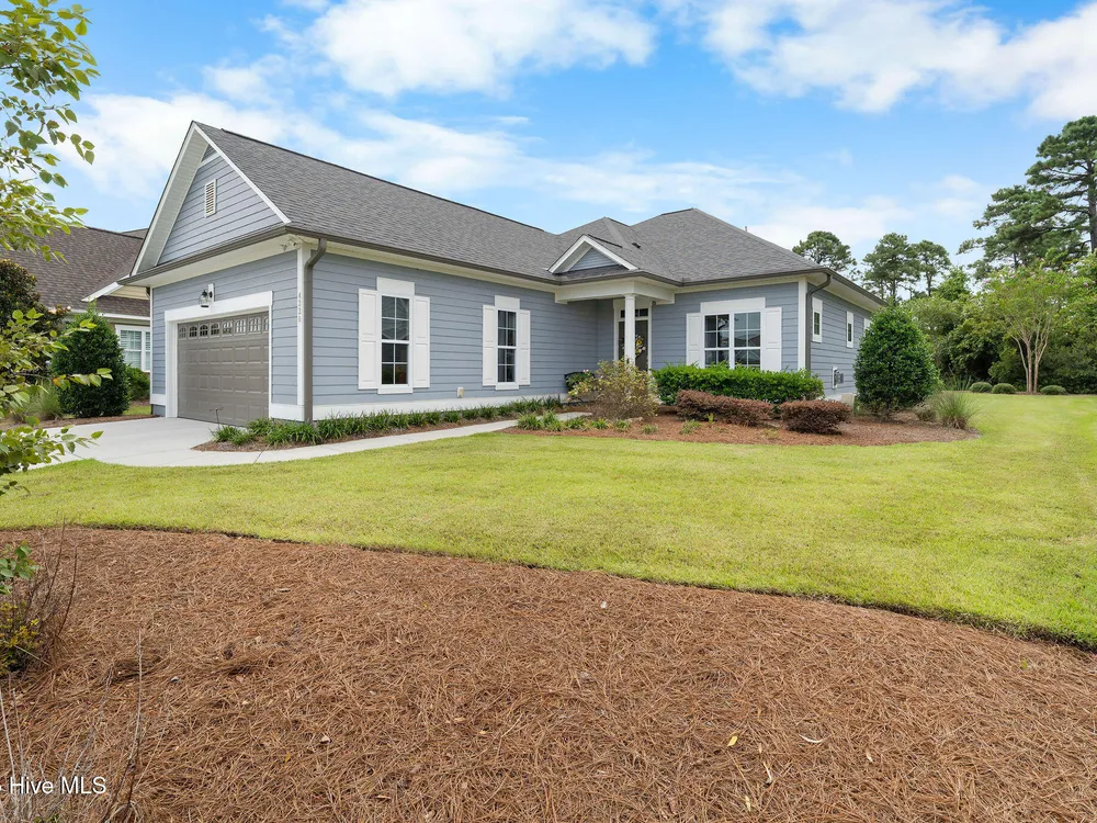 This six-year-young coastal cottage, located in the desirable Regency Lakes neighborhood of St. James Plantation, offers the perfect blend of comfort and convenience. Set on a private homesite, the property backs to a permanent nature preserve where the sounds of birds and wildlife create a peaceful retreat, while the front view overlooks a picturesque pond. With exterior landscaping and yard maintenance included you can focus on enjoying the St. James lifestyle. From the moment you arrive, the curb appeal pops with crisp white shutters and trim contrasted against a coastal blue exterior with brown highlights on the garage door, downspouts, and gutters. The inviting front entry welcomes you into an open three-bedroom, two-bathroom floor plan spanning 1,865 heated square feet. The main living areas feature durable engineered hand-scraped hardwood flooring that flows seamlessly throughout. The great room impresses with an octagonal tray ceiling and a sleek propane fireplace framed by charming cottage-style windows. An elegant dining area dressed in chair rail and wainscoting provides the perfect place to host family/friend gatherings. The kitchen is equally impressive, showcasing stainless steel appliances, a propane gas range, granite countertops, ceramic tile backsplash, under-cabinet lighting, and quality soft-close cabinetry. A walk-in pantry and large center island provide storage and prep space, ideal for casual meals or entertaining. From the kitchen, step out to the private screened-in porch overlooking the tranquil preserve, or enjoy the adjoining patio for grilling and taking in the mild Carolina weather. Designed with a split-bedroom layout, the owner's suite is tucked away at the back of the home for privacy. It features hardwood flooring, a tray ceiling, and a wall of windows overlooking nature. The en-suite bath includes a dual vanity, separate water closet, and an expansive zero-entry tiled walk-in shower with a bench. Two spacious guest bedrooms are
