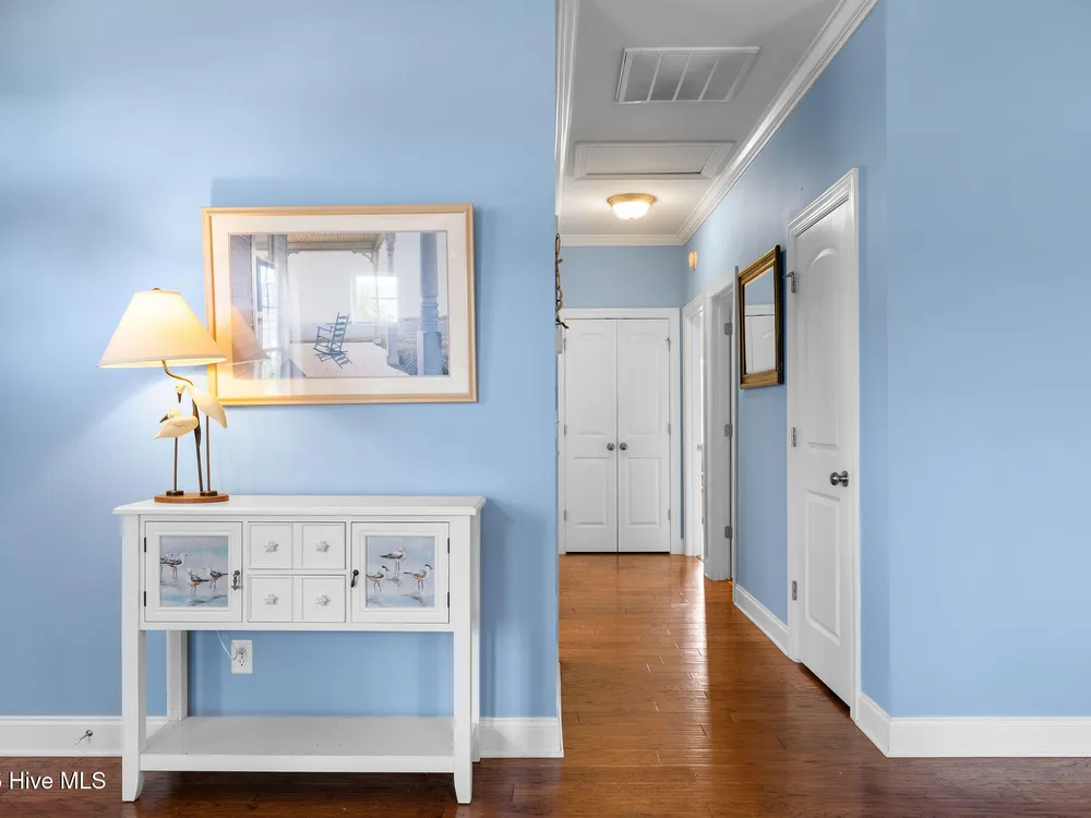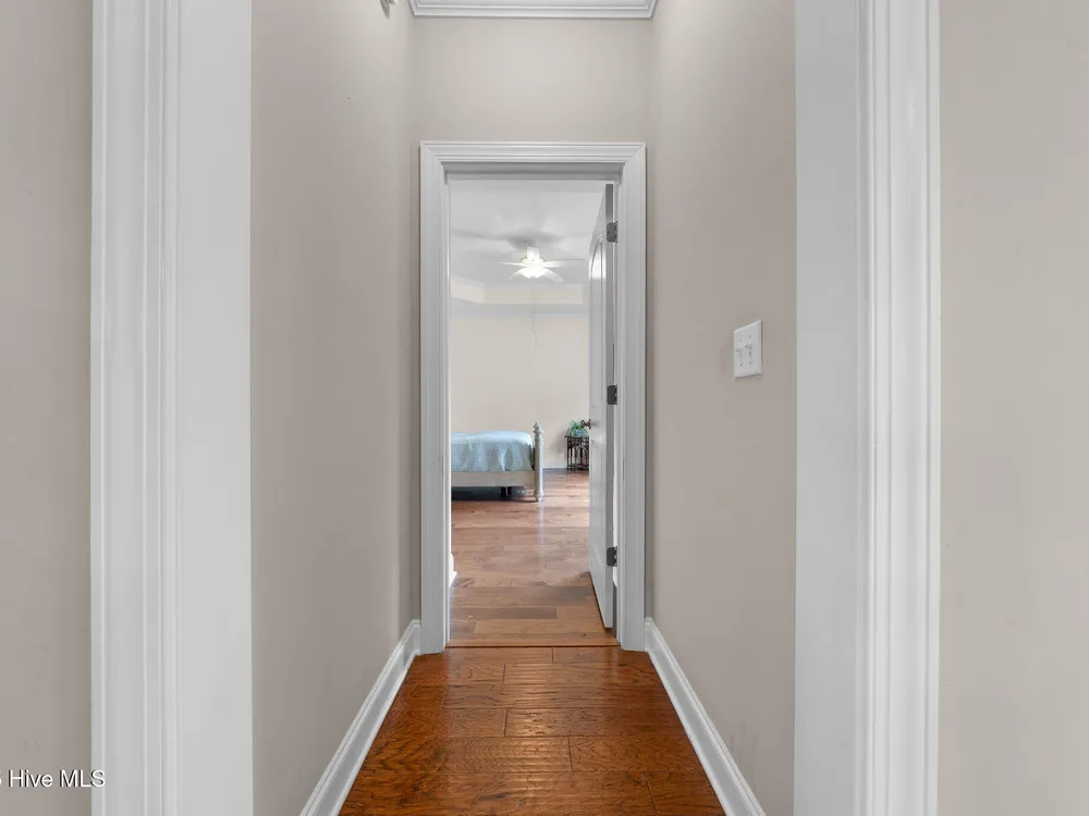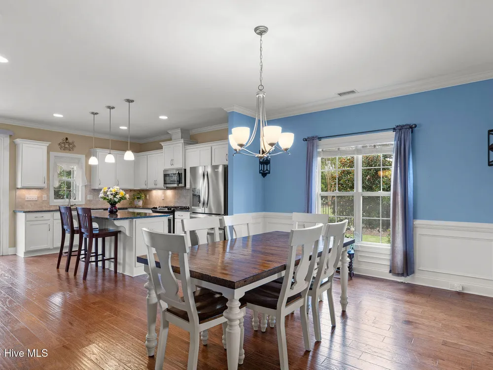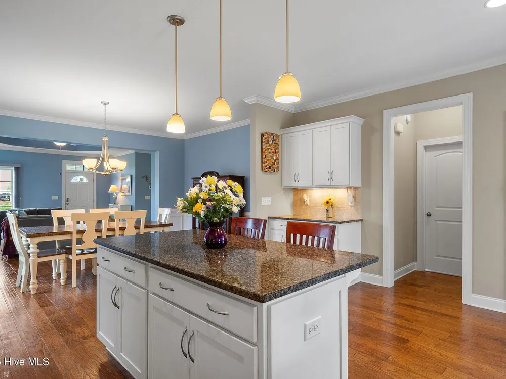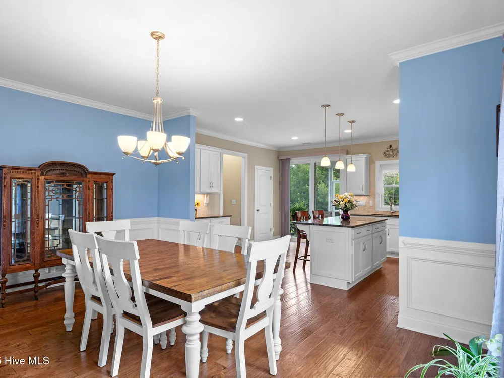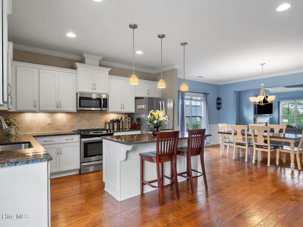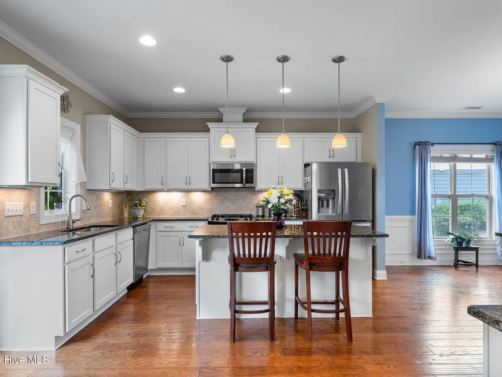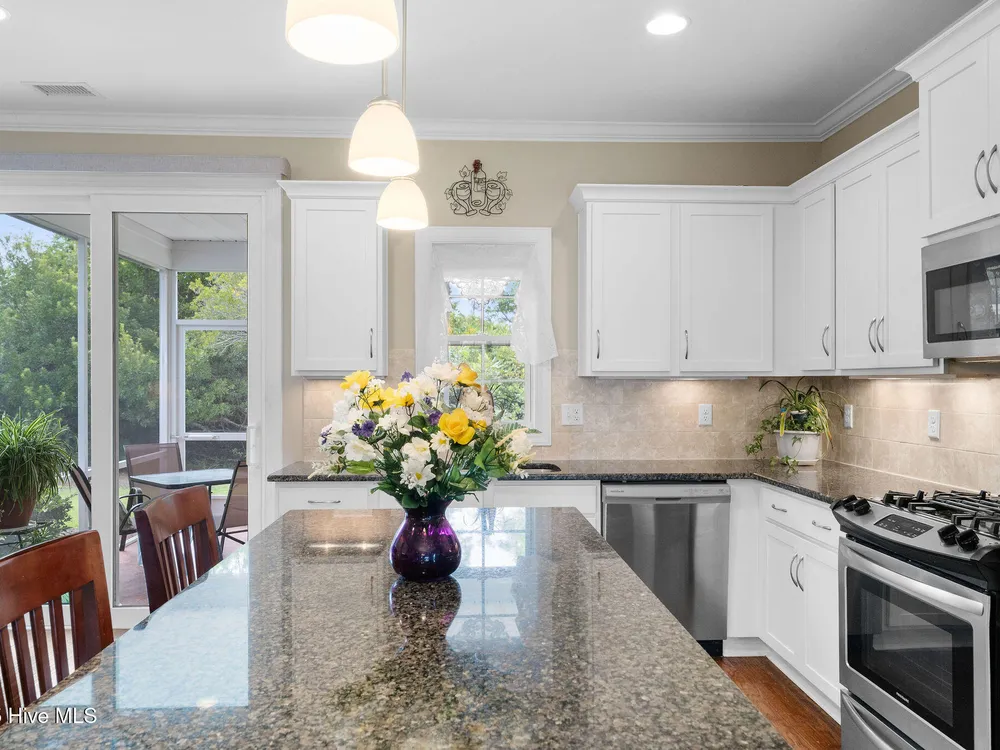 This six-year-young coastal cottage, located in the desirable Regency Lakes neighborhood of St. James Plantation, offers the perfect blend of comfort and convenience. Set on a private homesite, the property backs to a permanent nature preserve where the sounds of birds and wildlife create a peaceful retreat, while the front view overlooks a picturesque pond. With exterior landscaping and yard maintenance included you can focus on enjoying the St. James lifestyle. From the moment you arrive, the curb appeal pops with crisp white shutters and trim contrasted against a coastal blue exterior with brown highlights on the garage door, downspouts, and gutters. The inviting front entry welcomes you into an open three-bedroom, two-bathroom floor plan spanning 1,865 heated square feet. The main living areas feature durable engineered hand-scraped hardwood flooring that flows seamlessly throughout. The great room impresses with an octagonal tray ceiling and a sleek propane fireplace framed by charming cottage-style windows. An elegant dining area dressed in chair rail and wainscoting provides the perfect place to host family/friend gatherings. The kitchen is equally impressive, showcasing stainless steel appliances, a propane gas range, granite countertops, ceramic tile backsplash, under-cabinet lighting, and quality soft-close cabinetry. A walk-in pantry and large center island provide storage and prep space, ideal for casual meals or entertaining. From the kitchen, step out to the private screened-in porch overlooking the tranquil preserve, or enjoy the adjoining patio for grilling and taking in the mild Carolina weather. Designed with a split-bedroom layout, the owner's suite is tucked away at the back of the home for privacy. It features hardwood flooring, a tray ceiling, and a wall of windows overlooking nature. The en-suite bath includes a dual vanity, separate water closet, and an expansive zero-entry tiled walk-in shower with a bench. Two spacious guest bedrooms are