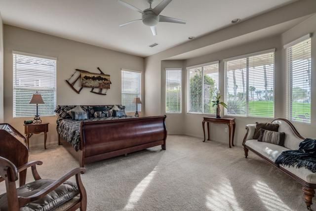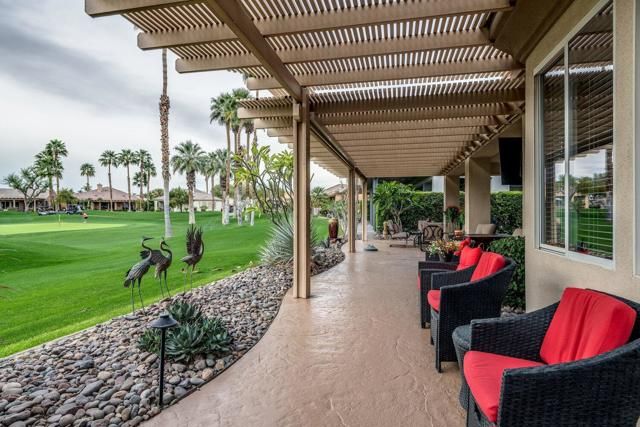 Welcome to one of the largest and most desirable floor plans in Heritage Palms Country Club--this 2,504 sq. ft. upgraded Westerwood Model is designed for effortless entertaining and everyday living. At the heart of the home is a beautiful open-concept kitchen that will impress both casual cooks and seasoned hosts. Featuring granite countertops, a charming farmhouse sink, abundant cabinetry with pull-out storage, and generous prep space, it's perfectly suited for creating delicious meals and fun gatherings. The kitchen opens seamlessly into the spacious great room, where a cozy gas fireplace creates a warm, inviting atmosphere. Entertaining is a breeze with a dedicated bar and seating for up to 10--so go ahead, invite everyone!A versatile den with French doors offers flexibility as a third bedroom, private home office, or media room, and connects to a Jack-and-Jill bathroom with dual sinks, making it ideal for guests or multi-purpose living. The expansive primary suite serves as a peaceful retreat, showcasing a bay window with breathtaking golf course views, a soaking tub, a walk-in shower, and a spacious walk-in closet. A comfortable guest bedroom with shared bath access ensures visitors feel welcome, while an additional half bath adds everyday convenience. Step outdoors to experience the best of desert living. The extended front courtyard is perfect for morning coffee or evening cocktails, framed by lush, low-maintenance landscaping. The large air-conditioned garage provides ample storage and room for hobbies. In the backyard, the expansive covered patio steals the show with an Alumawood cover, painted concrete patio, fire pit, outdoor TV, and sweeping views of the golf course and Santa Rosa Mountains. Situated on the 6th Hole Green and away from the cart path, this home offers exceptional privacy, tranquility, and scenery. As a resident of Heritage Palms Country Club, you'll enjoy resort-style amenities including an 18-hole championship golf course, tennis and pickleball courts, indoor and outdoor pools, a full-service restaurant and bar, a state-of-the-art fitness center, group classes, and a vibrant clubhouse community--all just minutes from shopping, dining, Old Town La Quinta, and scenic hiking trails. Comfort, style, spectacular views, and endless opportunities to entertain--this home truly has it all. Come experience the lifestyle you've been waiting for.