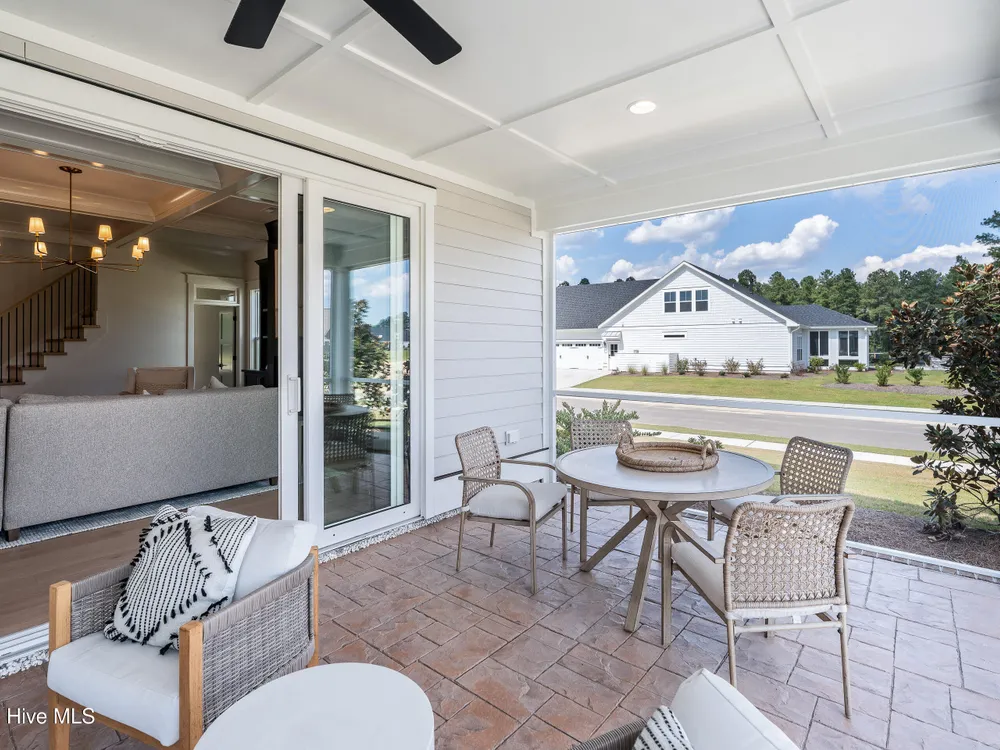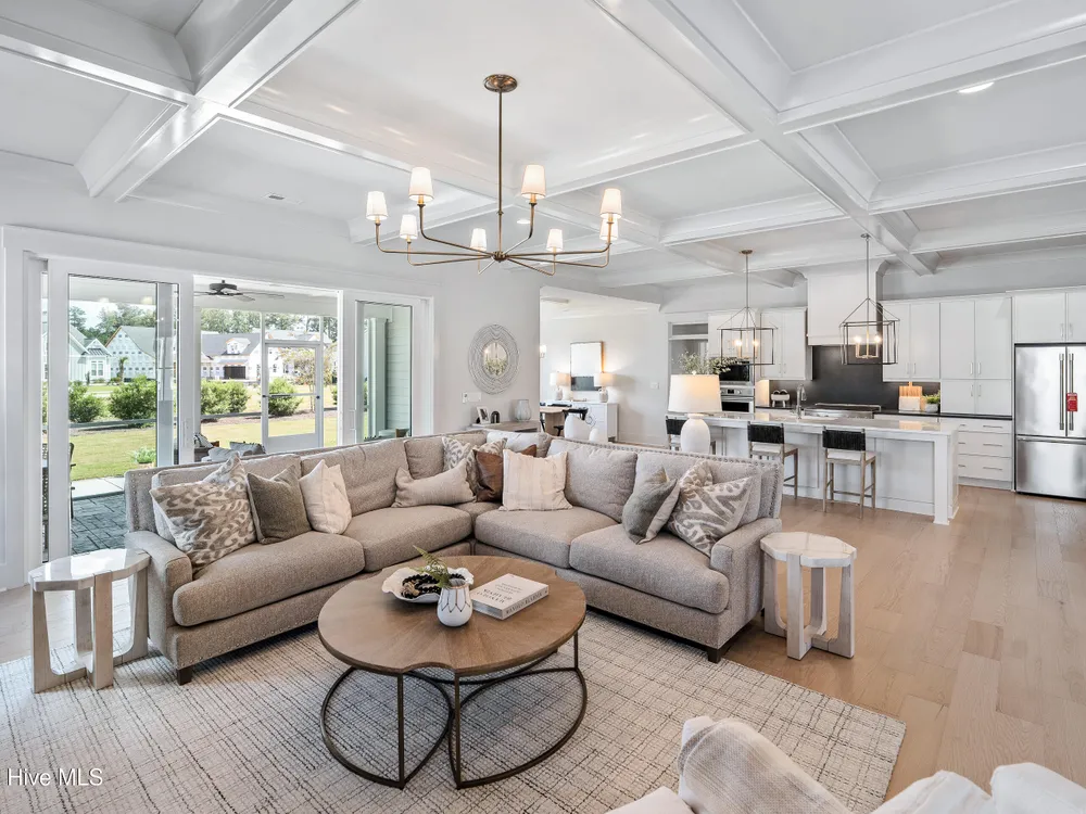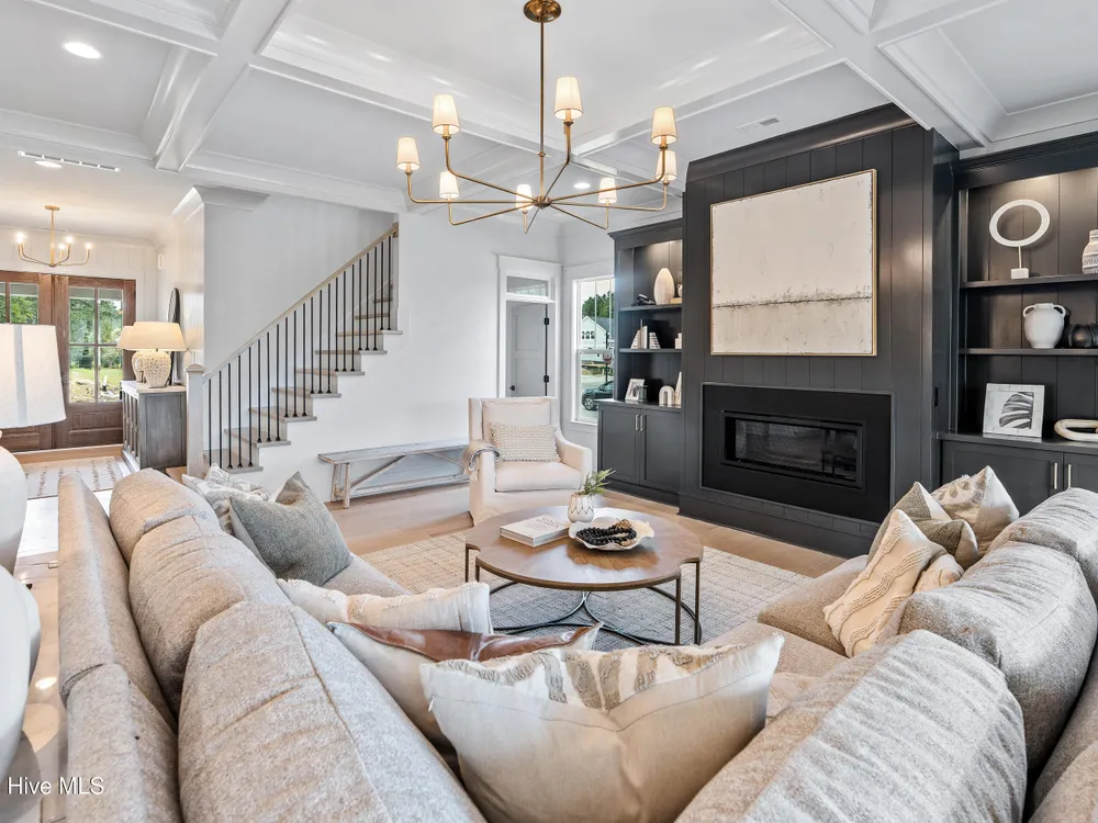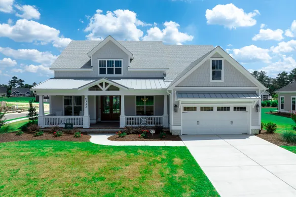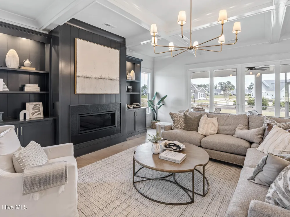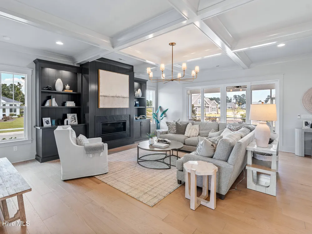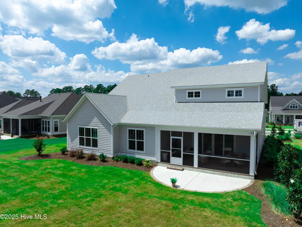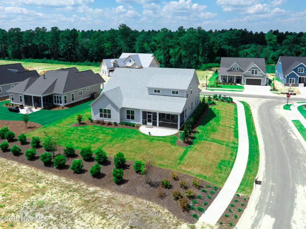 Experience luxury living in The Chelsea by Legacy Homes by Bill Clark, an impressive 3,937 sq ft two-story home perfectly positioned on desirable corner lot in the coveted Creek Side at Brunswick Forest. This stunning 4-bedroom, 4.5-bathroom residence showcases an expansive open-concept design with a dramatic great room featuring coffer ceilings and a cozy fireplace, flowing effortlessly into a gourmet kitchen equipped with a large island, premium cabinetry, and walk-in pantry. The main-level owner's suite offers a private retreat with a spa-inspired ensuite, while the second floor provides three additional rooms, two bathrooms, and both a recreation room with a wet bar for endless entertainment possibilities. Outdoor living is elevated with a generous screened porch and expansive patio perfect for year-round enjoyment. Additional highlights include a convenient mudroom, dedicated first floor study, and two-car garage. With hardwood flooring throughout main living areas, sophisticated light fixtures, and premium finishes including quartz countertops and custom trim work, this new construction masterpiece delivers elegance and functionality in Brunswick County's premier community.