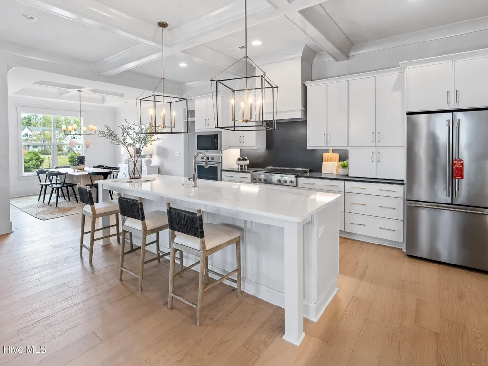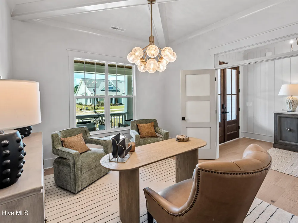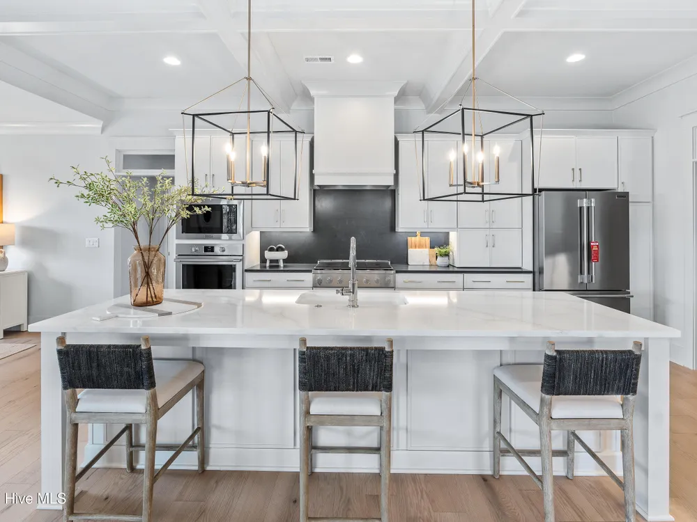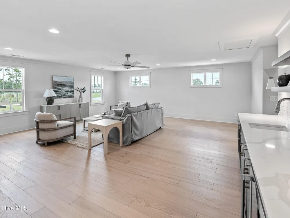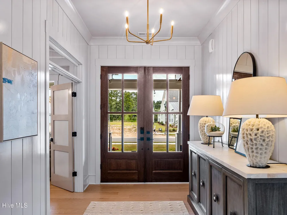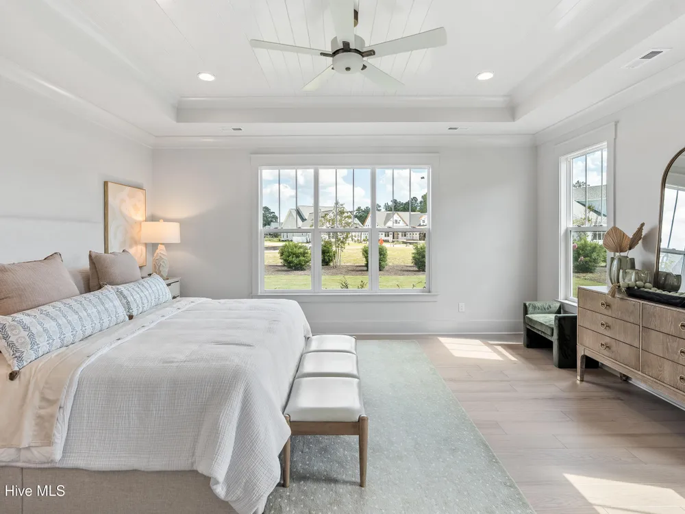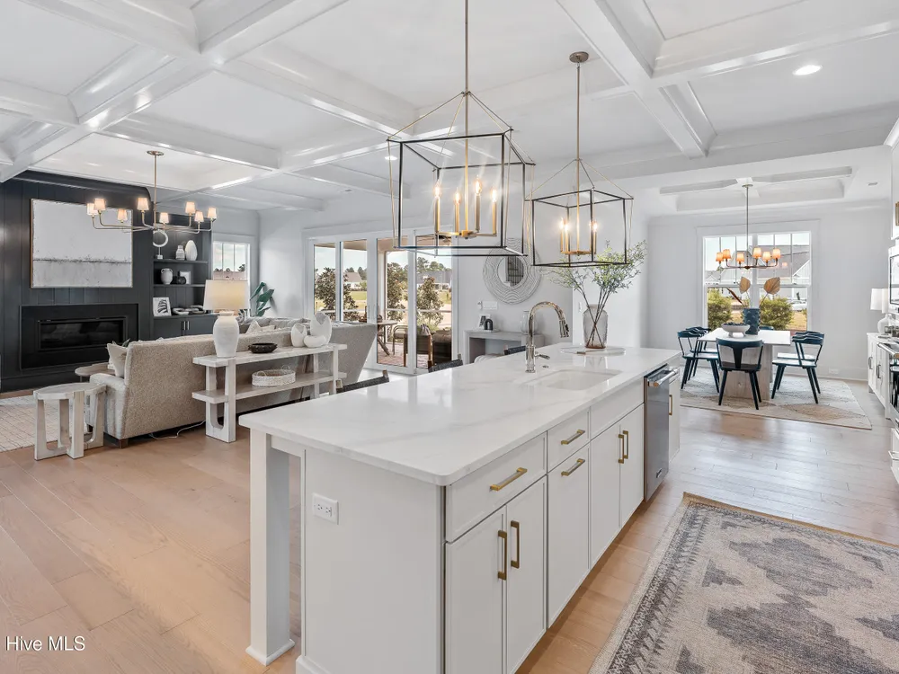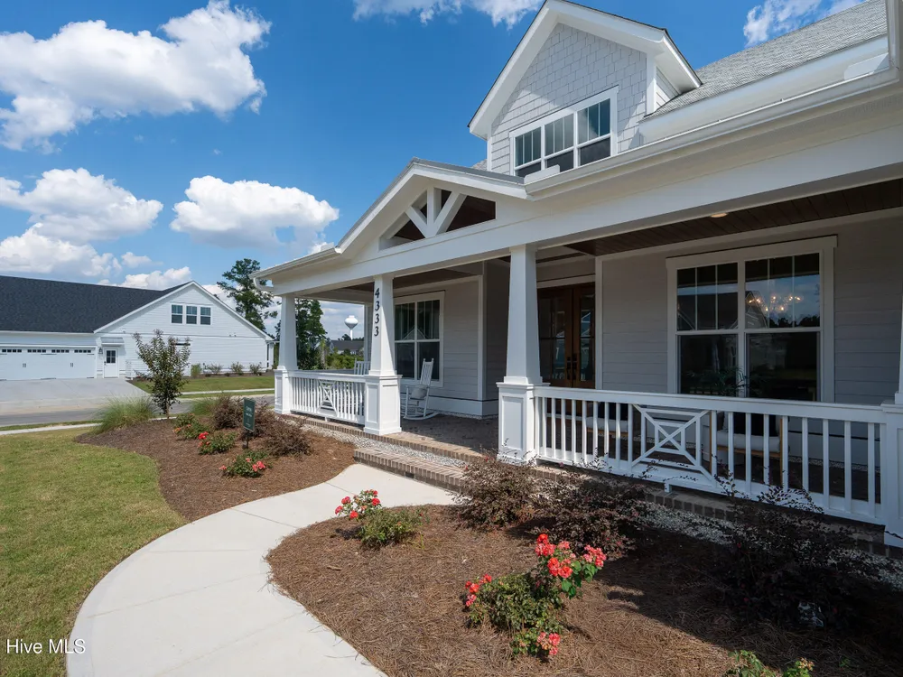 Experience luxury living in The Chelsea by Legacy Homes by Bill Clark, an impressive 3,937 sq ft two-story home perfectly positioned on desirable corner lot in the coveted Creek Side at Brunswick Forest. This stunning 4-bedroom, 4.5-bathroom residence showcases an expansive open-concept design with a dramatic great room featuring coffer ceilings and a cozy fireplace, flowing effortlessly into a gourmet kitchen equipped with a large island, premium cabinetry, and walk-in pantry. The main-level owner's suite offers a private retreat with a spa-inspired ensuite, while the second floor provides three additional rooms, two bathrooms, and both a recreation room with a wet bar for endless entertainment possibilities. Outdoor living is elevated with a generous screened porch and expansive patio perfect for year-round enjoyment. Additional highlights include a convenient mudroom, dedicated first floor study, and two-car garage. With hardwood flooring throughout main living areas, sophisticated light fixtures, and premium finishes including quartz countertops and custom trim work, this new construction masterpiece delivers elegance and functionality in Brunswick County's premier community.