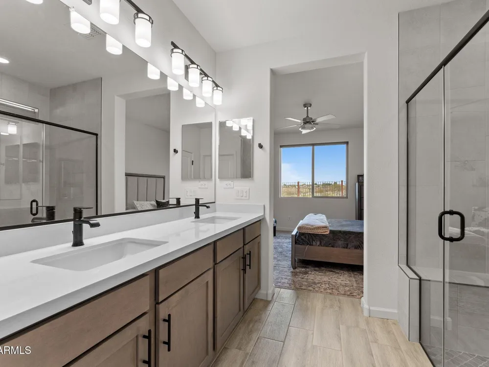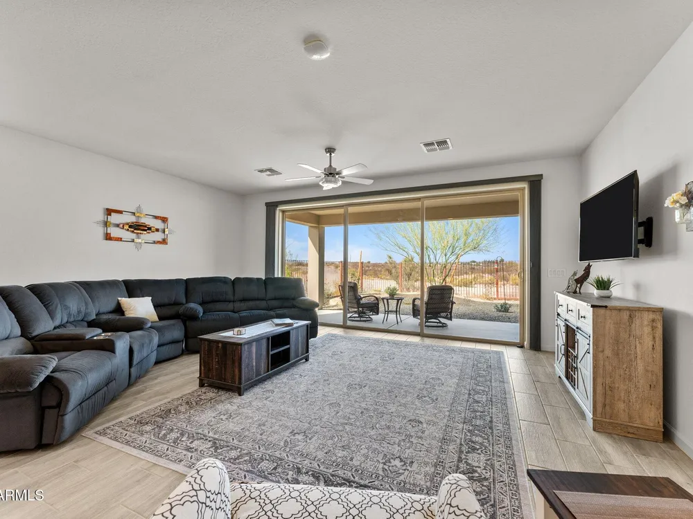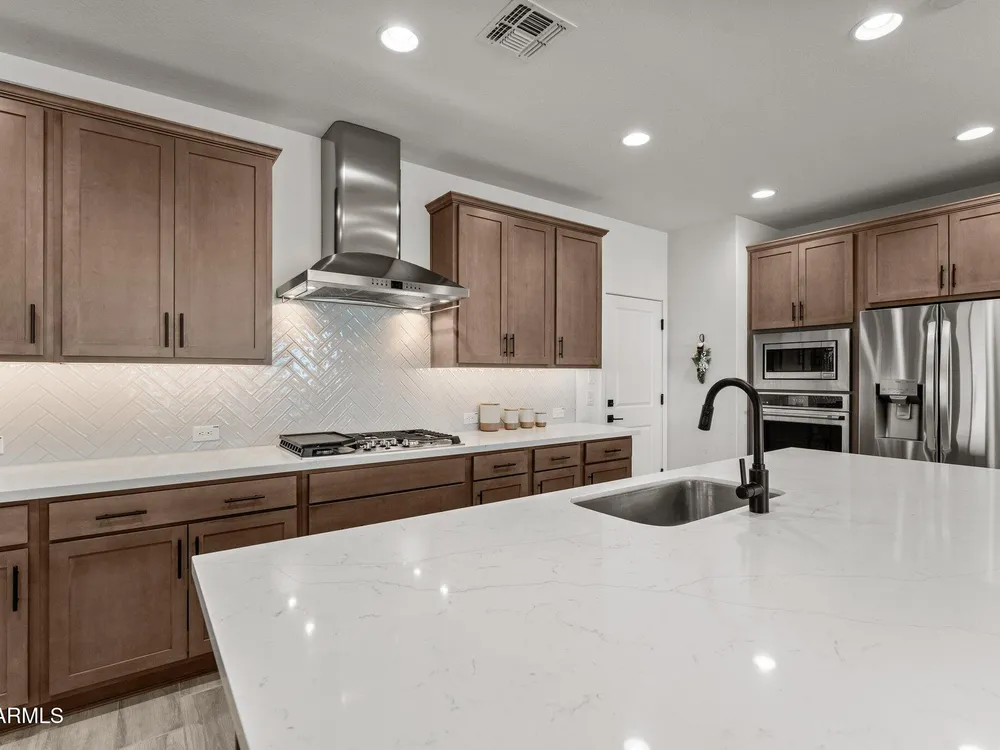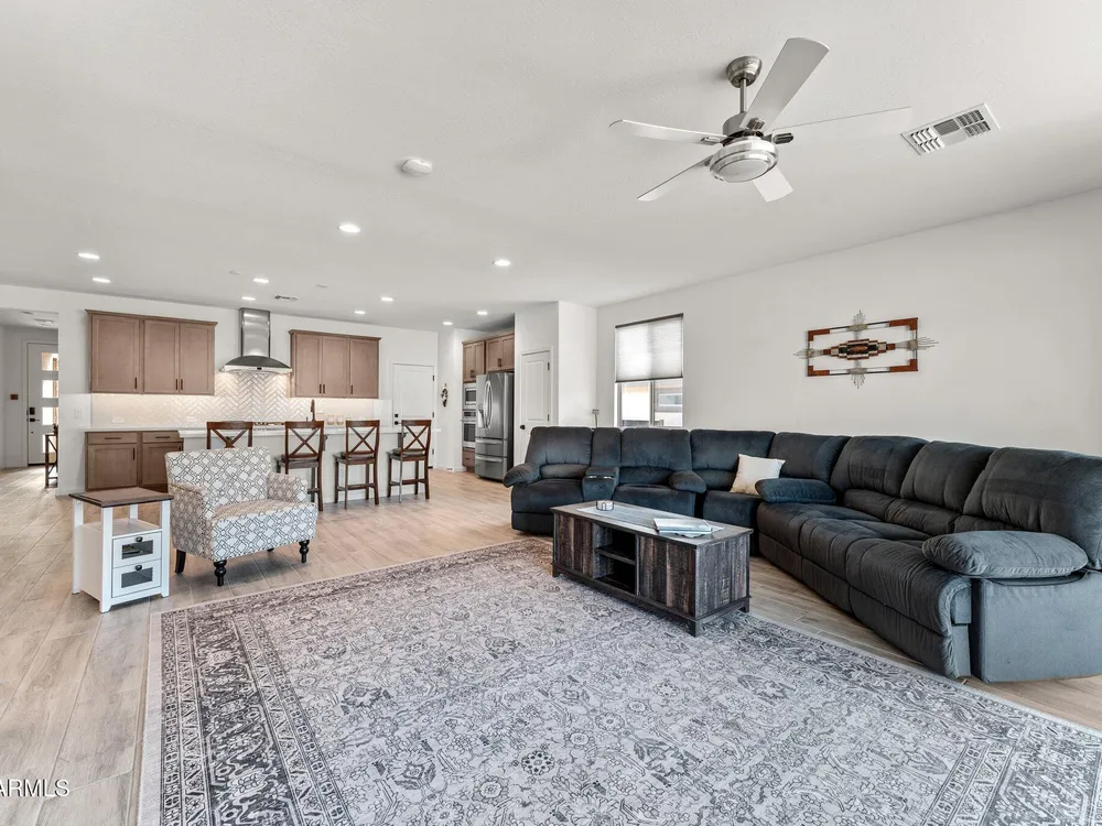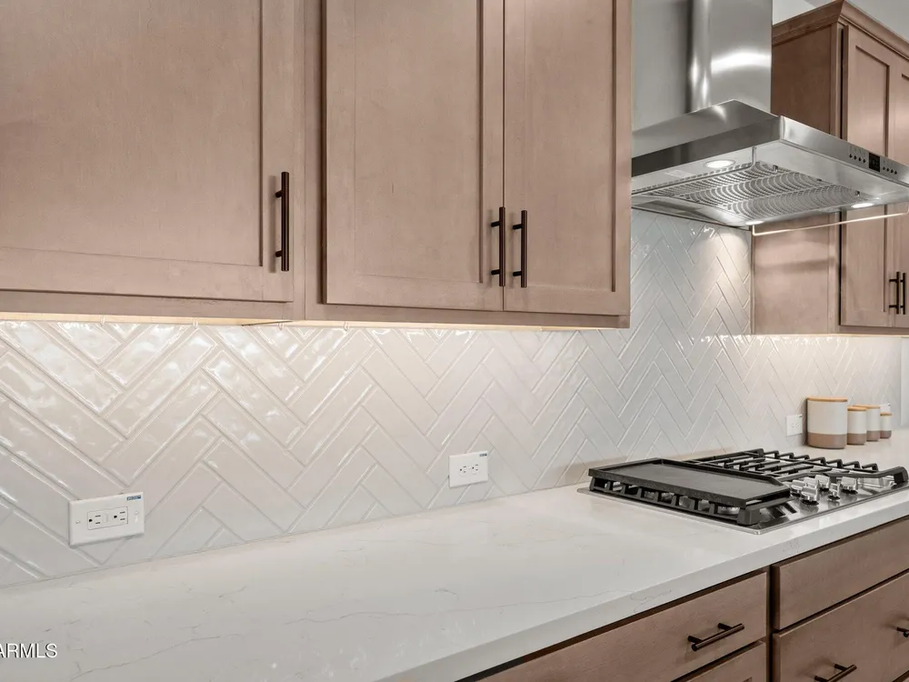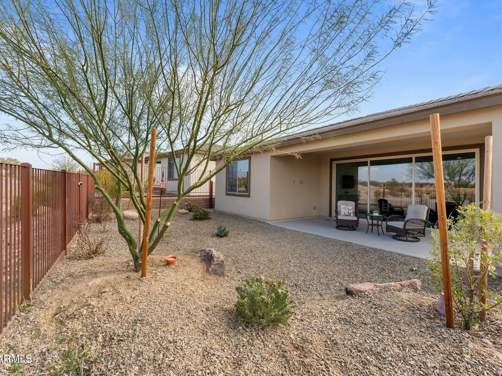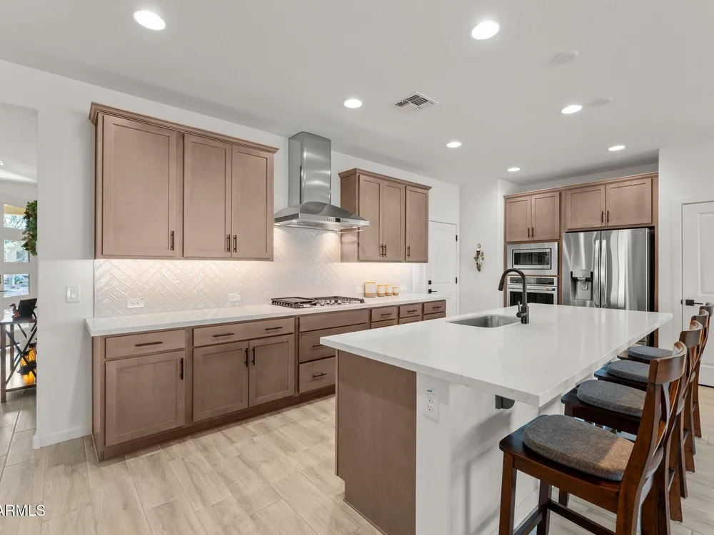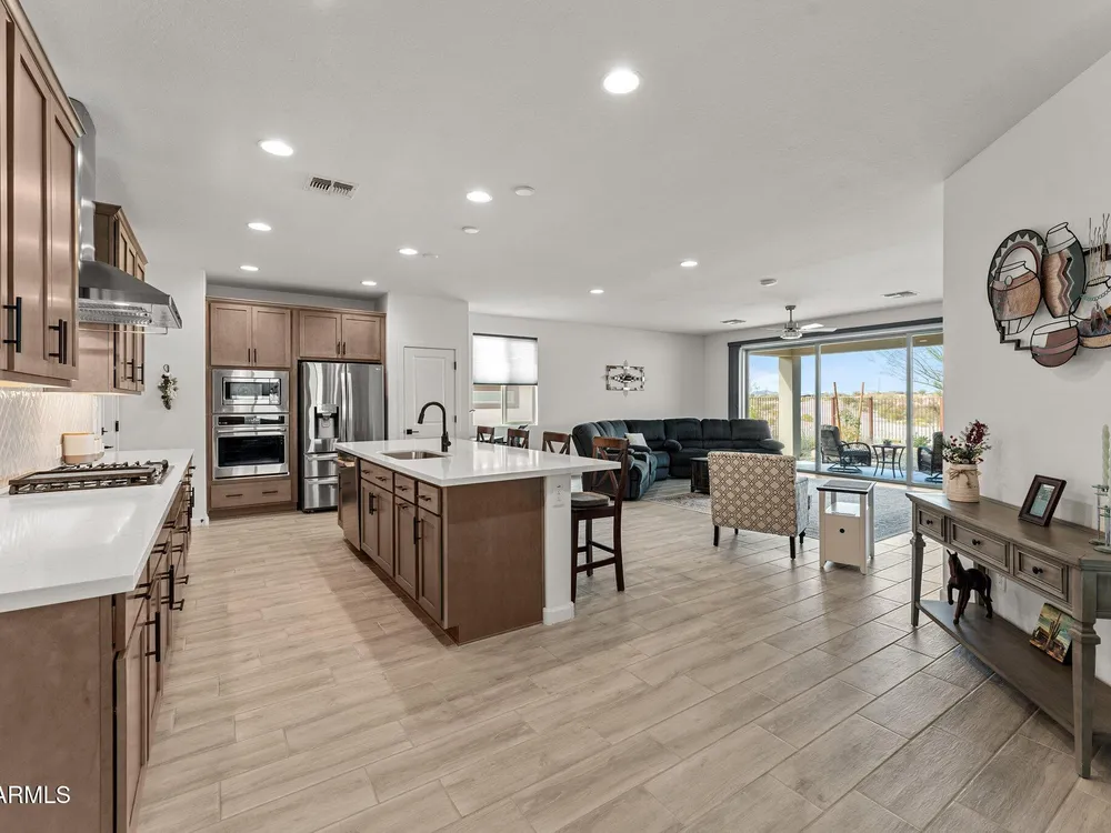 Located in the sought-after resort-style community of Wickenburg Ranch, this stunning home epitomizes modern desert living with its thoughtful design and luxurious features. The open floor plan seamlessly integrates indoor and outdoor spaces, highlighted by a large wall of sliding glass doors that lead to a covered patio with breathtaking desert views—perfect for relaxing or entertaining. The sleek, upgraded kitchen serves as the heart of the home, boasting contemporary finishes, high-end appliances, and an oversized island for gathering and meal preparation. Abundant natural light flows throughout the home, creating a bright and airy ambiance.