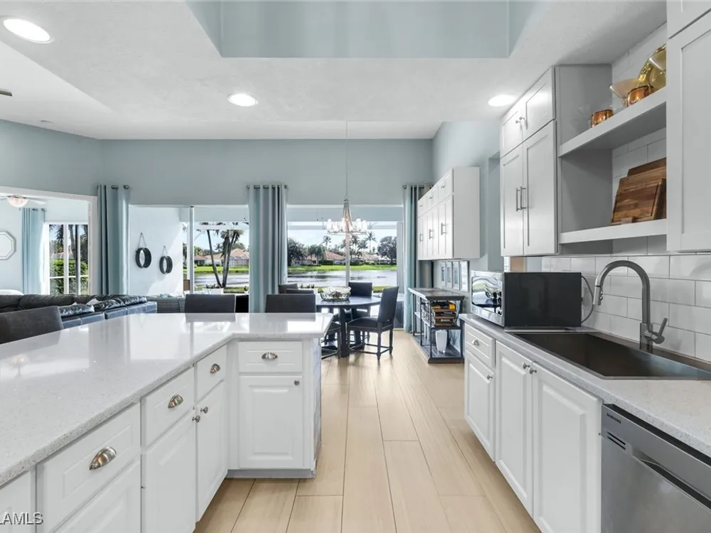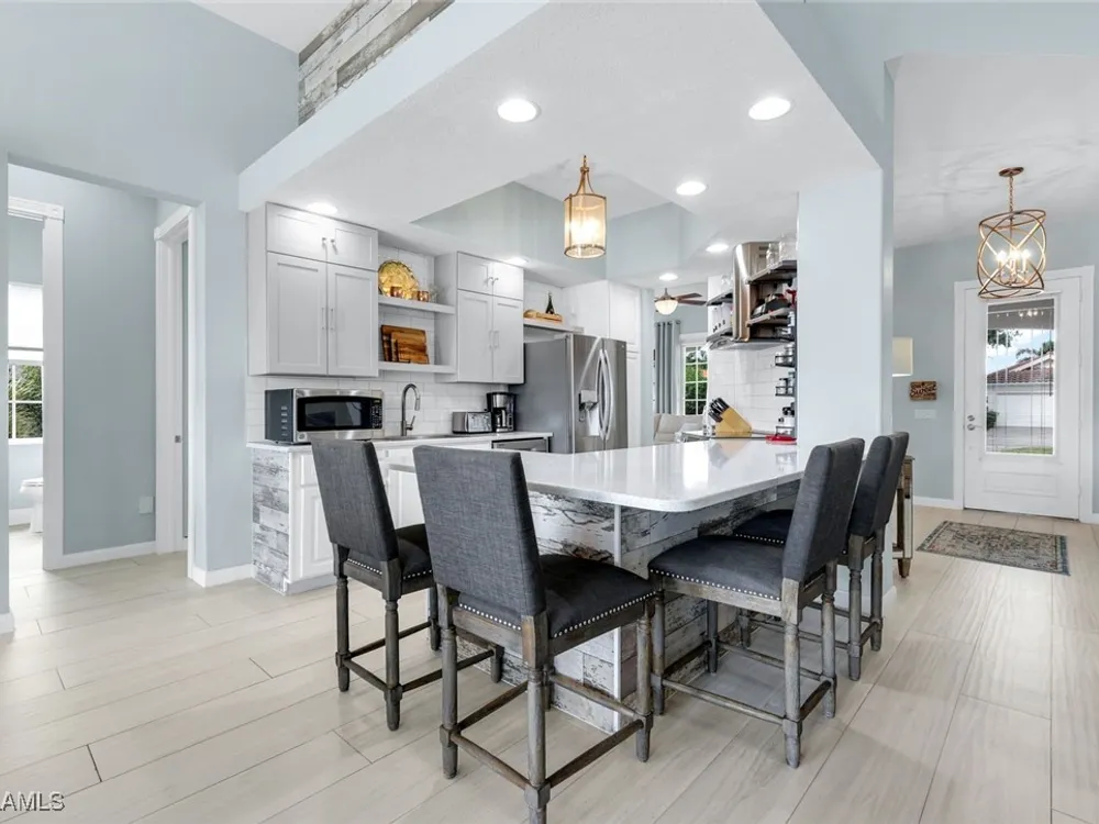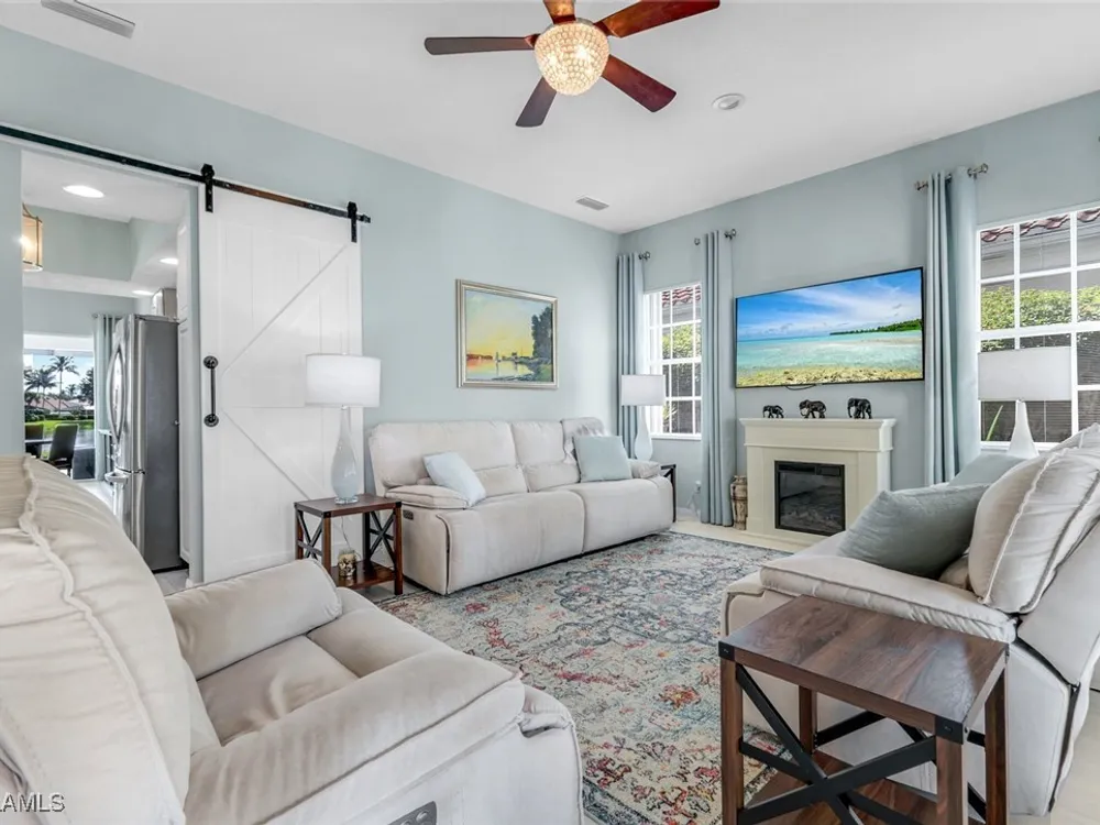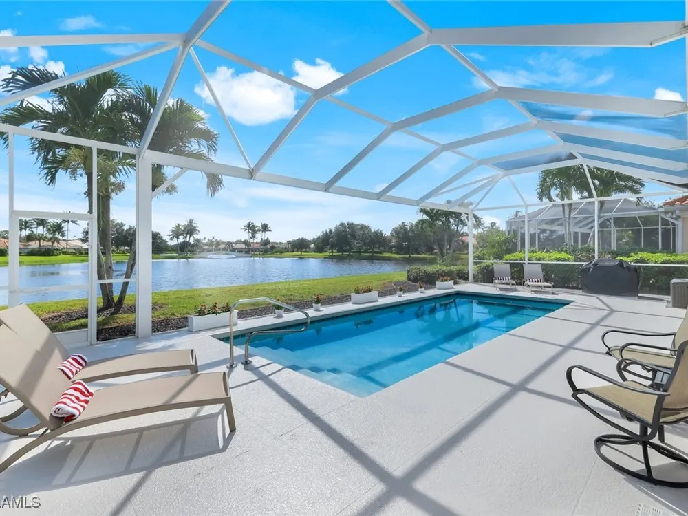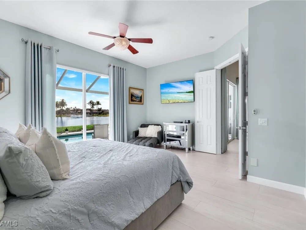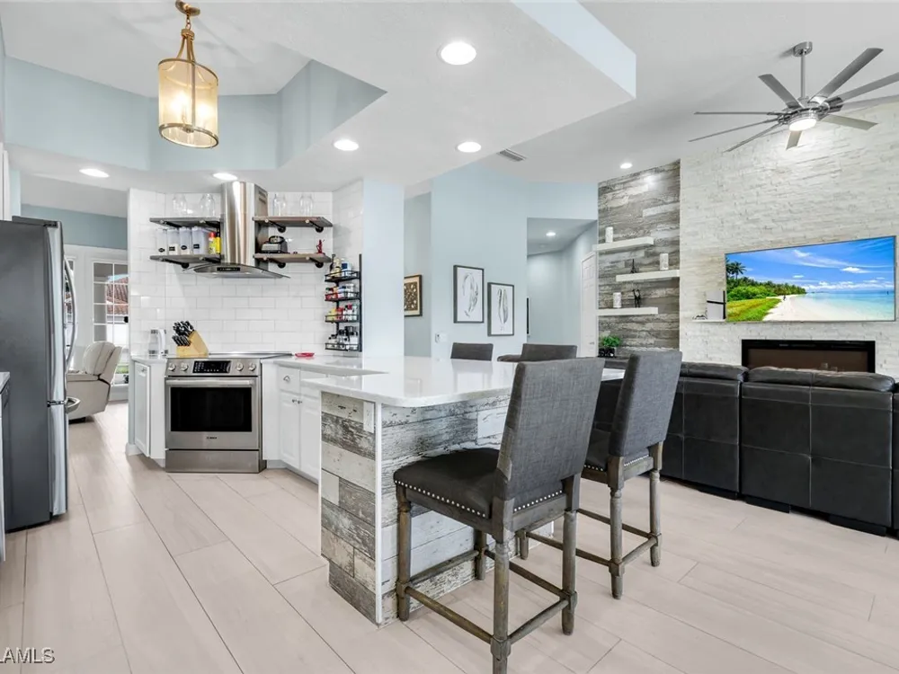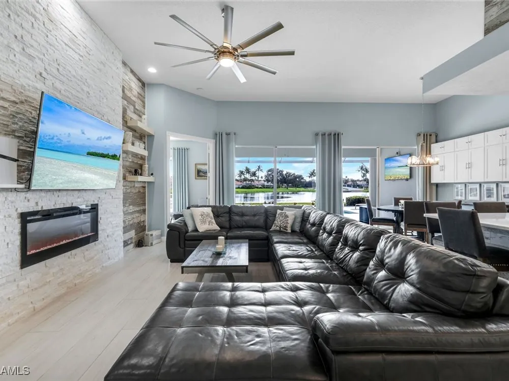 **ONE OF THE BEST HOMES IN ISLANDWALK**SPECTACULAR LAKE-VIEW** This Designer Carlyle Model features stunning, long lake, walking bridge, sunrise views and offers nearly 2500 square feet of elegance and style that will satisfy even the most discerning of buyers. Custom wall of kitchen cabinets! Glamour abounds in this sophisticated gem. The crown jewel of Islandwalk boasts a quartzite brick feature wall with remote controlled fireplace and mounted TV. Sparkling white quartz countertops, Newer Samsung Appliances, Barn door, artisan crafted cabinets and open shelving, European range hood, gray beech hardwood floors throughout. New roof 1-2 years old, New pool heater, pump and filter, Pool deck painted, Garage epoxy floor, Kitchen appliances -3 years. Tesla charger and Generator electric hookup-panel. If you've been looking for a gem with amazing features and you want to move right in with just your toothbrush, then this is the home for you. Award Winning IslandWalk comes with Amenities Galore and is located within easy walking or biking distance to all the Island Walk TownCenter amenities with resort and lap pools, 8 har tru tennis courts, state of the art fitness center, putting green, bocce courts, post office, Fantastic Casa Cotzelli Restaurant, gas station, car wash, hair and nail salons. Come Enjoy Paradise which includes HDTV, High Speed Internet and Lawn Care. Don’t let this one get away… make this Stunning Oasis YOUR address in Paradise !!