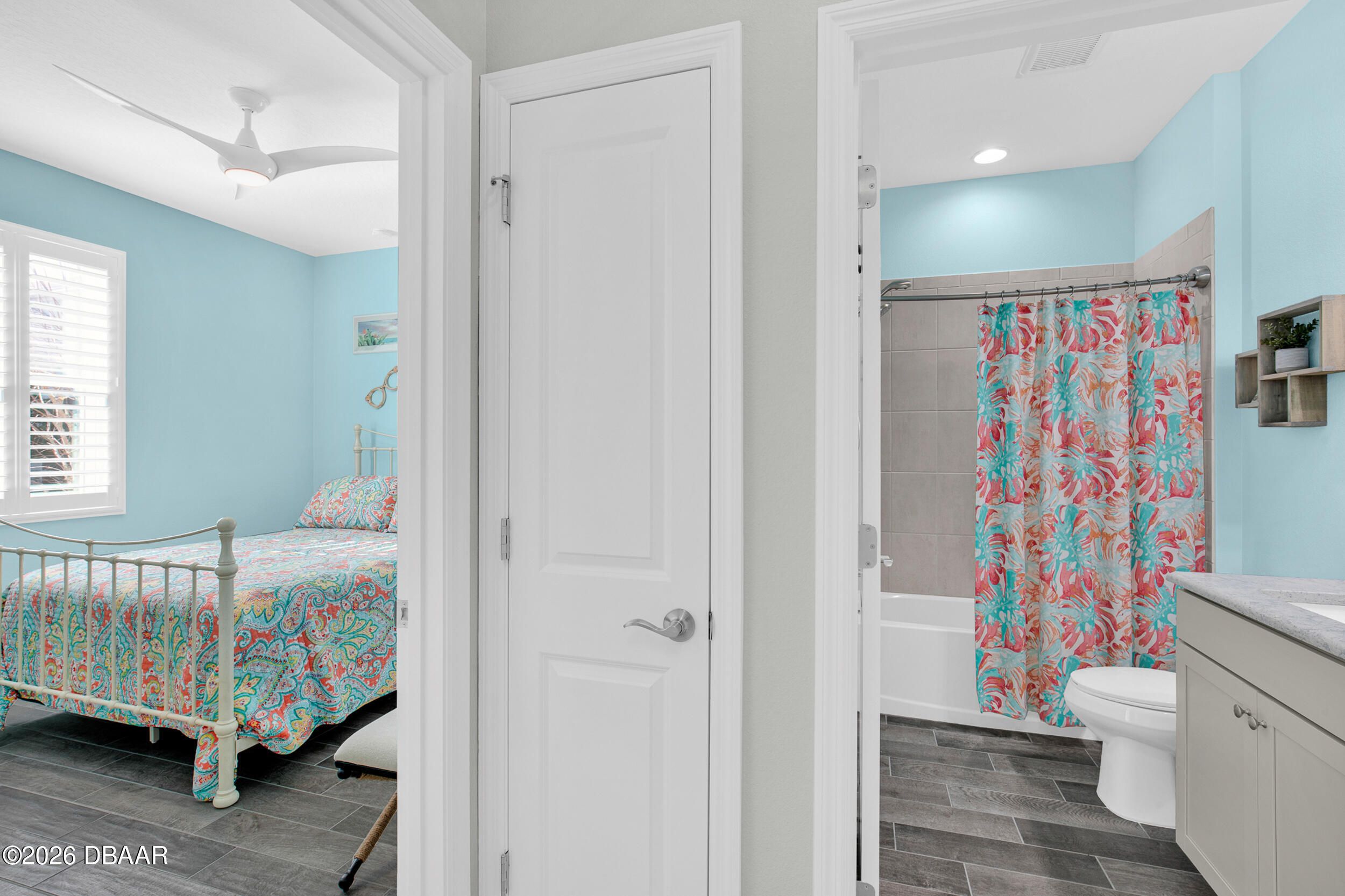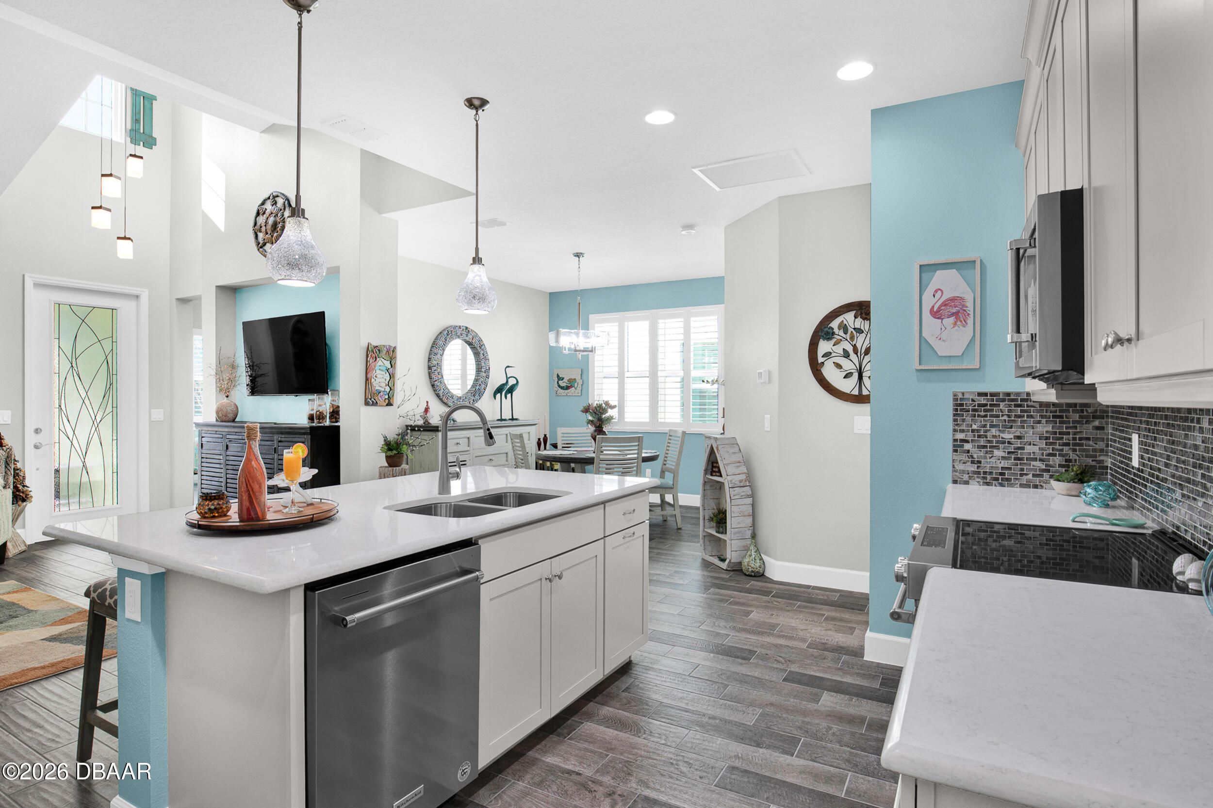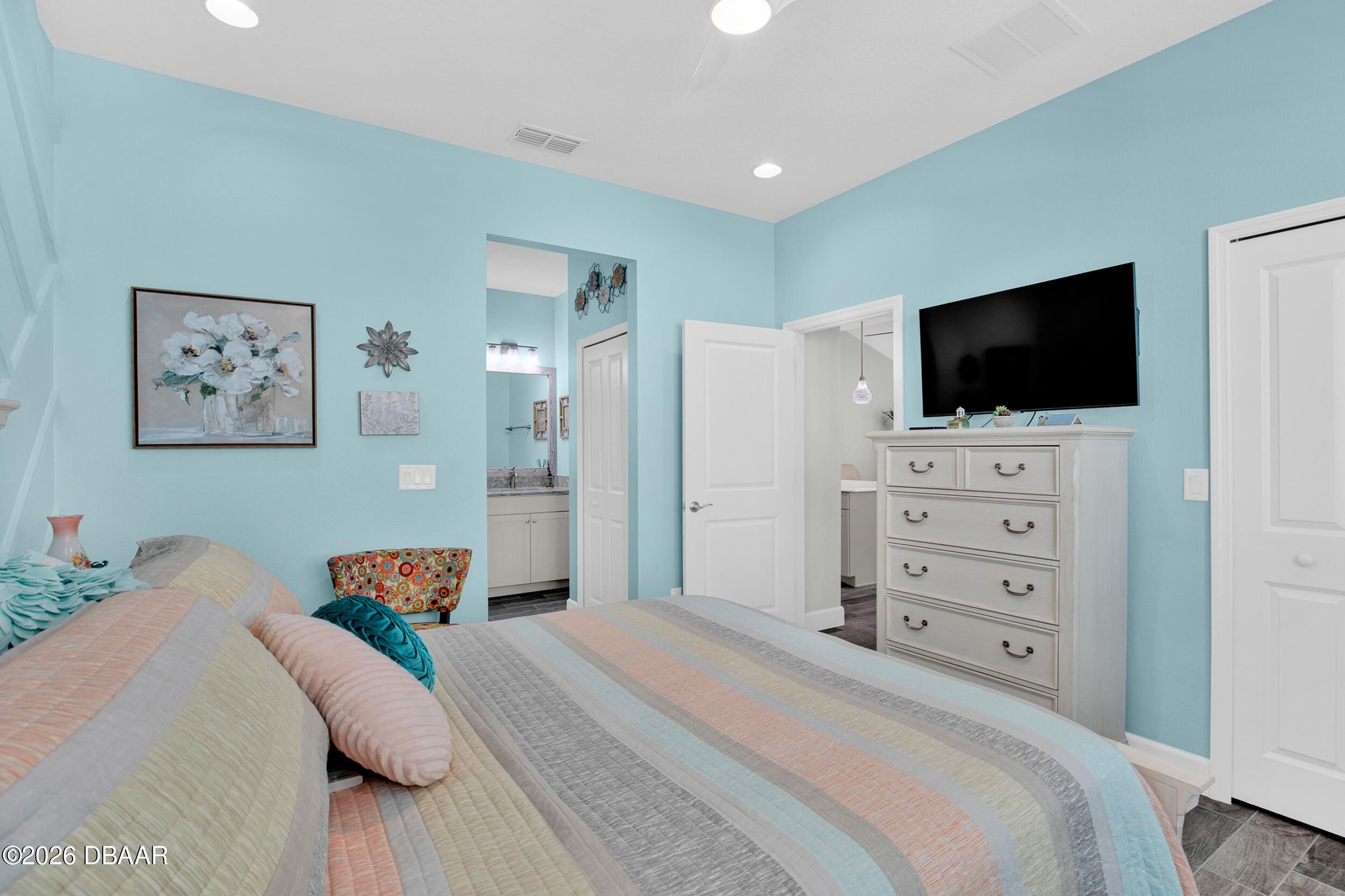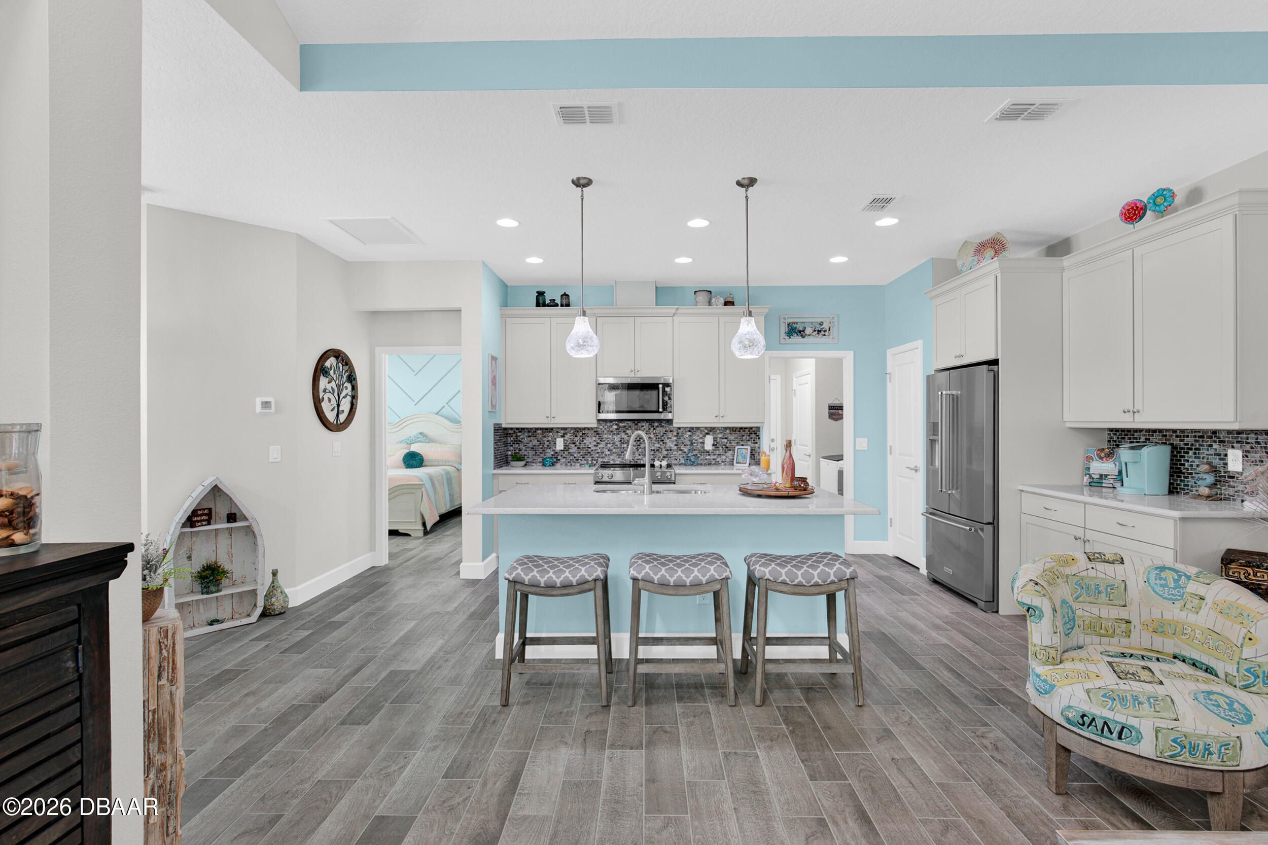Beautiful Turn-Key Camellia Cottage offering 2 bedrooms, 2 baths , 2 car garage. Home is move in ready & literally just bring your sunscreen & toothbrush. A screened front porch welcomes you inside to plank tile flooring throughout & designer foyer chandelier. The decorative glass front door features a natural, free‑flowing design. The kitchen includes quartz counters, glass tile backsplash, KitchenAid appliances, glass island pendants & plantation shutters on all windows. The primary bedroom showcases a custom wood accent wall & custom paint, w/ ensuite bath featuring quartz counters, frameless walk‑in shower door, & double shower heads. The second bath mirrors the primary with quartz counters, double shower heads, w/ tub. The guest bedroom also features custom paint. Additional upgrades include designer fans in all rooms, garage epoxy flooring & ICON golf cart included. A vibrant lineup of amenities includes pickleball, bocce ball, tennis courts, fitness center b& so much more.