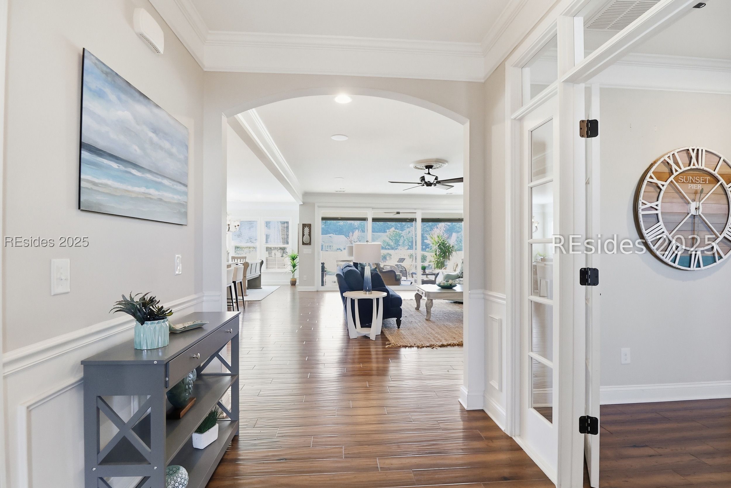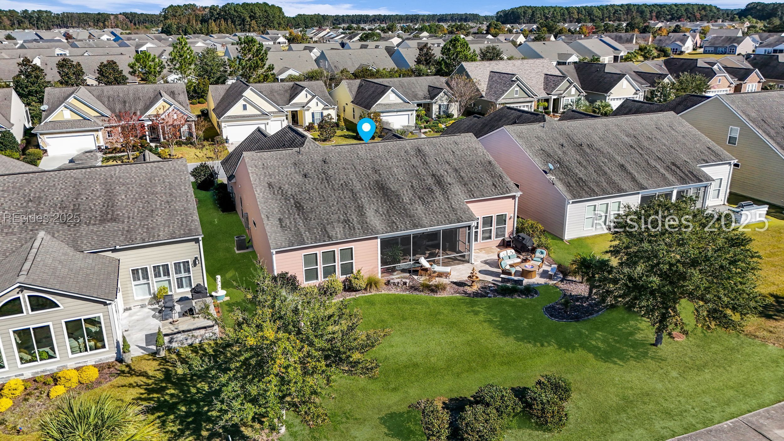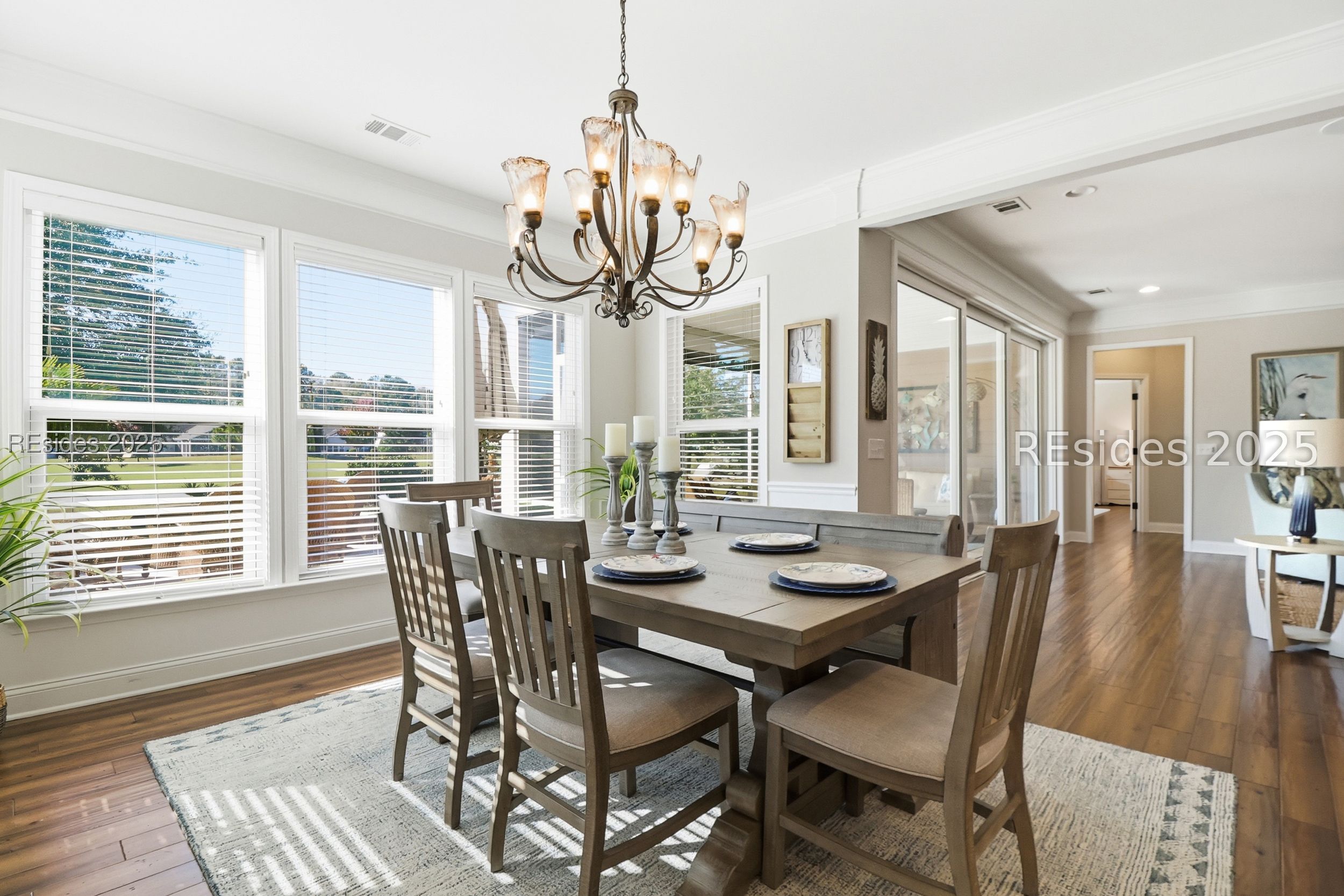 Located in the heart of Sun City Hilton Head, this stunning Dunwoody Way model sits directly on the Argent Lakes Golf Course, offering sweeping fairway views and the relaxed elegance of Lowcountry living. This highly sought-after floor plan features 3 bedrooms, 3 full baths, and a versatile flex/office space-perfect for guests or a quiet retreat. From the moment you enter, you're greeted by an open-concept design that flows effortlessly from the front foyer through the spacious living room and out the oversized patio door to the screened lanai. Large windows frame peaceful golf course vistas, creating a perfect backdrop for entertaining or simply unwinding. Outside you will find a sprawling patio-an ideal setting to enjoy your morning coffee or savor those serene southern evenings after a day exploring all that Sun City has to offer. The gourmet kitchen is a chef's dream with upgraded stainless steel appliances, a cozy dining nook, and elegant finishes throughout. Fine details such as manufactured hardwood flooring, deep crown moldings, wainscoting in the entry, and French doors with transoms add charm and sophistication. Your primary suite is a private haven with a luxurious en suite bath, super shower, a custom walk-in closet, and tranquil backyard views that greet you each morning. For added convenience, the garage features an epoxy floor, golf cart/extra-attached bay, and a full stairway walk-up attic providing ample storage space. Living in Sun City Hilton Head means embracing a vibrant, active lifestyle-with over 150 clubs and social groups, three golf courses, pickleball and tennis courts, fitness centers, and indoor and outdoor resort-style pools. Plus, enjoy easy access to the brand-new, multi-million-dollar amenity center coming soon! Discover why southern hospitality and resort-style living come together perfectly in this exceptional Sun City home.
