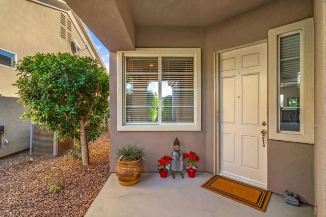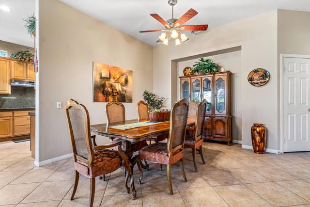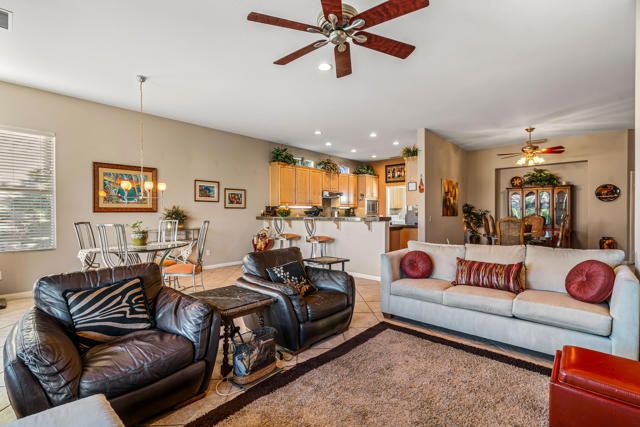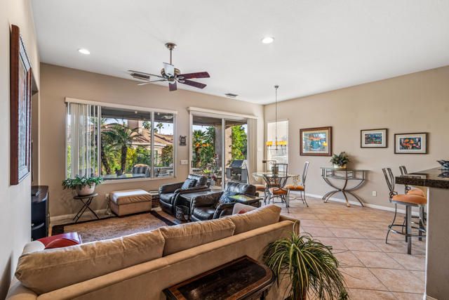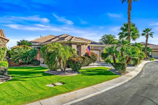 Popular Newport III model offering 1,917 sq. ft. with 2 bedrooms, 2 bathrooms, plus a den/office, ideally located on a quiet interior cul-de-sac. This open-concept floor plan features recessed lighting and ceiling fans throughout. The open gourmet kitchen is appointed with granite tile countertops, all stainless steel appliances and flows seamlessly into OPEN GREAT ROOM and dining area.. Spacious primary suite includes a walk-in closet, separate soaking tub and shower, and French door access to the patio. Private guest bedroom with ensuite bath provides excellent separation. Carpeted bedrooms with tile flooring throughout the main living areas. Enjoy outdoor living with a private pebble-tec swimming pool and spa, surrounded by mature landscaping and citrus trees. Freshly painted exterior with professional landscaping. Additional highlights include a 2-car garage plus separate golf cart garage and a newer HVAC system. Heritage Palms is an active 55+ gated community w/24-hour security & is centrally located. NO INITIATION FEE and we own the golf course. Enjoy the 18-hole championship golf course, newly updated clubhouse, restaurant & lounge, fitness center, lighted tennis, pickle-ball courts & indoor and outdoor pool & spa. Many activities & clubs. Low HOA dues & low IID electric rates. Some furnishings including golf cart available for negotiation outside of escrow.