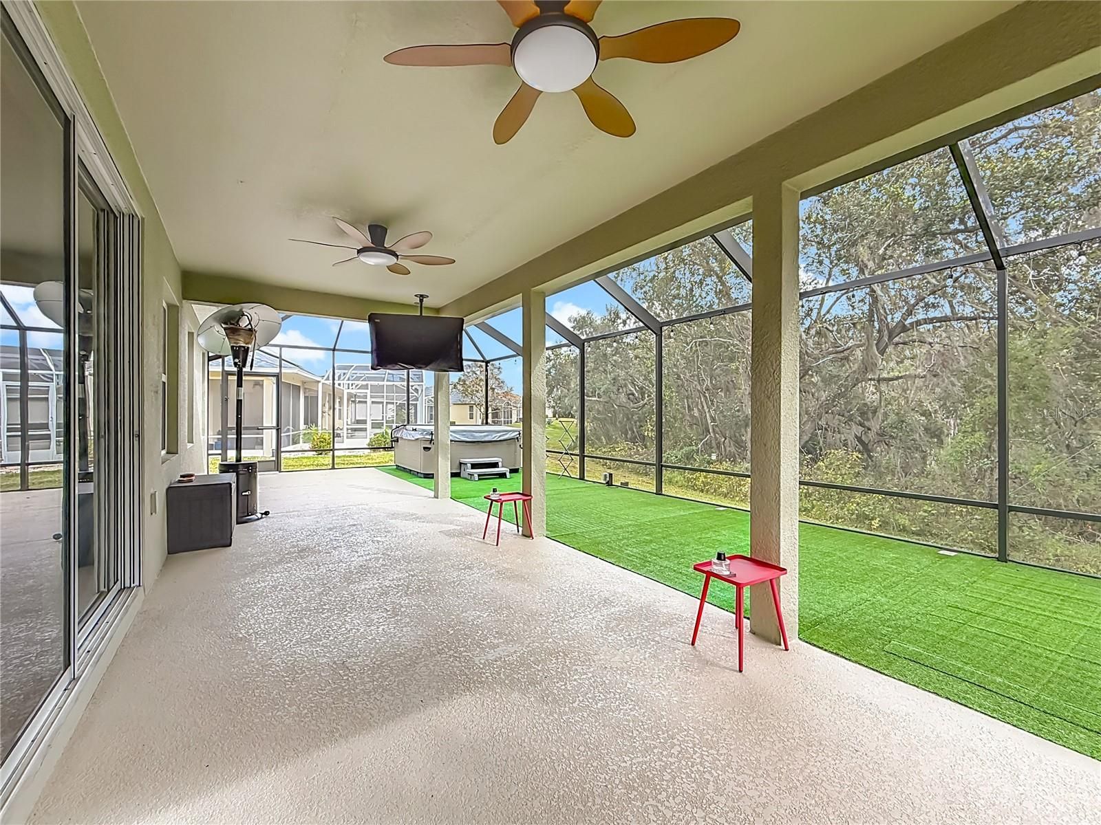 55 PLUS GATED GOLF COMMUNITY! Welcome to your new home... This meticulously maintained three-bedroom two-bath block home is located in an exceptionally well kept gated and guarded golf course community. The home features an open concept design with a detailed eye on the kitchen with its stone counter tops, dual built in ovens including a convection oven, gas range top, built in microwave and a sit-down Island. The cabinets are ample and upgraded from standard there is expansive stone counter space for your cooking pleasure, a stone and tile backsplash and ample outlets! There is tile throughout the open living space, the 18x24 great room has a natural flow to the expanded 20X40 screened and partially covered rear porch which boasts your private spa and ceiling fans. The master suite has tall 9' ceilings with dual walk-in closets. The master bath sports a dual sink vanity with a stone top. There is a private privy and a walk-in shower. The separate laundry/mudroom leading to the two-car garage is well designed and functional. The garage has built in storage racks mounted to the ceiling, and a 220 outlet for your electric car. This home is well optioned and ready to move into.