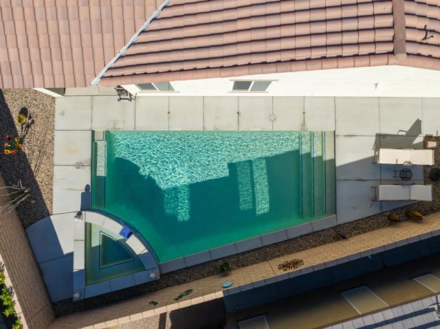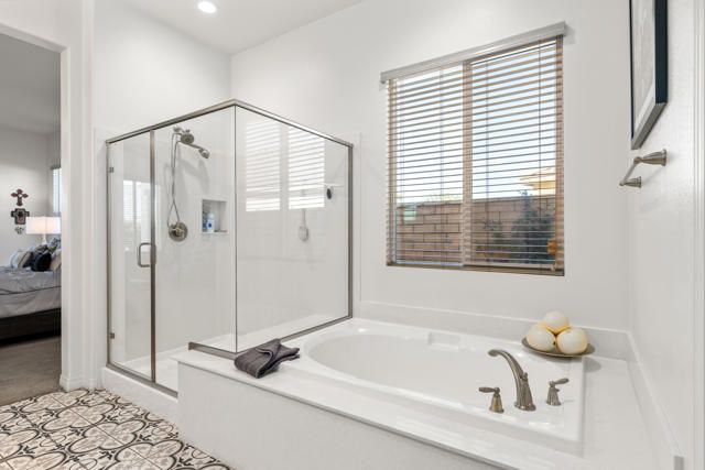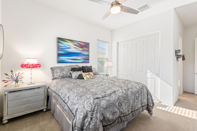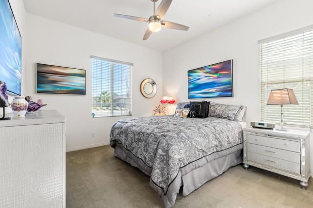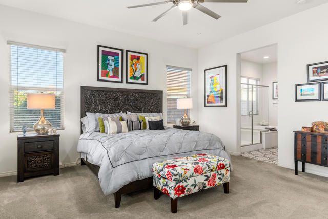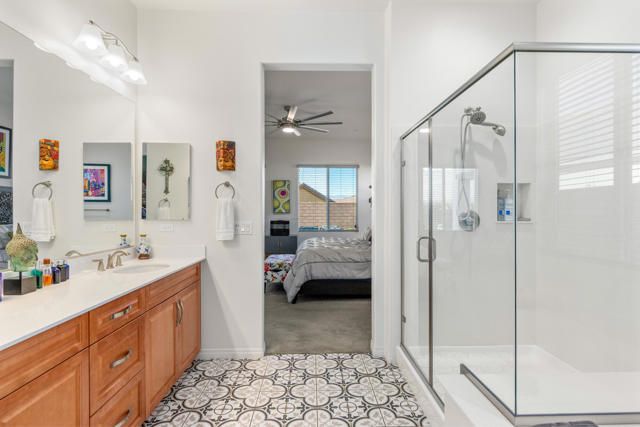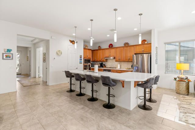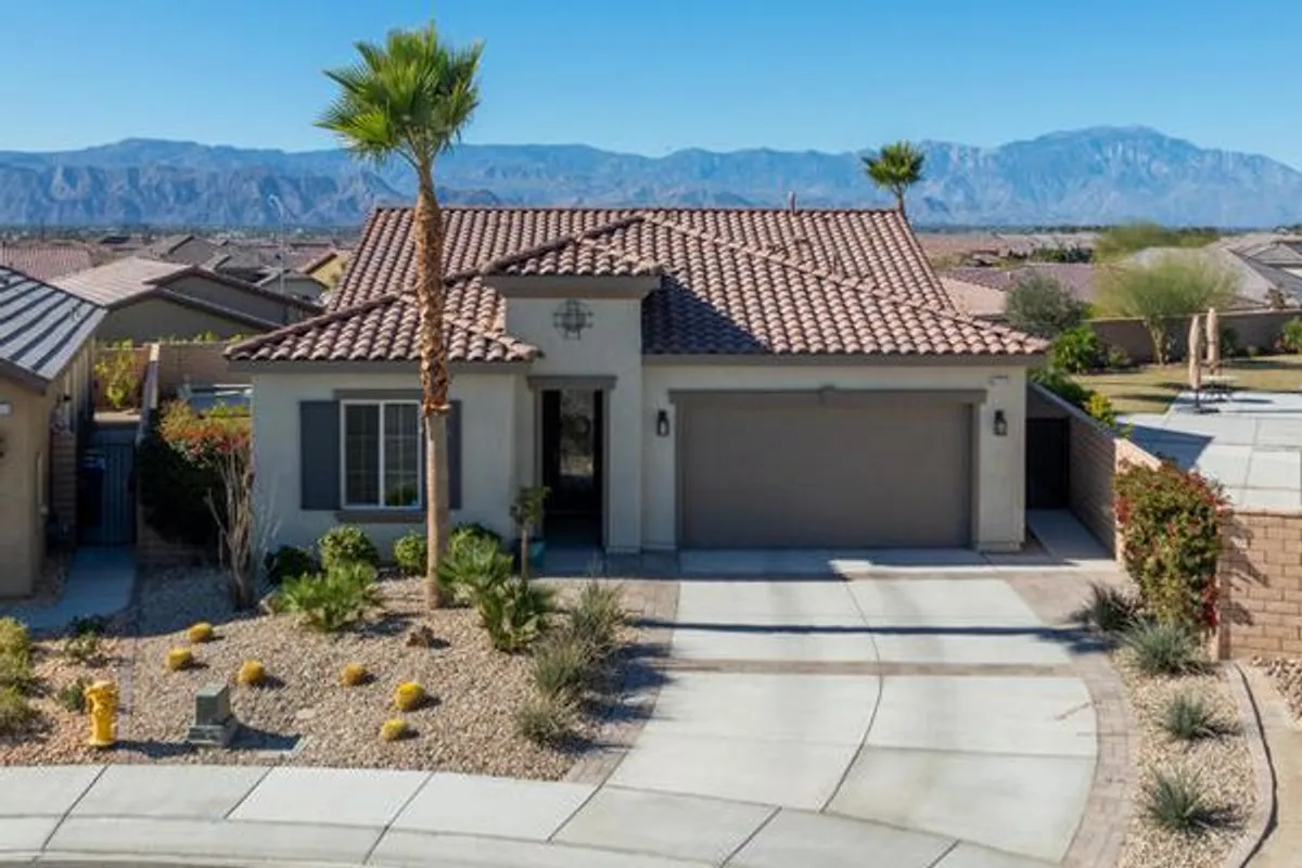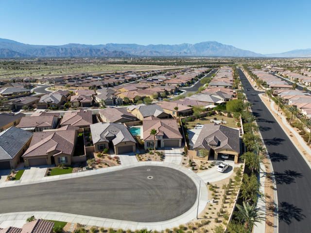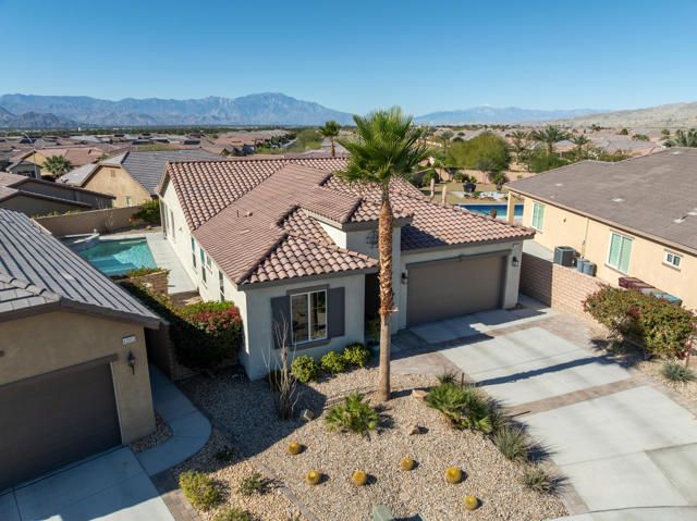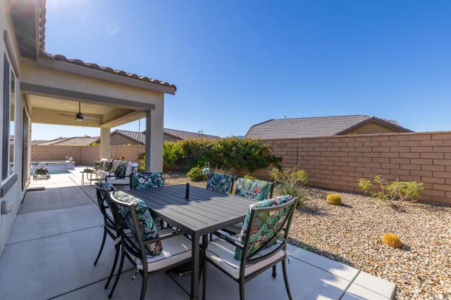 Welcome to this gorgeous Mecca Hills floor plan, showcasing true model-home appeal. Built in 2021 and enhanced with $85,000 in upgrades, this stunning residence offers a spacious open-concept design featuring 2 bedrooms, 3 bathrooms, and a versatile den. The heart of the home is the show-stopping kitchen, boasting chef-inspired appliances, a double oven, generous pantry, designer backsplash, and an oversized quartz island with bar seating and elegant pendant lighting--perfect for both everyday living and entertaining.The living room is highlighted by dramatic 16-foot double sliding glass doors complemented by sleek electric shades, filling the space with natural light while maintaining privacy and comfort. Throughout the home, 10-foot ceilings, recessed lighting, Italian porcelain tile flooring, and custom ceiling fans create a refined and modern ambiance. Smart features include an app-controlled thermostat and wireless alarm system for effortless convenience.The primary suite offers a peaceful retreat with a walk-in closet, oversized shower, and separate soaking tub, while the second bedroom features its own private ensuite bath. A large laundry room provides abundant cabinetry and storage. Step outside to your private backyard oasis featuring a newly built heated PebbleTec(r) pool and spa, with heating and lighting conveniently controlled by an app--ideal for year-round enjoyment.Located within the gated community of Four Seasons at Terra Lago, this home offers more than just beautiful living--it delivers a true resort-style lifestyle. Residents enjoy a 22,000-square-foot state-of-the-art clubhouse featuring a fitness center, ballroom, salon, massage room, indoor lap pool, and outdoor pool with cabanas. Additional amenities include tennis courts, pickleball, basketball, bocce ball, and a vibrant calendar of clubs and social events. 36 hole Championship golf next door, shopping, dining, casino's all within minutes. This is luxury living at its finest.