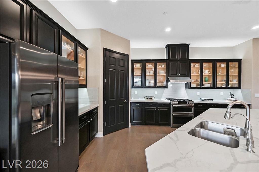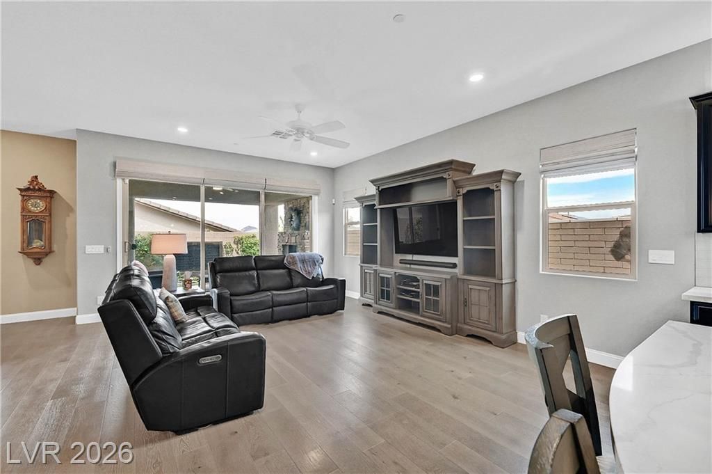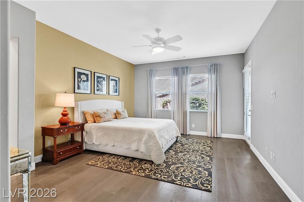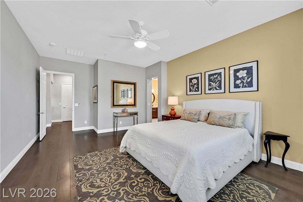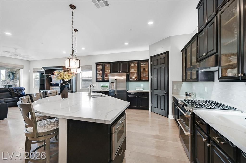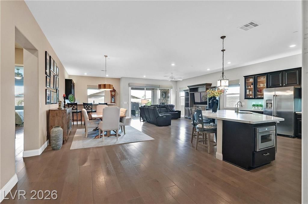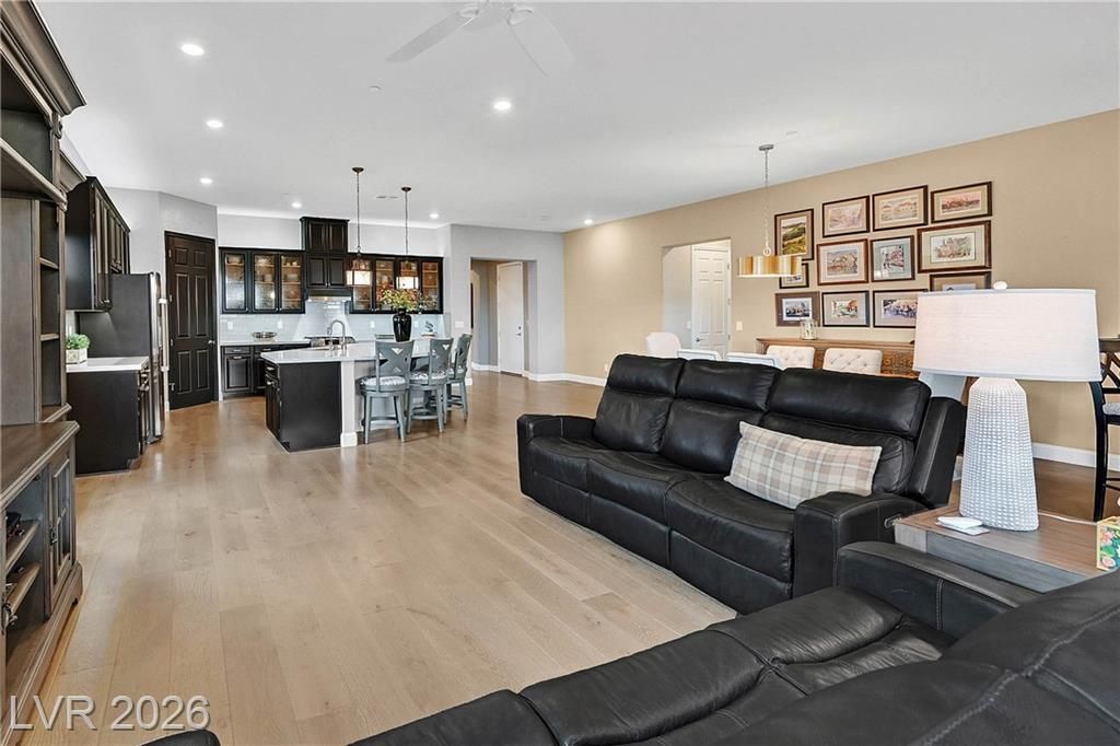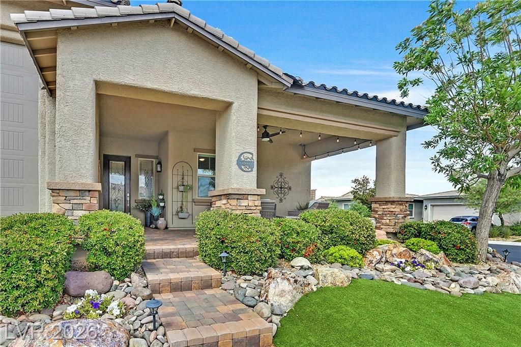 Beautifully upgraded Henderson home at 436 Lake Run Ave! This open-concept floorplan features manufactured hardwood flooring, 6” baseboards, and custom Levelor shades throughout. The kitchen is a showstopper with GE Café appliances, 5-burner double oven, Zephyr hood, Thermador drawer microwave, Carrara-style quartz island, black cabinetry, and full subway tile backsplash. Spacious primary suite fits a Cal-King and offers a luxurious bath with dual showerheads, bench, and large walk-in closet with built-ins. Private guest suite plus office with custom track lighting. Laundry room includes ample cabinetry, quartz counters, and utility sink. Enjoy a fully landscaped backyard with artificial turf, pavers, drought-tolerant landscaping, and custom water feature. Stone-wrapped fireplace, front columns, and hardwired landscape lighting. Built in 2019 with smart home features including Ring doorbell and ADT wiring. Move-in ready, highly desirable Henderson location near parks and shopping.